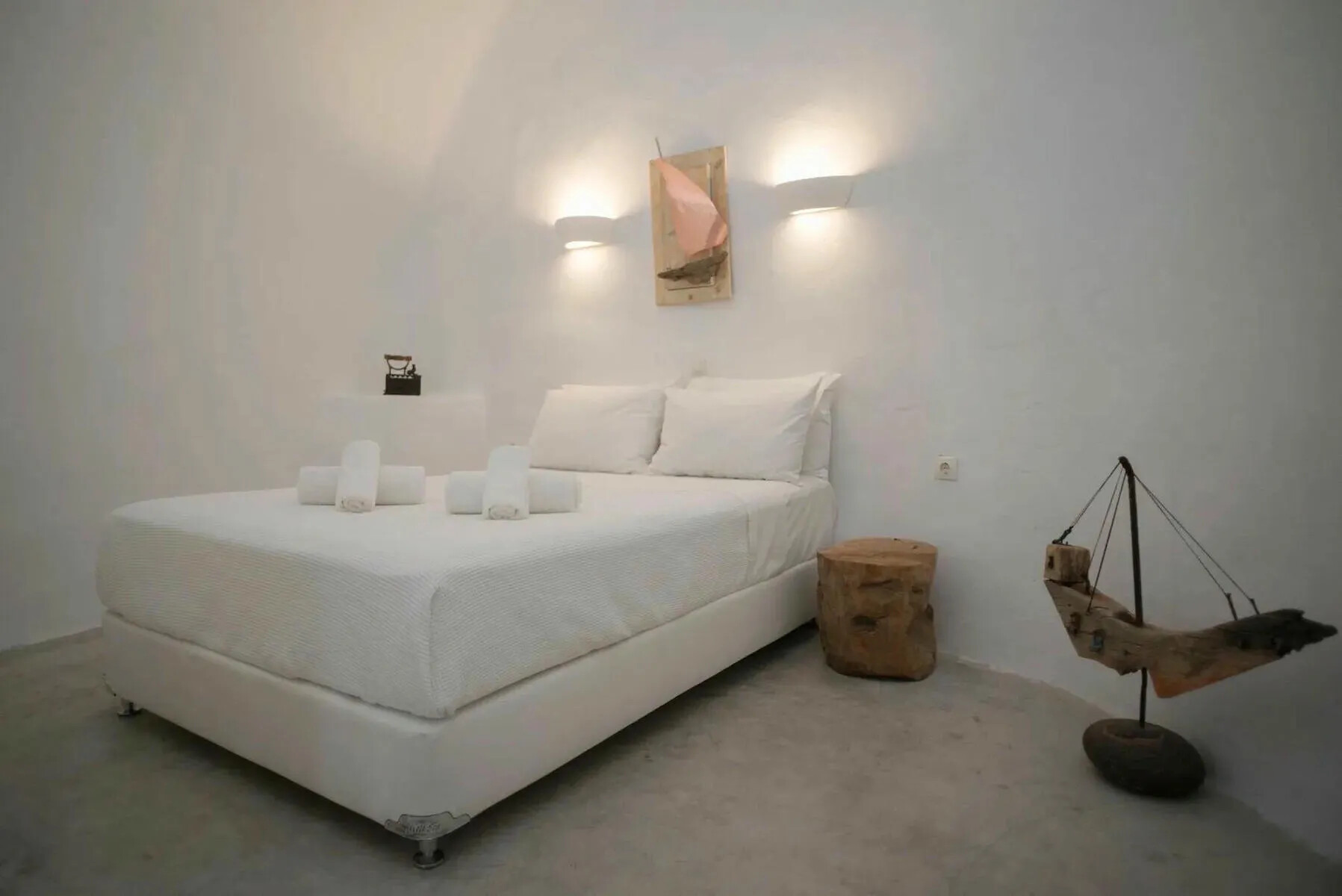 The property is surrounded by an expansive courtyard and a beautifully landscaped garden, creating an inviting environment for outdoor dining, lounging, or entertaining. The traditional architecture blends seamlessly with the Cycladic setting, making it a standout in the area.