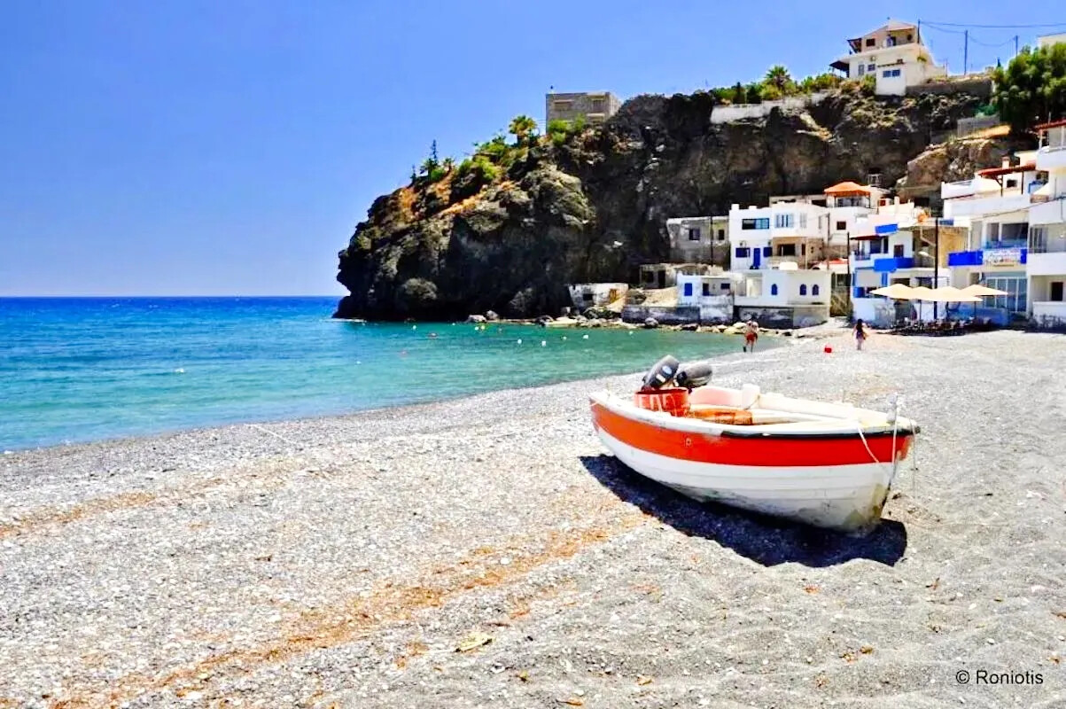 Tris Eklisies is a coastal settlement located approximately 64 km south of Heraklion, at the end of the Aba gorge, behind the imposing Asterousia mountains. The village is accessed via a scenic 12-kilometer asphalt road from the settlements of Haraka and Paranymfoi.