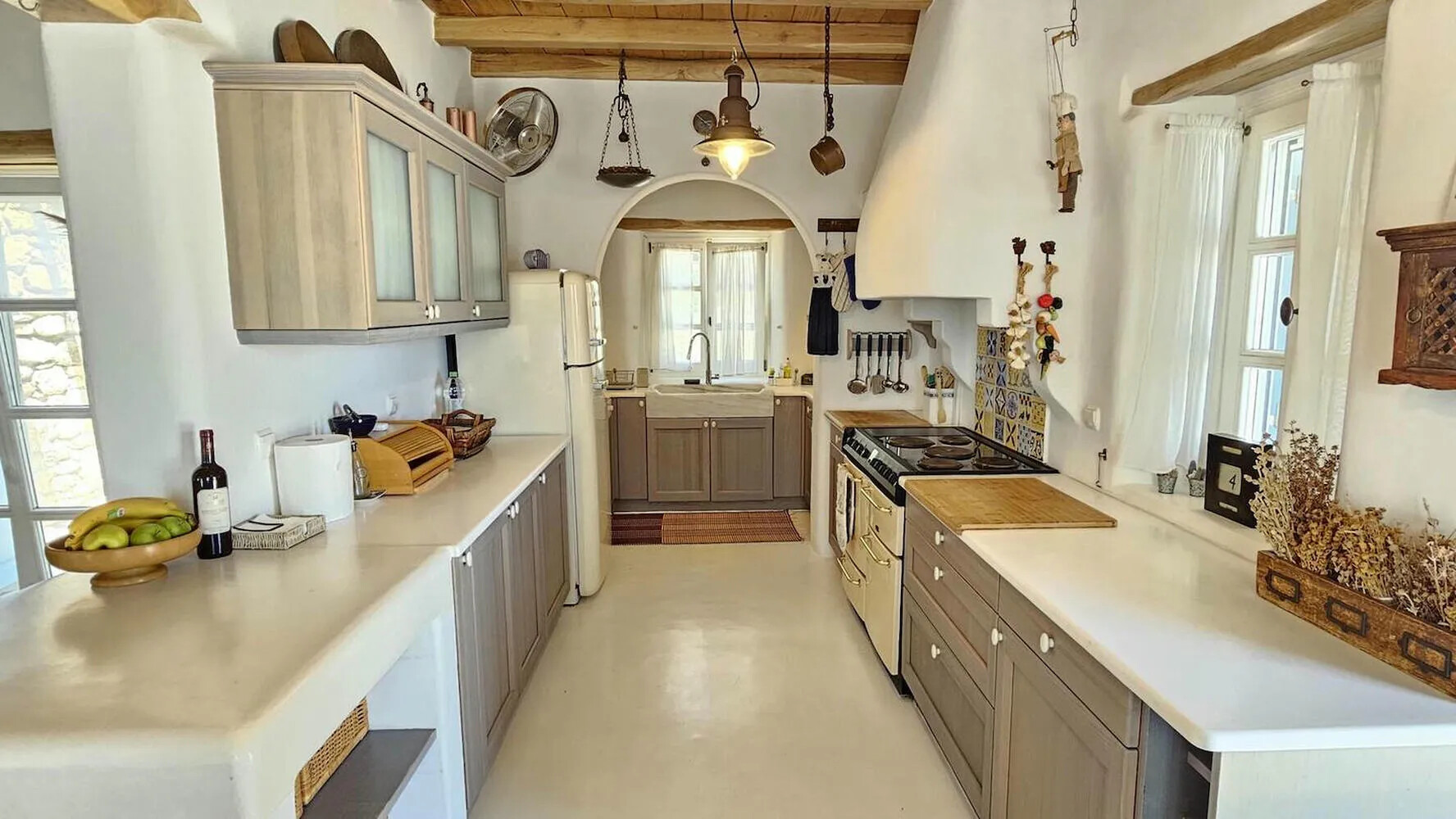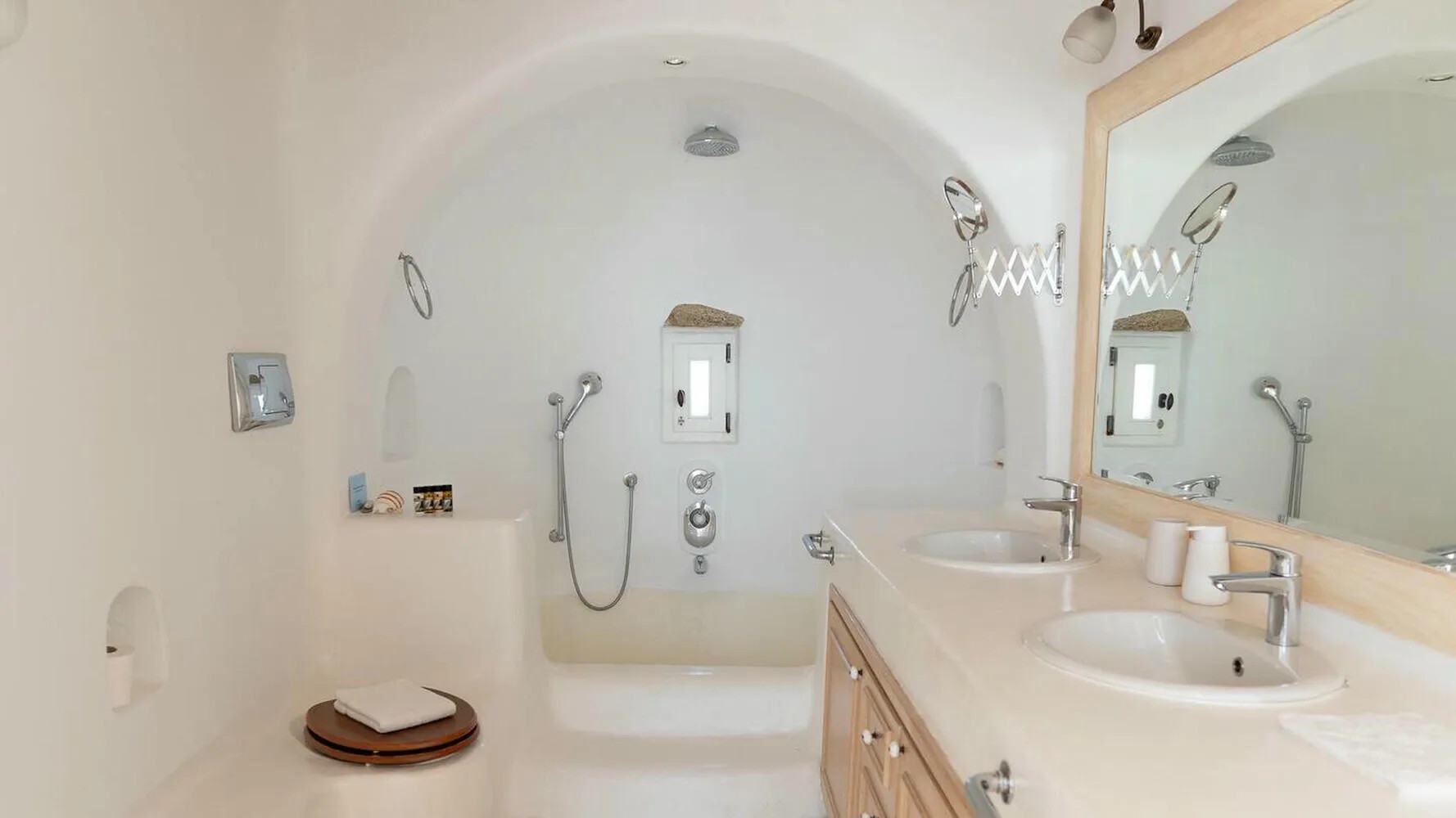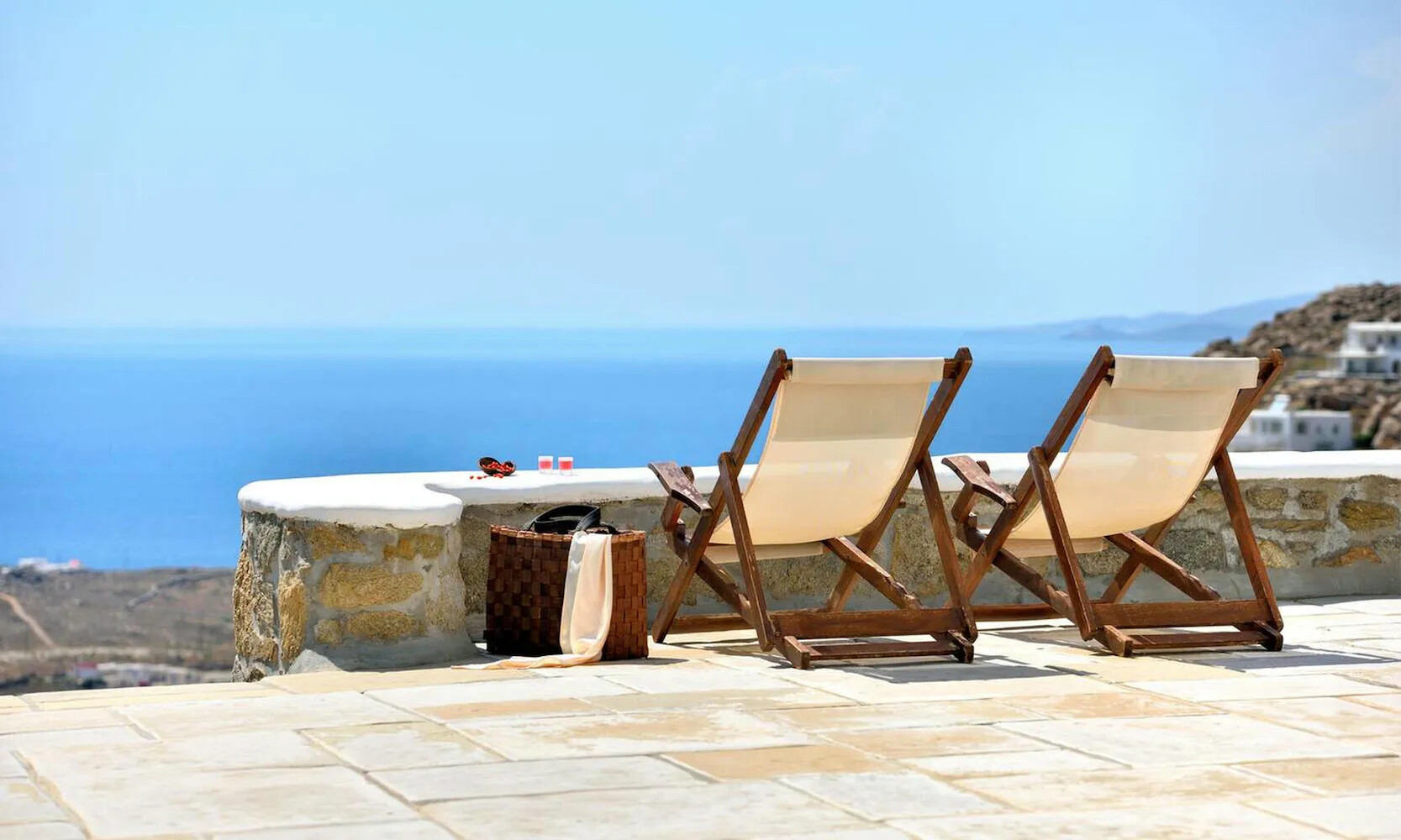 The villa’s outdoor areas are truly spectacular. A stunning infinity pool overlooks the Aegean Sea, surrounded by a spacious terrace ideal for lounging and alfresco dining. The outdoor kitchen and dining area are perfect for hosting unforgettable gatherings, while multiple terraces provide various spots to unwind and enjoy the natural beauty of the rocky landscape.