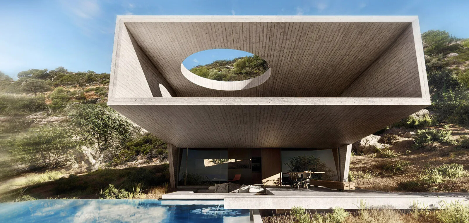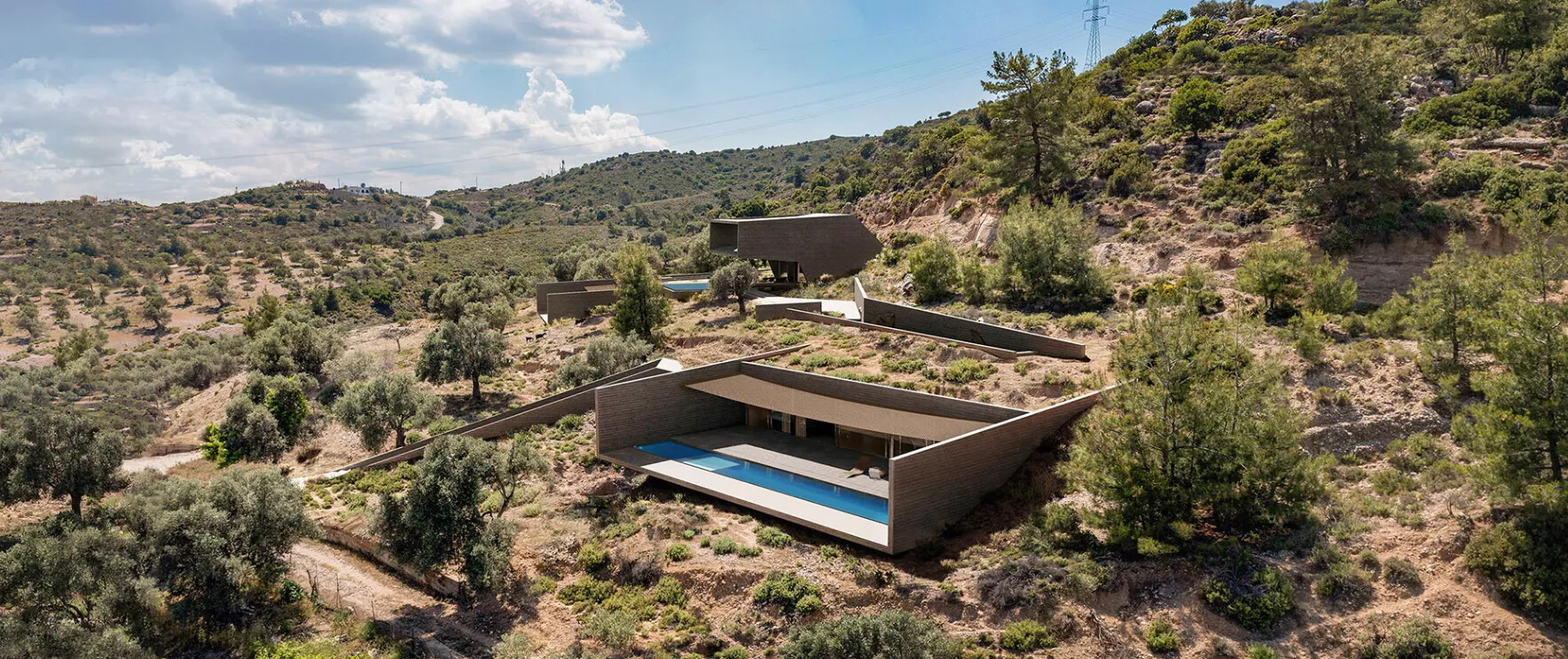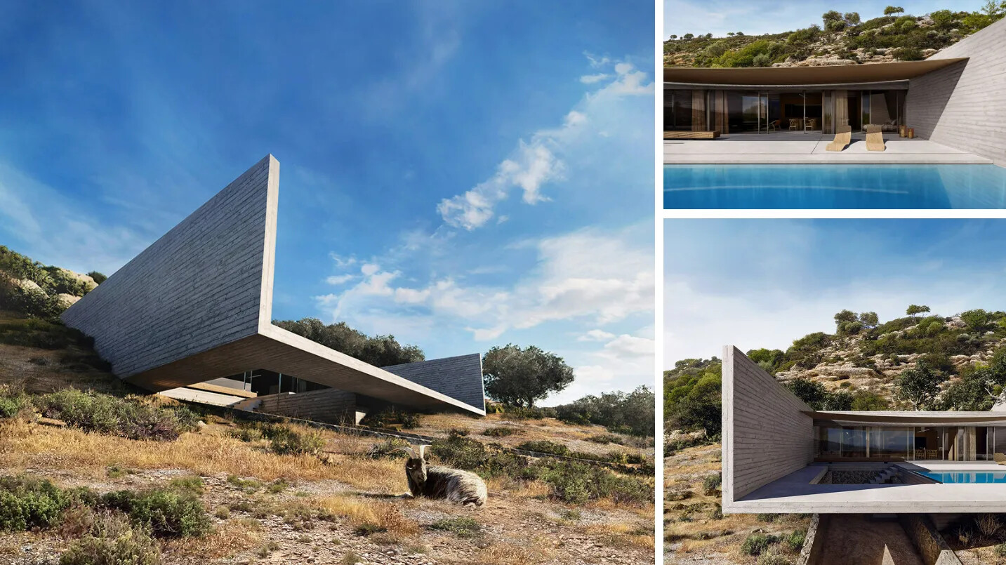 - Residence B (Featured Home): Positioned at the foot of the hill, defined by two angular concrete walls forming an artificial rock-like structure that rises toward the sea