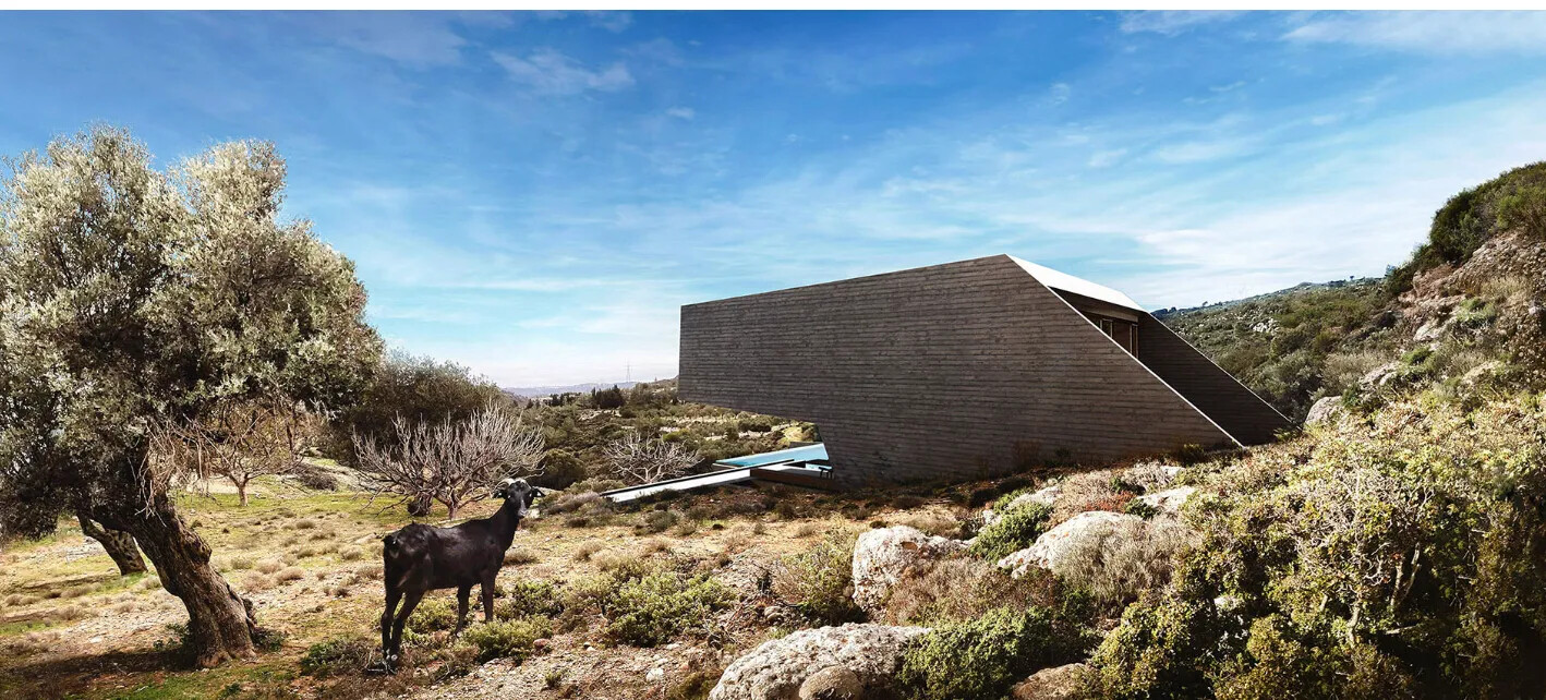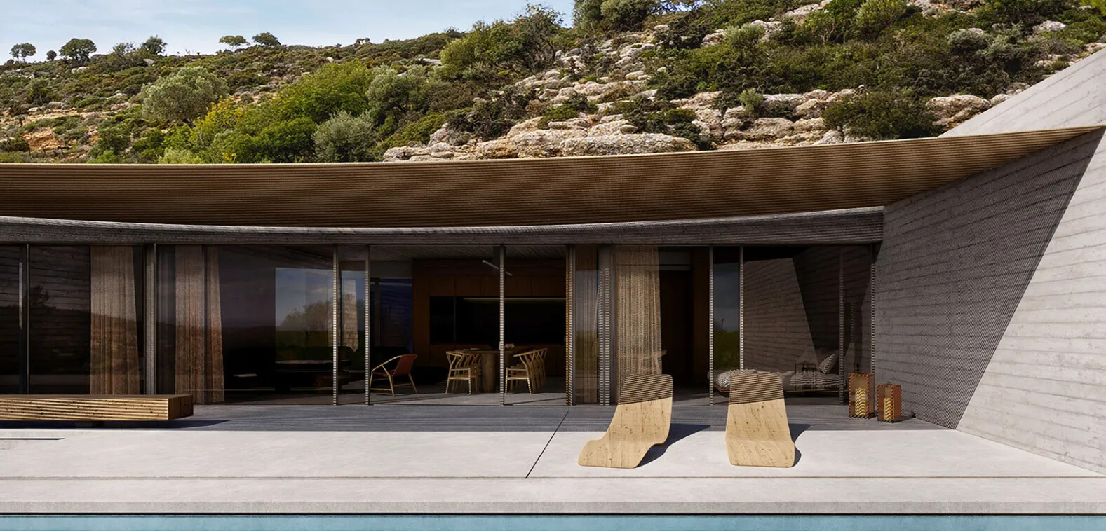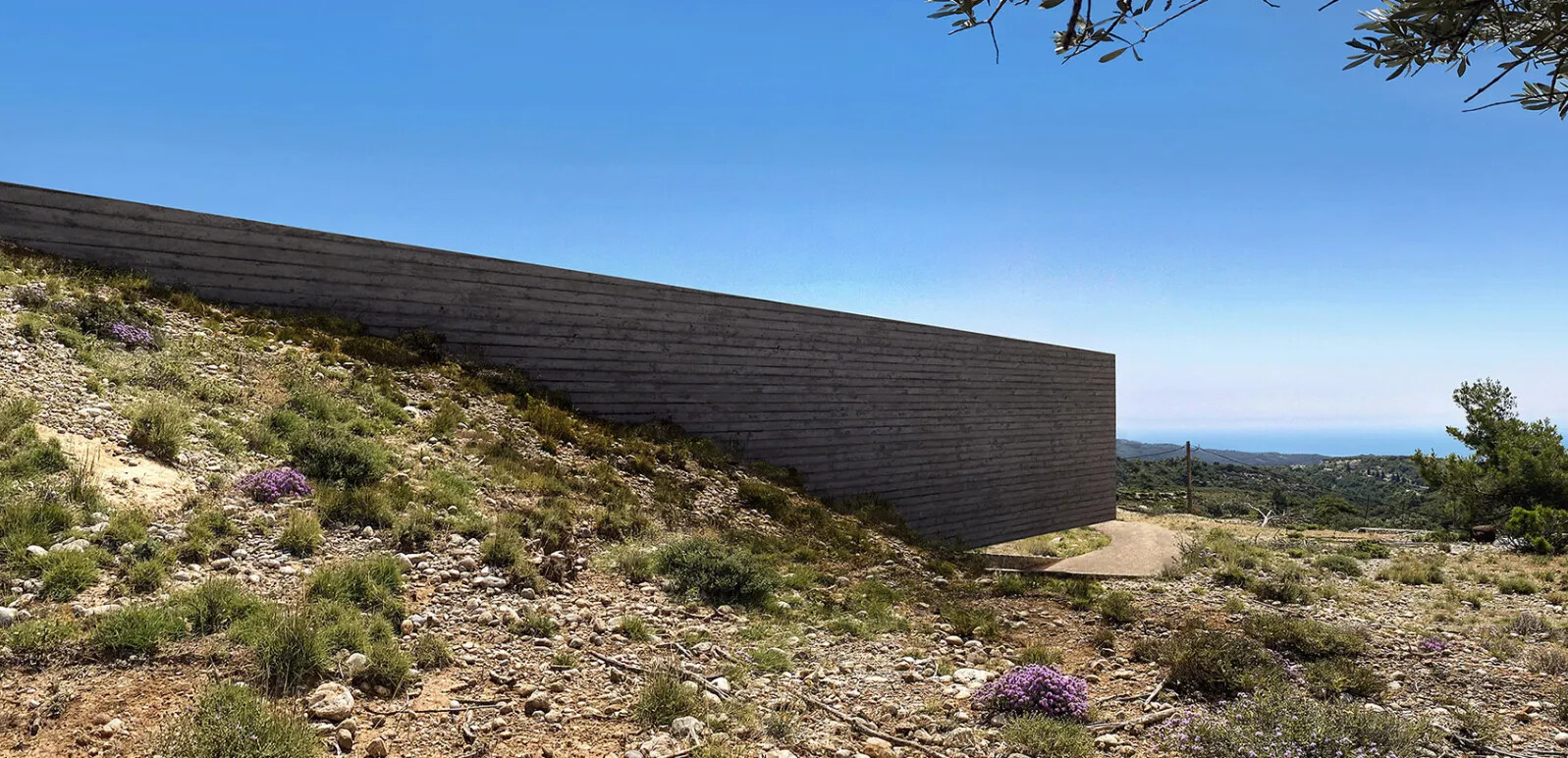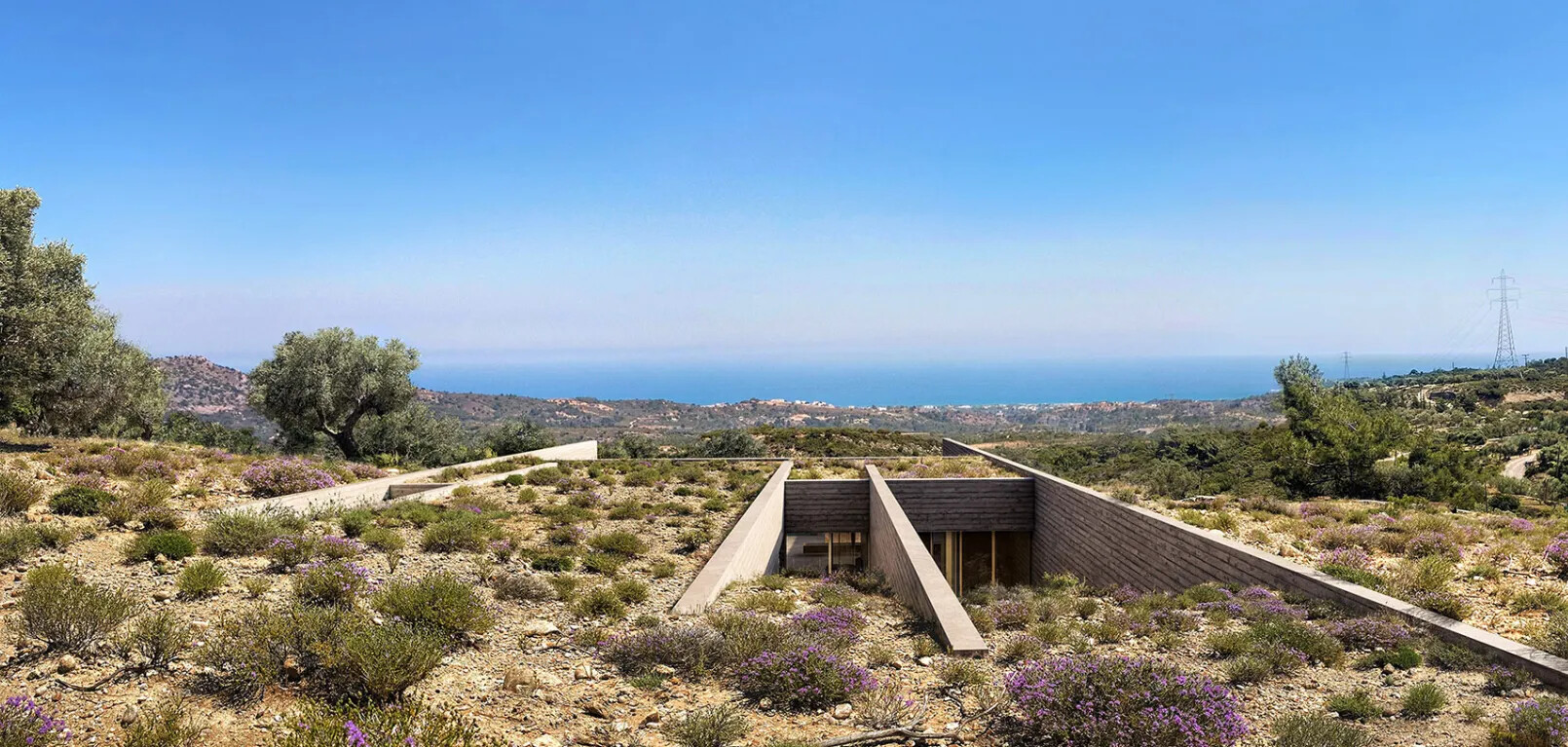 - Residence B (Featured Home): Positioned at the foot of the hill, defined by two angular concrete walls forming an artificial rock-like structure that rises toward the sea