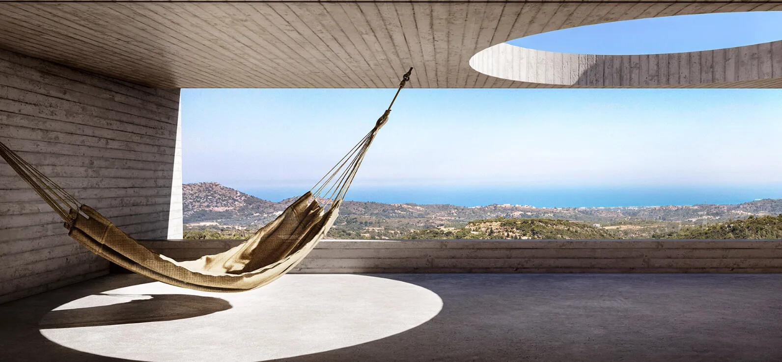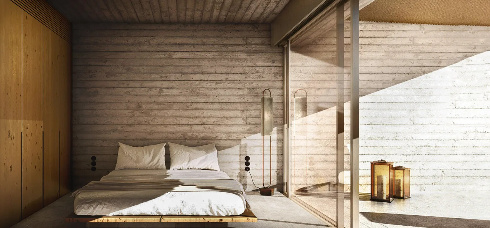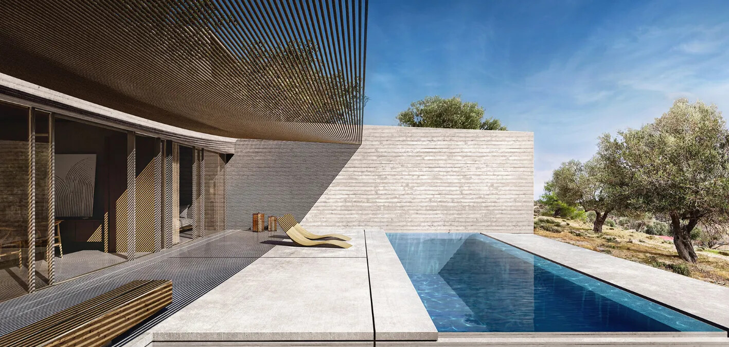 - Residence A and C: Sculpted into the land, marked by exposed concrete retaining walls and light-shading mesh structures