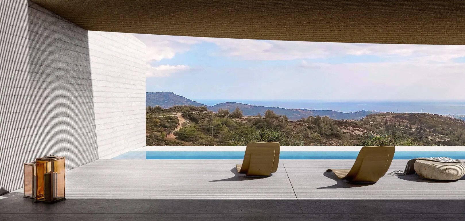 Three residences, including the featured Architectural Home for sale in Rhodes, follow the topographical flow of the hillside. They curve organically with the terrain, descending gradually toward panoramic sea views.
