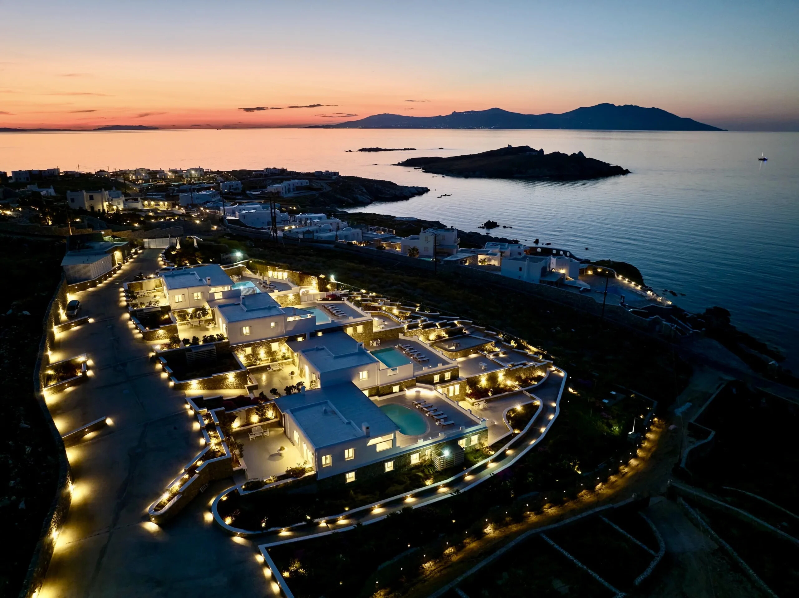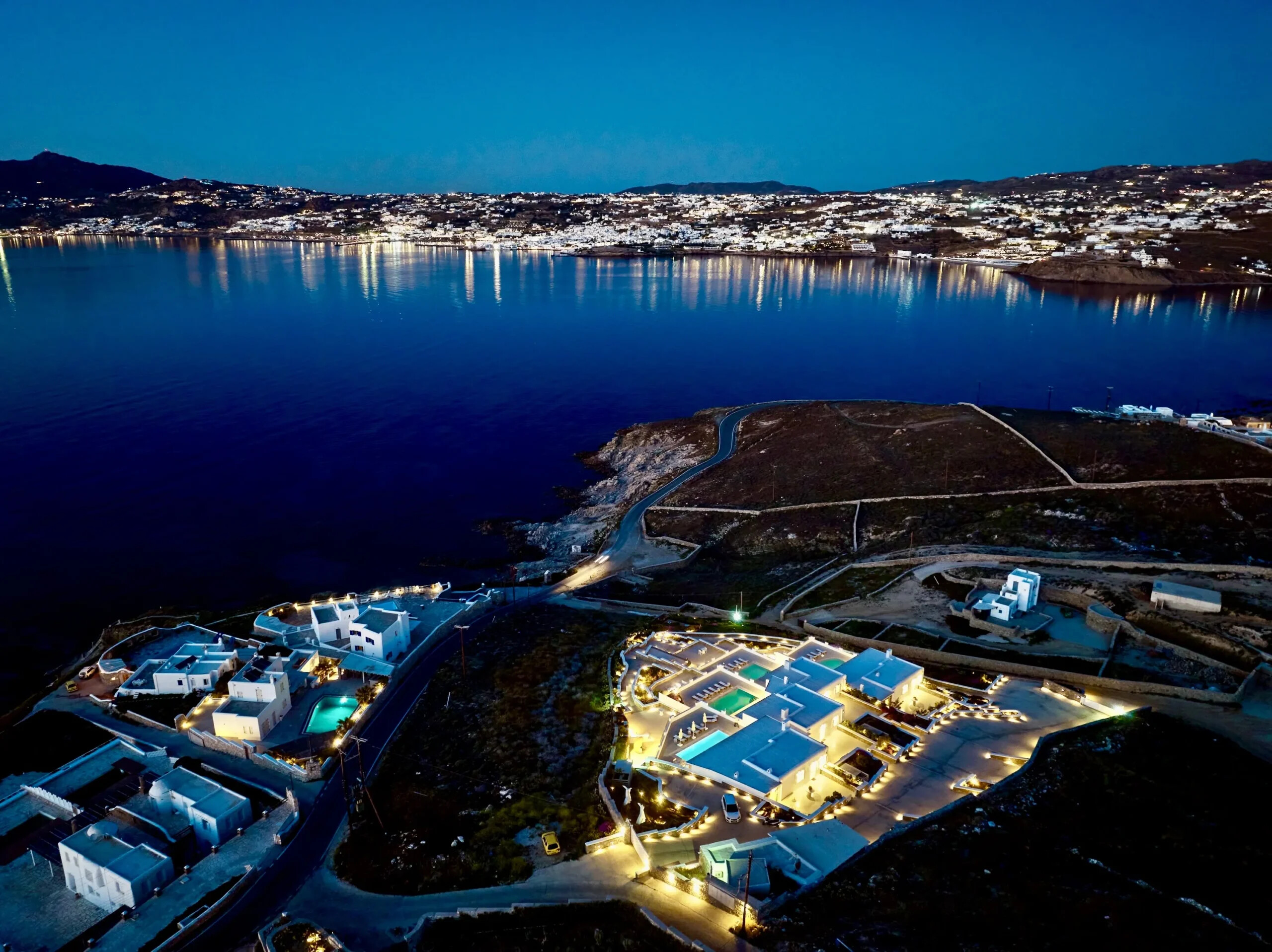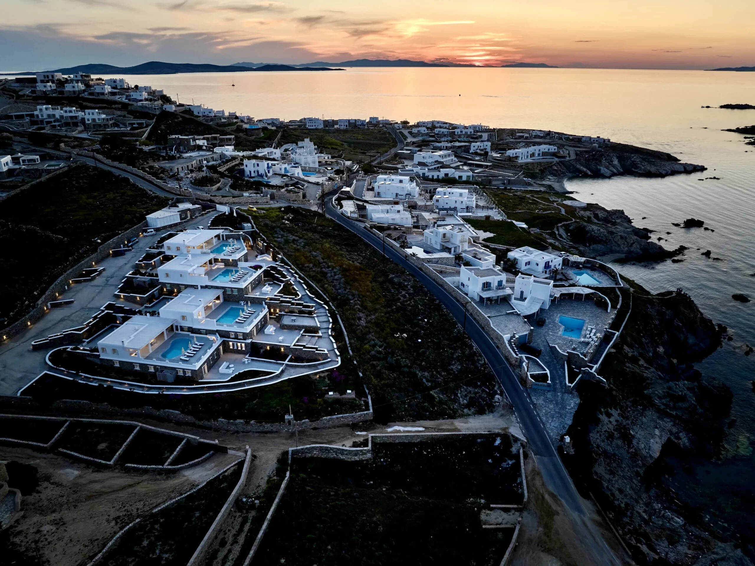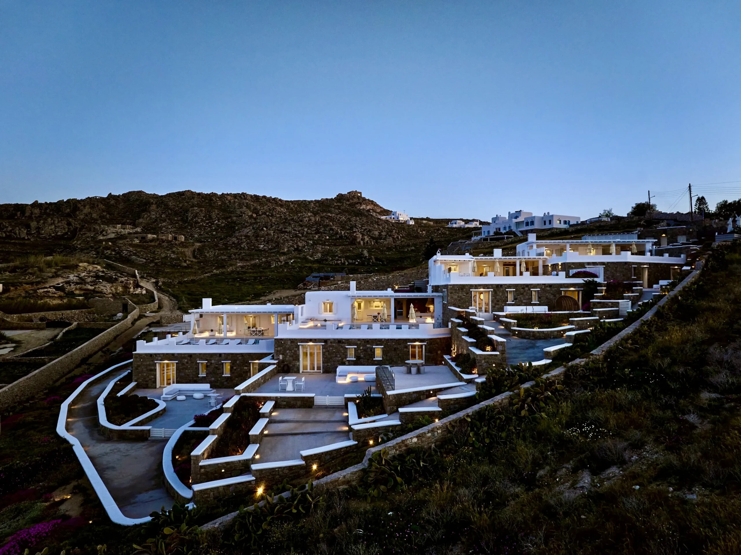 Each of the four villas within this exquisite estate is designed to offer breathtaking views of the Aegean Sea and the charming Mykonos Town. The complex provides an elegant blend of traditional Cycladic architecture and modern luxury, ensuring an outstanding living experience.