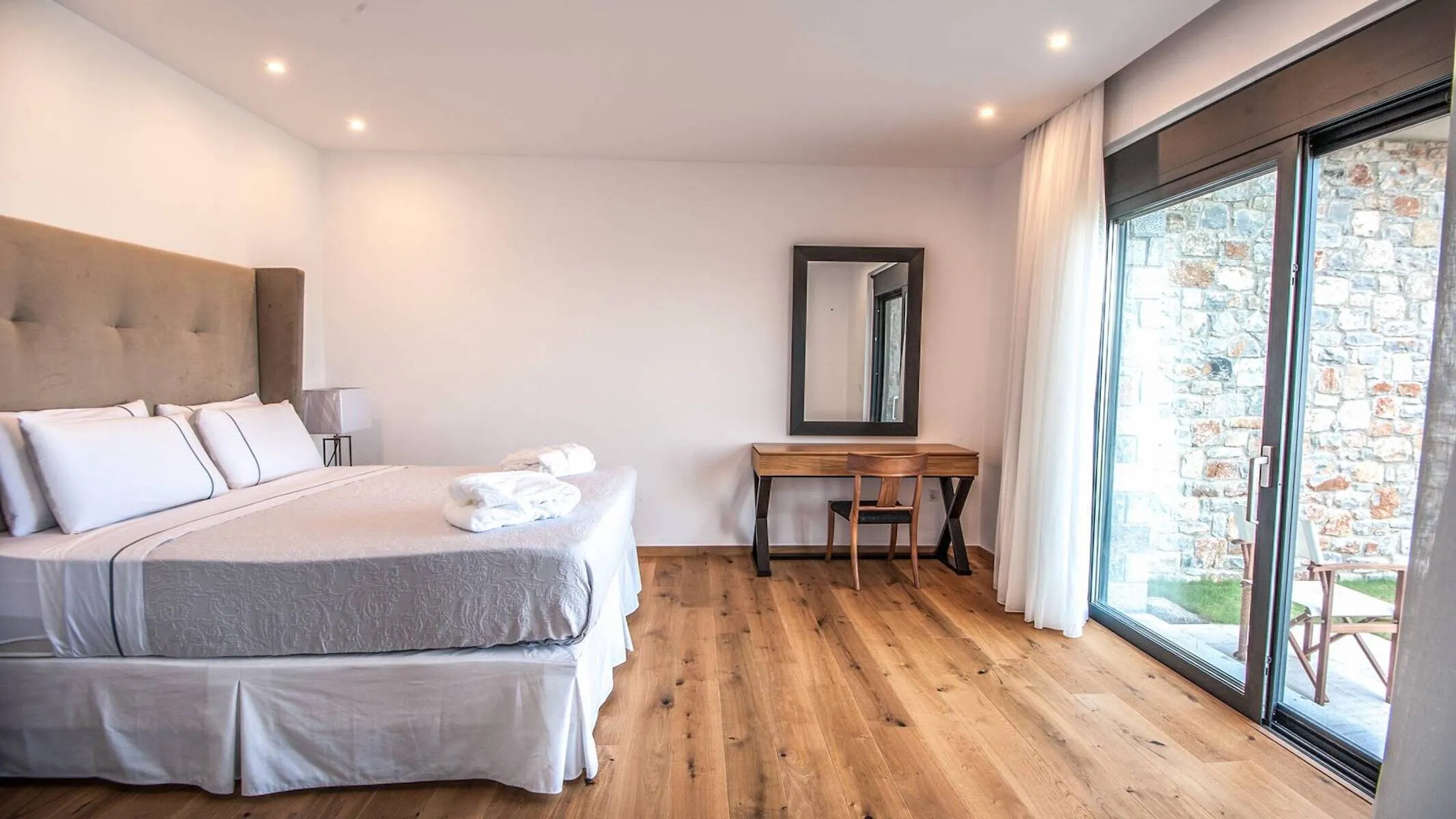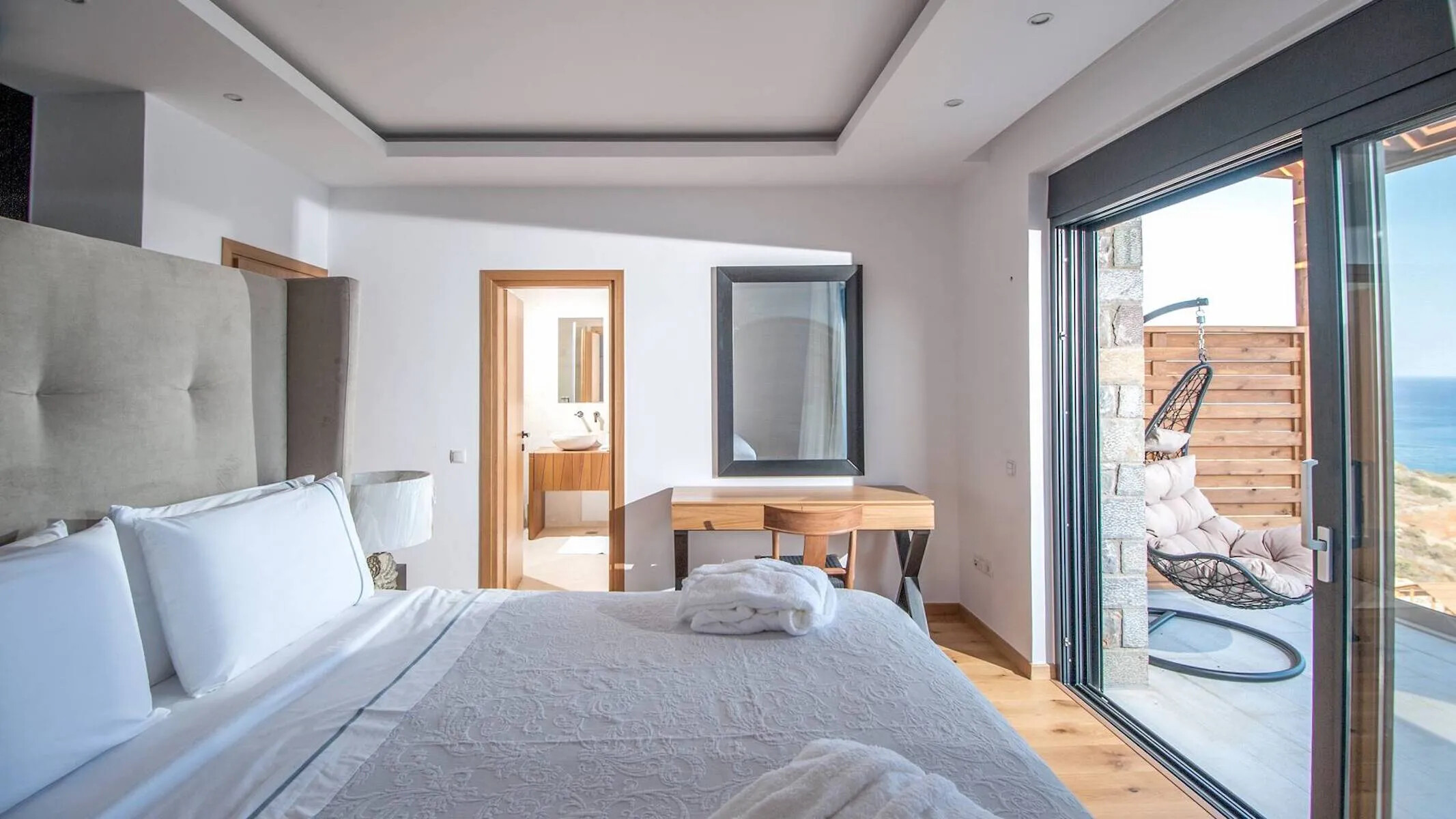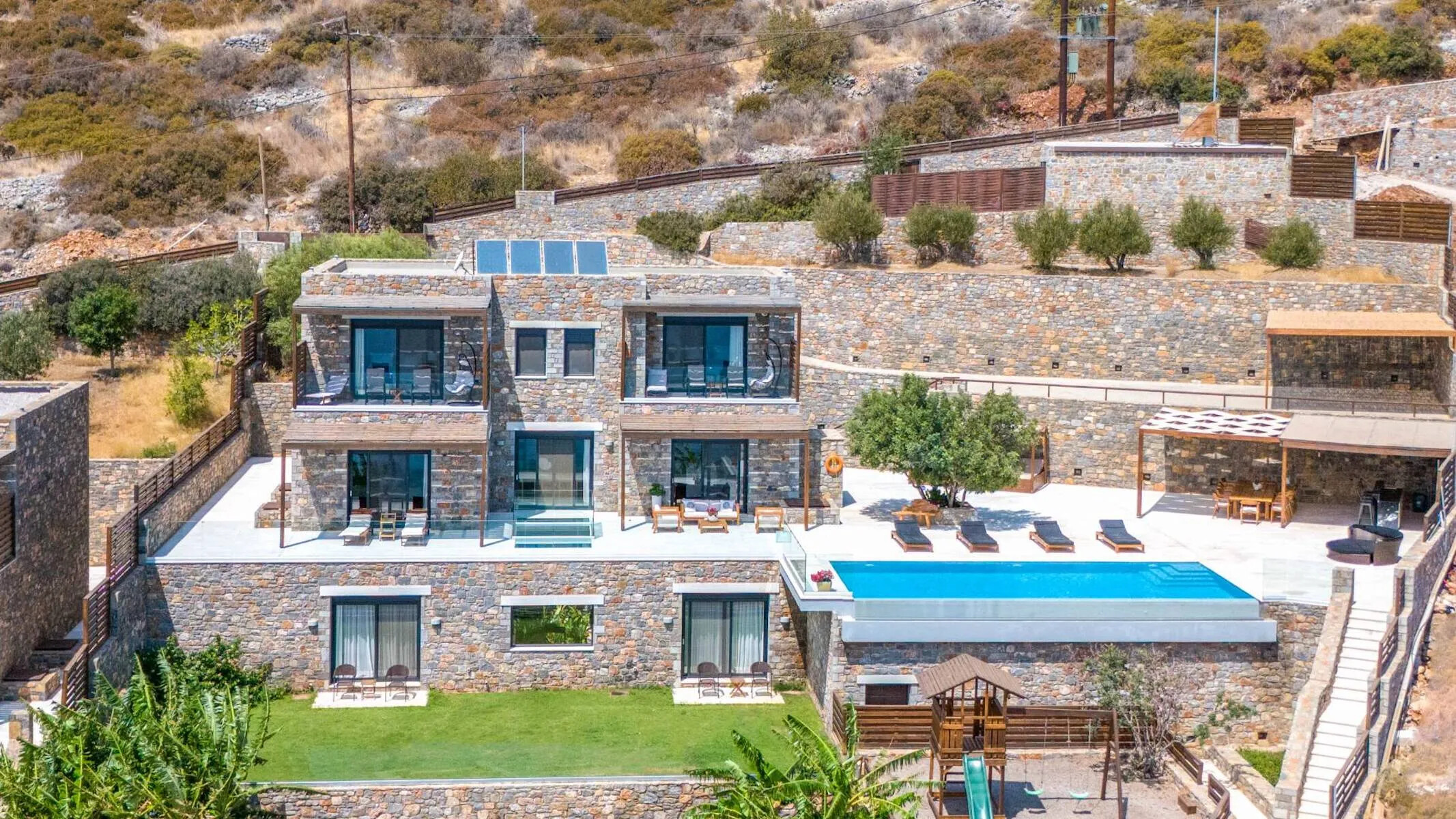 The villa showcases traditional Cretan architecture with modern interpretation—whitewashed walls, gray stone façades, and clean, cubic forms. Interiors are spacious, filled with light, and finished to the highest standards.