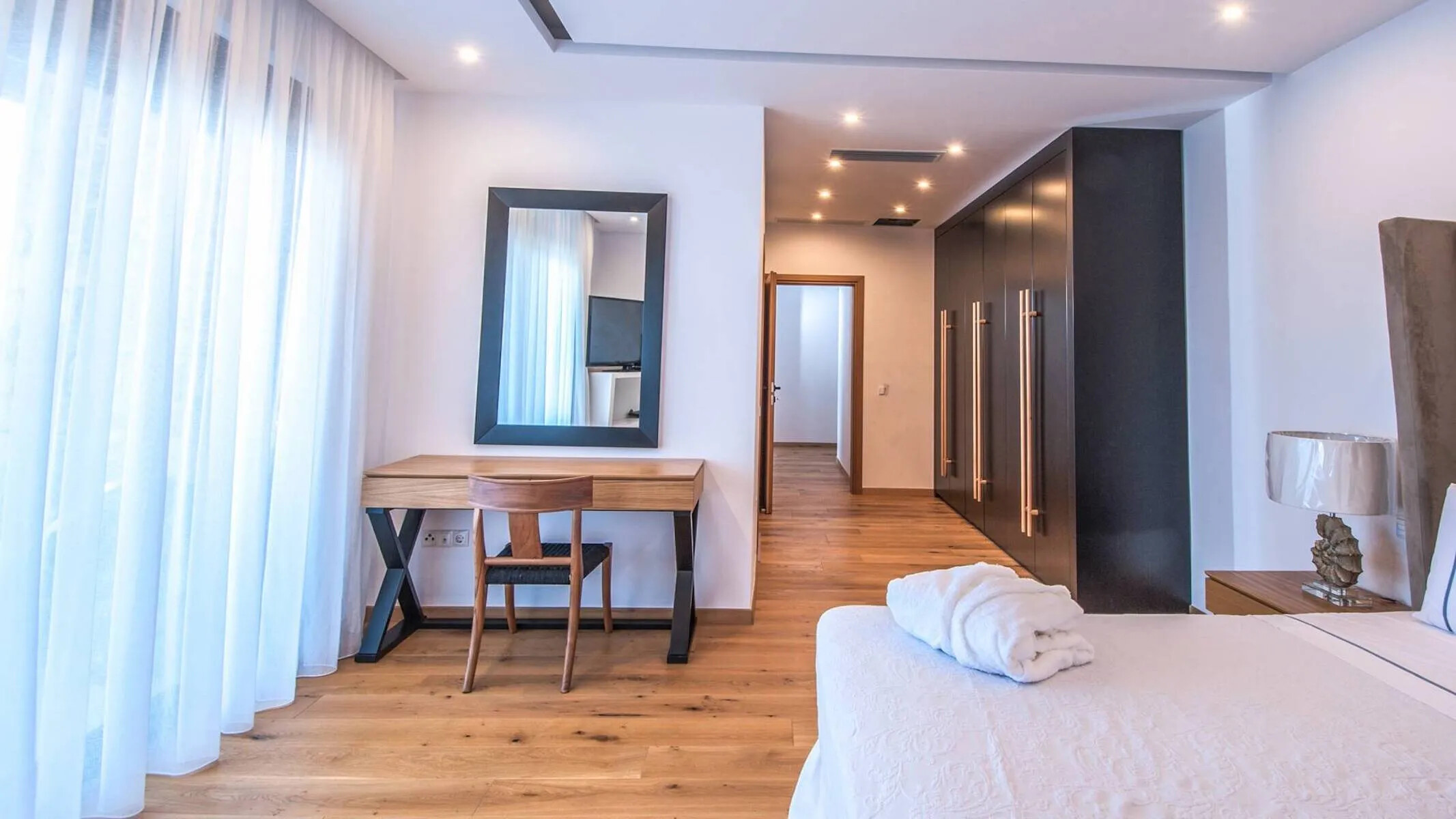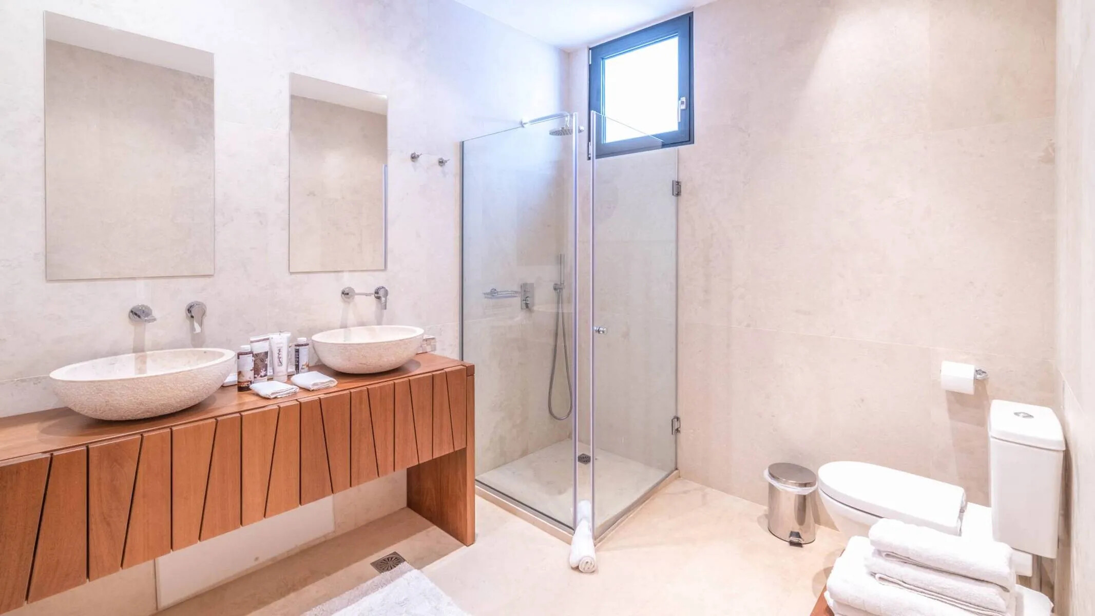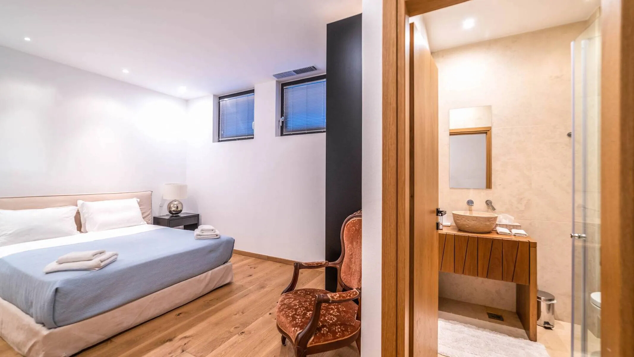 The villa showcases traditional Cretan architecture with modern interpretation—whitewashed walls, gray stone façades, and clean, cubic forms. Interiors are spacious, filled with light, and finished to the highest standards.
