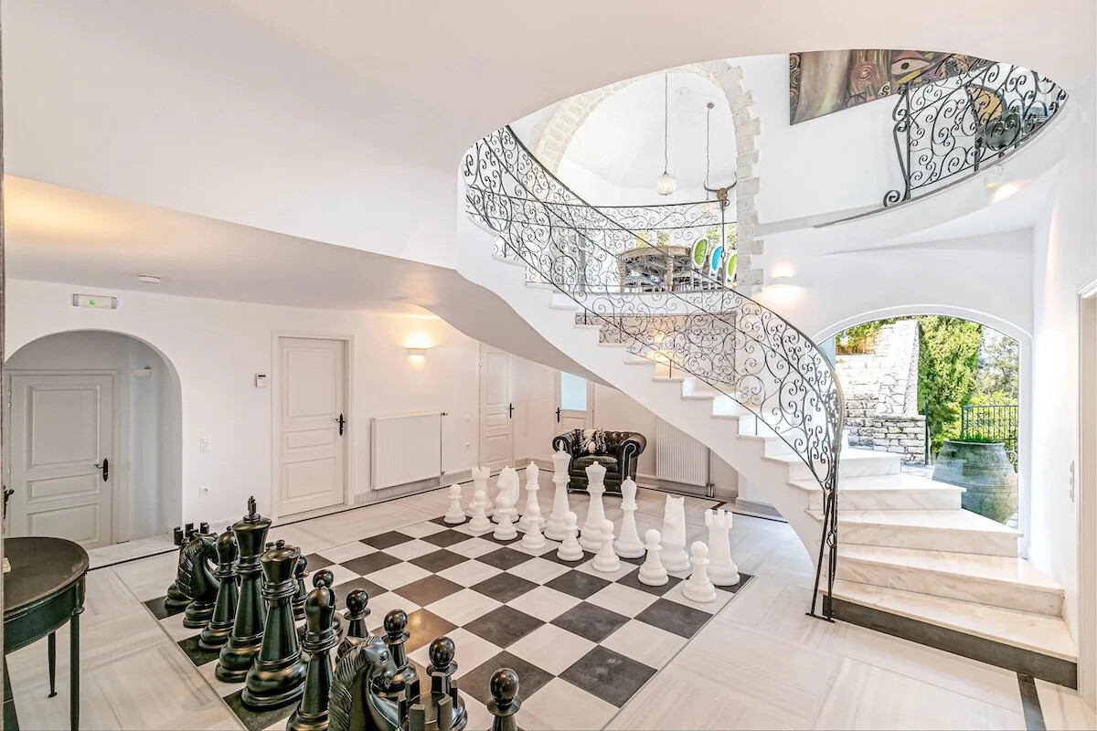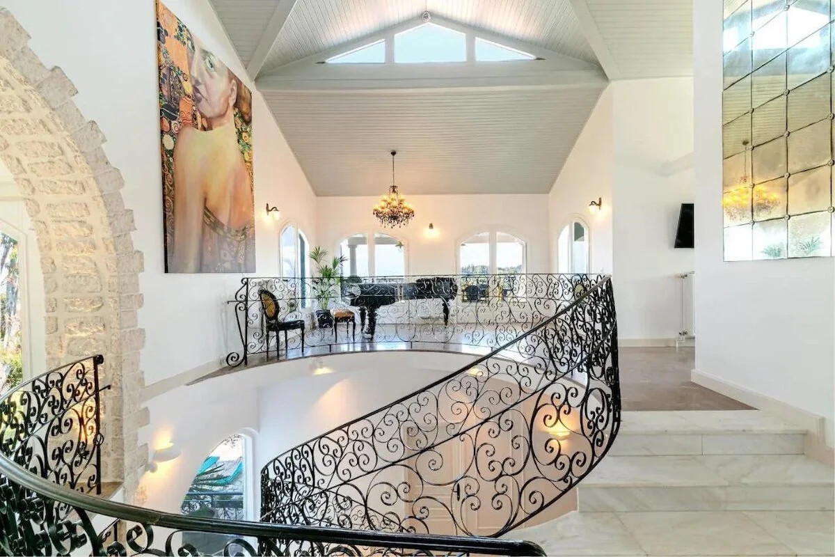 The ornate staircase and panoramic views from Corfu Town to mainland Greece further elevate the grandeur of the living spaces. The inclusion of Sonos speakers, a fully equipped kitchen, and Starlink’s super-fast internet align with modern expectations, catering to the needs of residents who seek both convenience and sophistication.