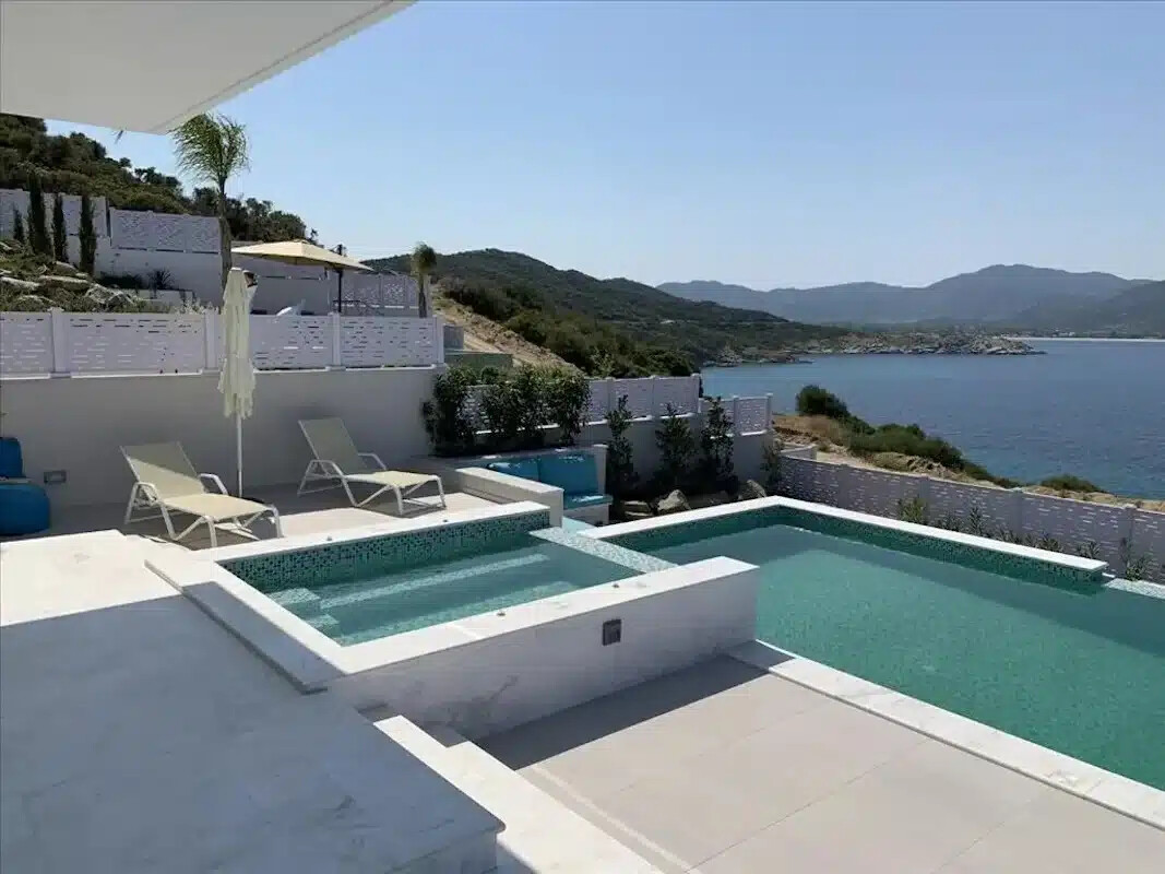 The two-storey villa with surface of 150 sq.m. On the first floor there is a spacious living room with a double-lighted space, a dining room, a kitchen, one bedroom and a bathroom. On the second floor there are 3 bedrooms with private bathrooms and balconies. The master bedroom has panoramic windows with a magnificent view of Athos, as well as a bathroom with sea view. On the site there is an infinity swimming pool with jacuzzi, a comfortable sofa area near the pool, organized grounds and green area, a parking space at the entrance to the site.