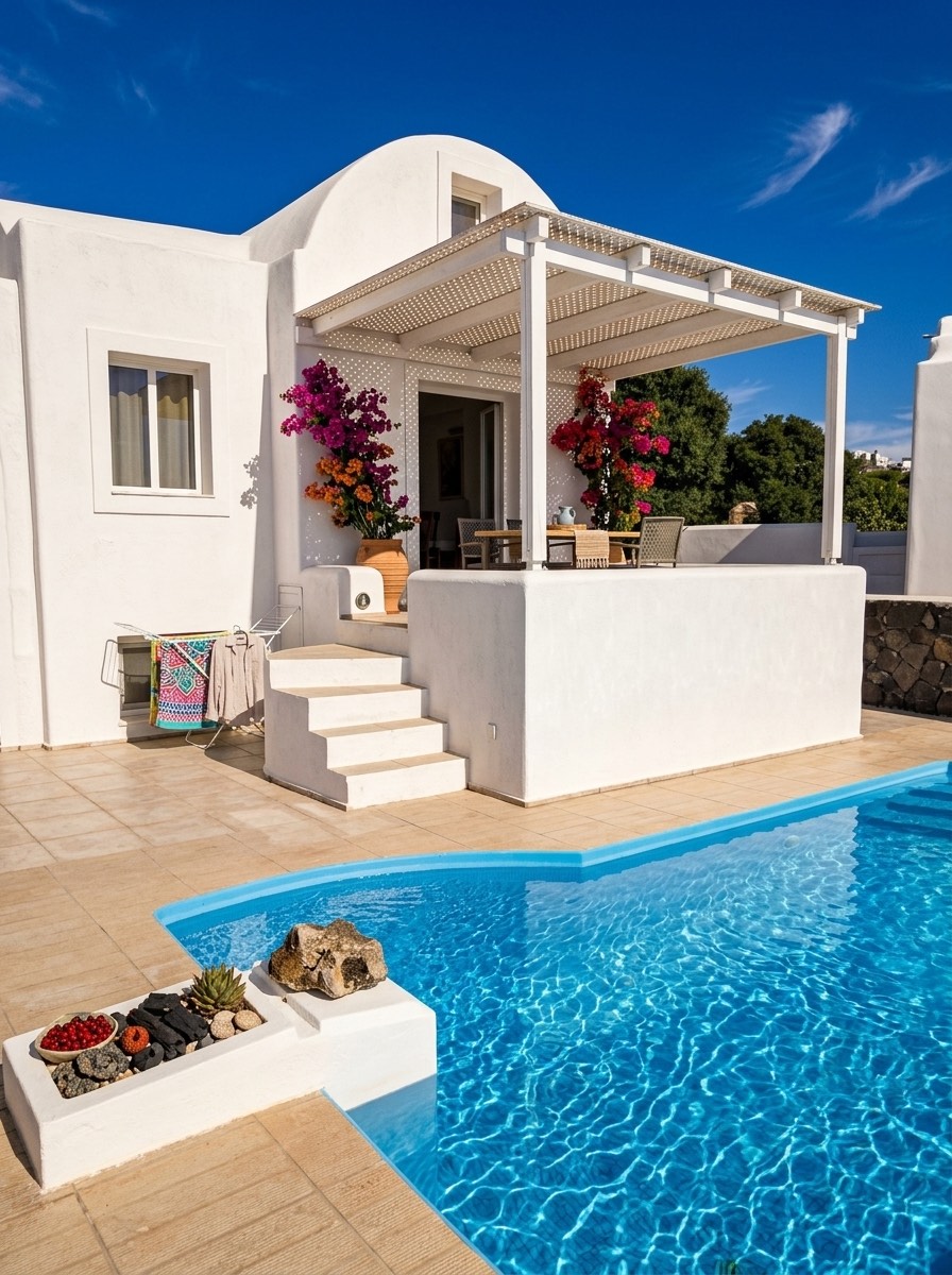 This villa is perfect for those seeking a luxurious and peaceful retreat in Santorini, offering both stunning views and convenient access to the charming village of Oia.