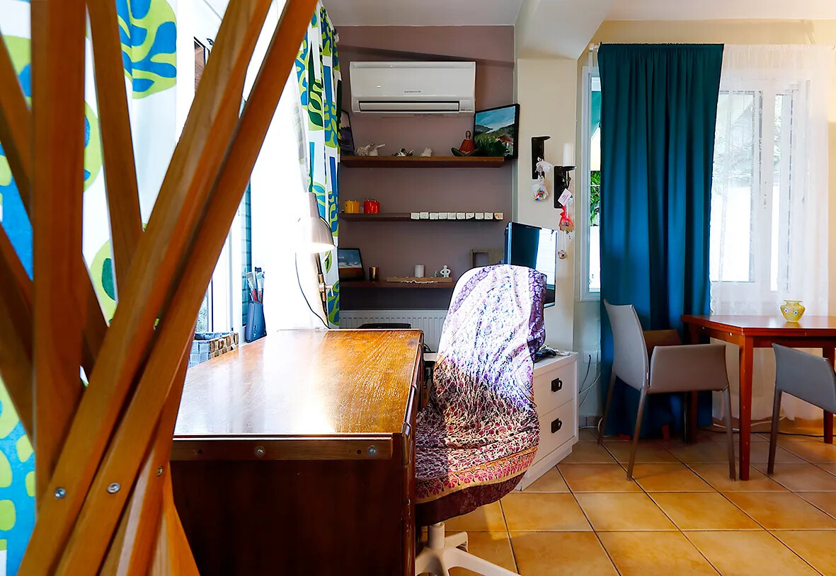 The house offers autonomous heating with an oil boiler, Europa aluminum frames with double glazing and screens, three-phase electricity, and night-time lighting. Additionally, it boasts a garden of approximately 45 sq.m.