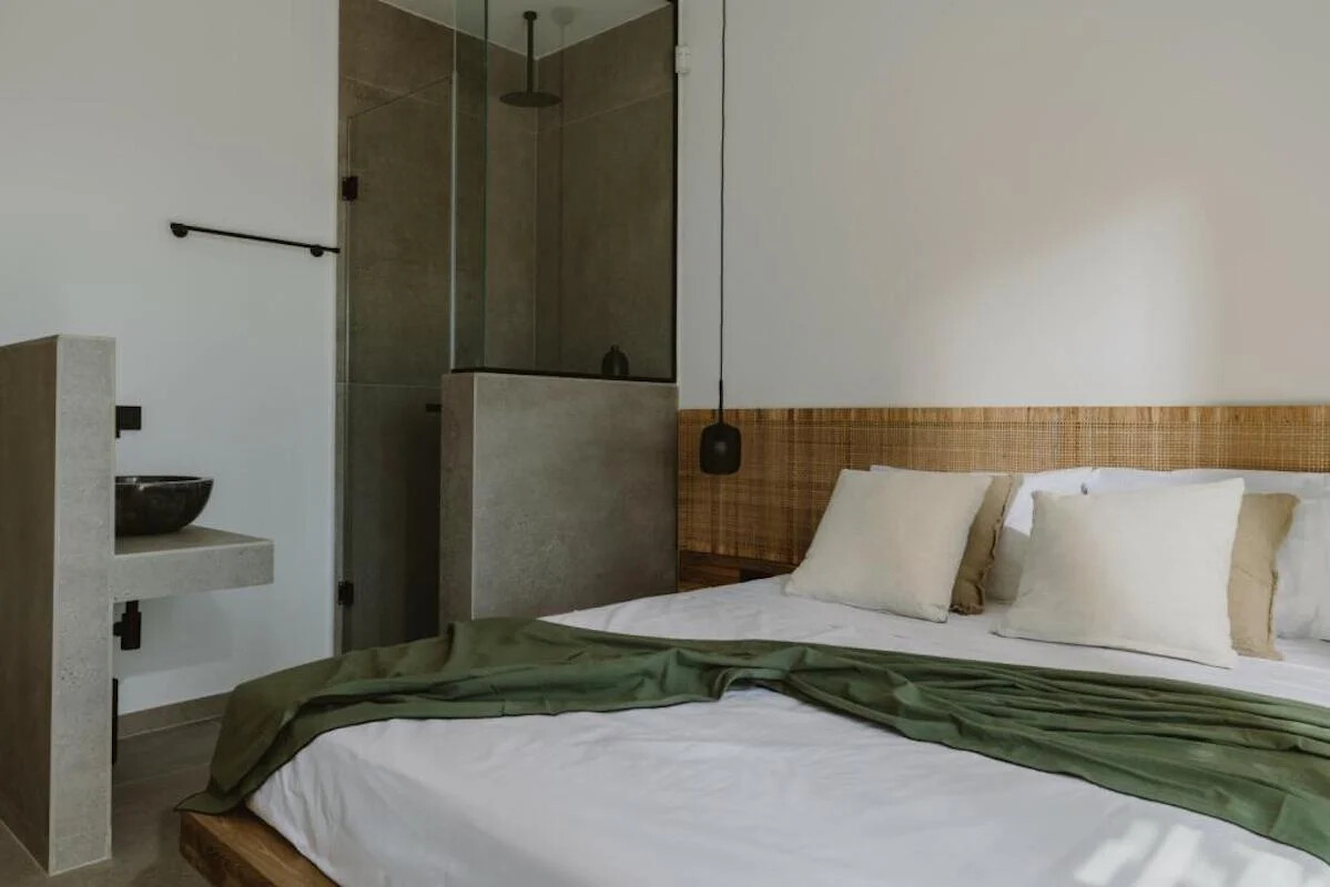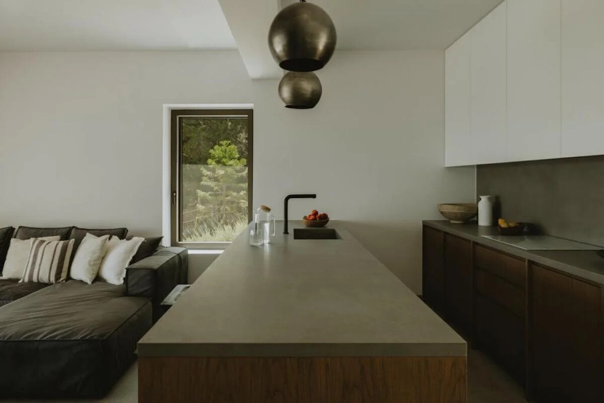 To the right of the entrance is a stunning kitchen area with a breakfast bar. It has been cleverly designed to optimize maximum views of the forest at the back of the villa while still keeping everything minimalistic. To the left is a walkway leading to a guest bathroom and the sleeping area, comprising two double, en-suite bedrooms, both of which have been created and furnished using natural materials to create a calm and serene atmosphere.