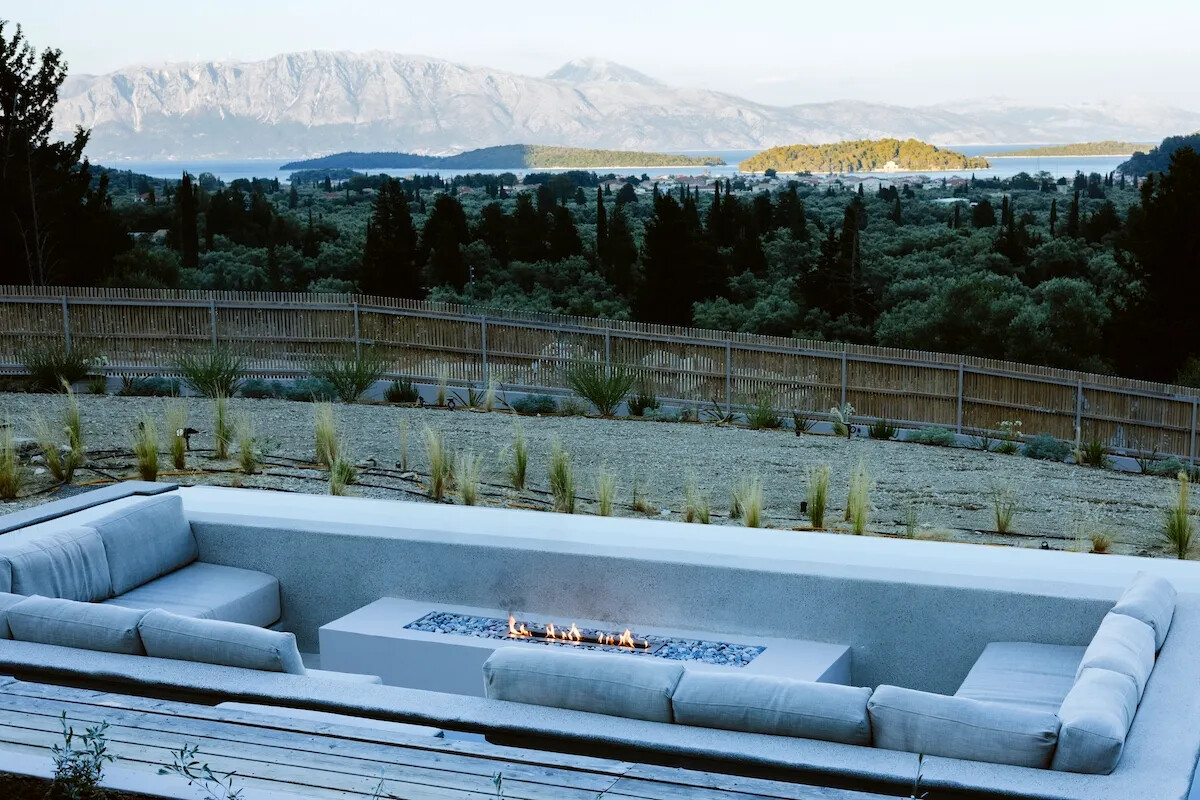 Upon entering, a large living and dining area greets you with an unrivaled backdrop of the blue Ionian Sea and the ever-changing colors of the Acarnanian mountain range. The living area has large comfortable sofas and coffee table, the dining area has a designer teak dining table, and between them is a 65” TV with a soundbar.