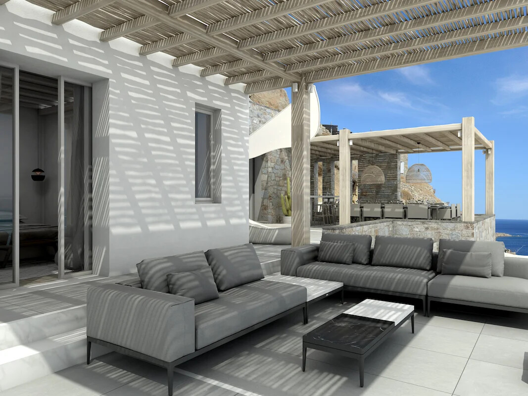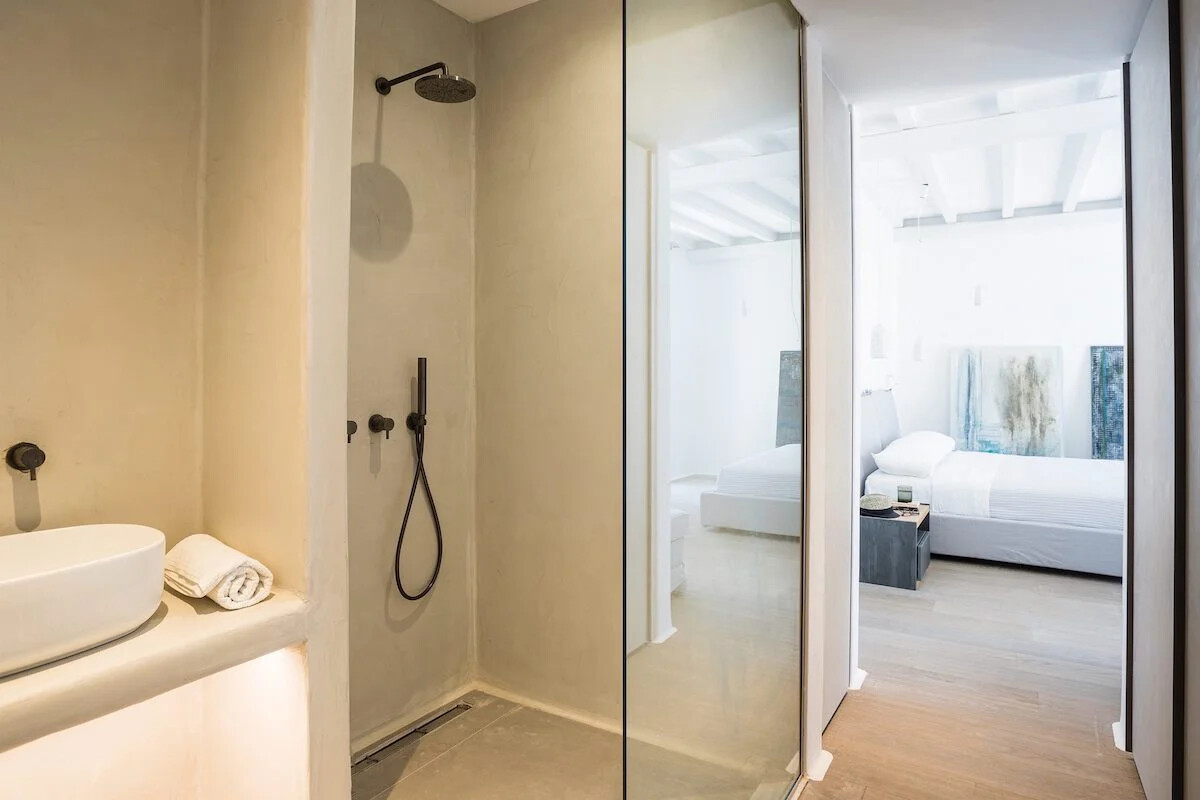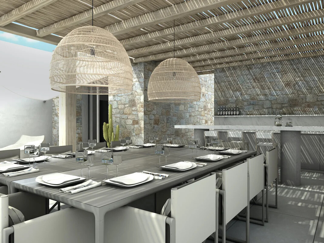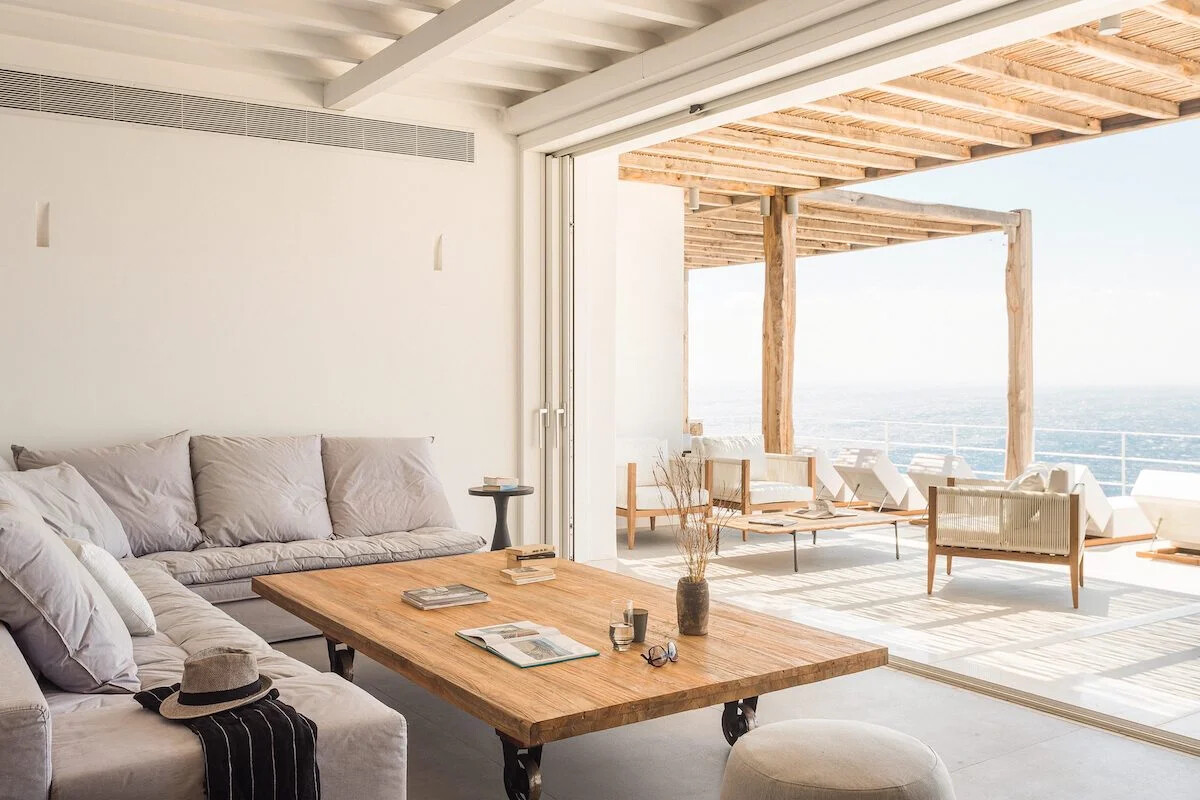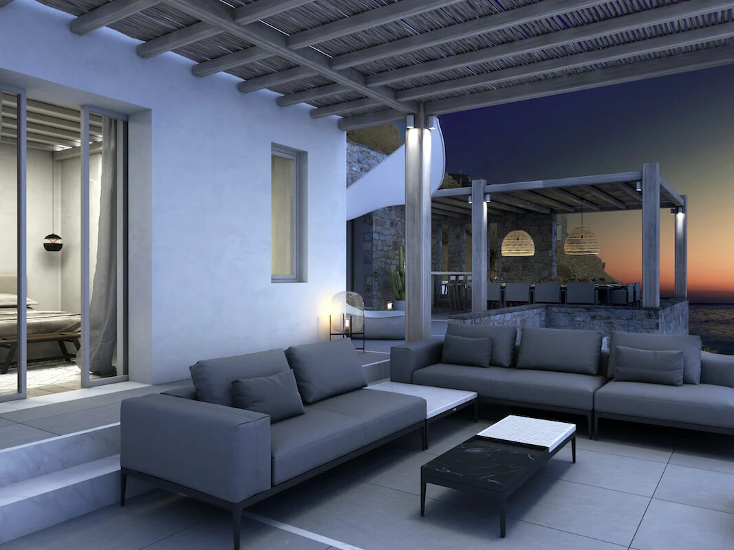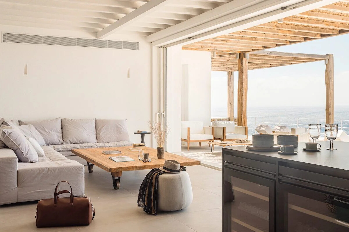 The property’s interior exudes an aura of simplicity, adorned with earthy tones and punctuated by splashes of black and white. From meticulously crafted custom furnishings to flawless materials and finishes, this residence distinguishes itself, even among Mykonos’s most lauded properties. Gaze through the expansive glass doors that lead to the terrace, where a breathtaking seascape unfolds before you. Slide these doors open, allowing the invigorating sea breeze and natural sunlight to flood the interior. The open-concept design fosters a seamless flow, ensuring that the captivating view graces every corner, whether you’re at the dining table or nestled on the living room sofa.