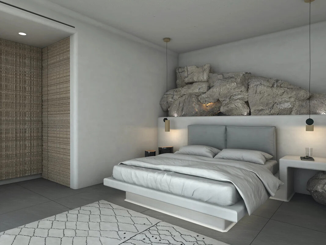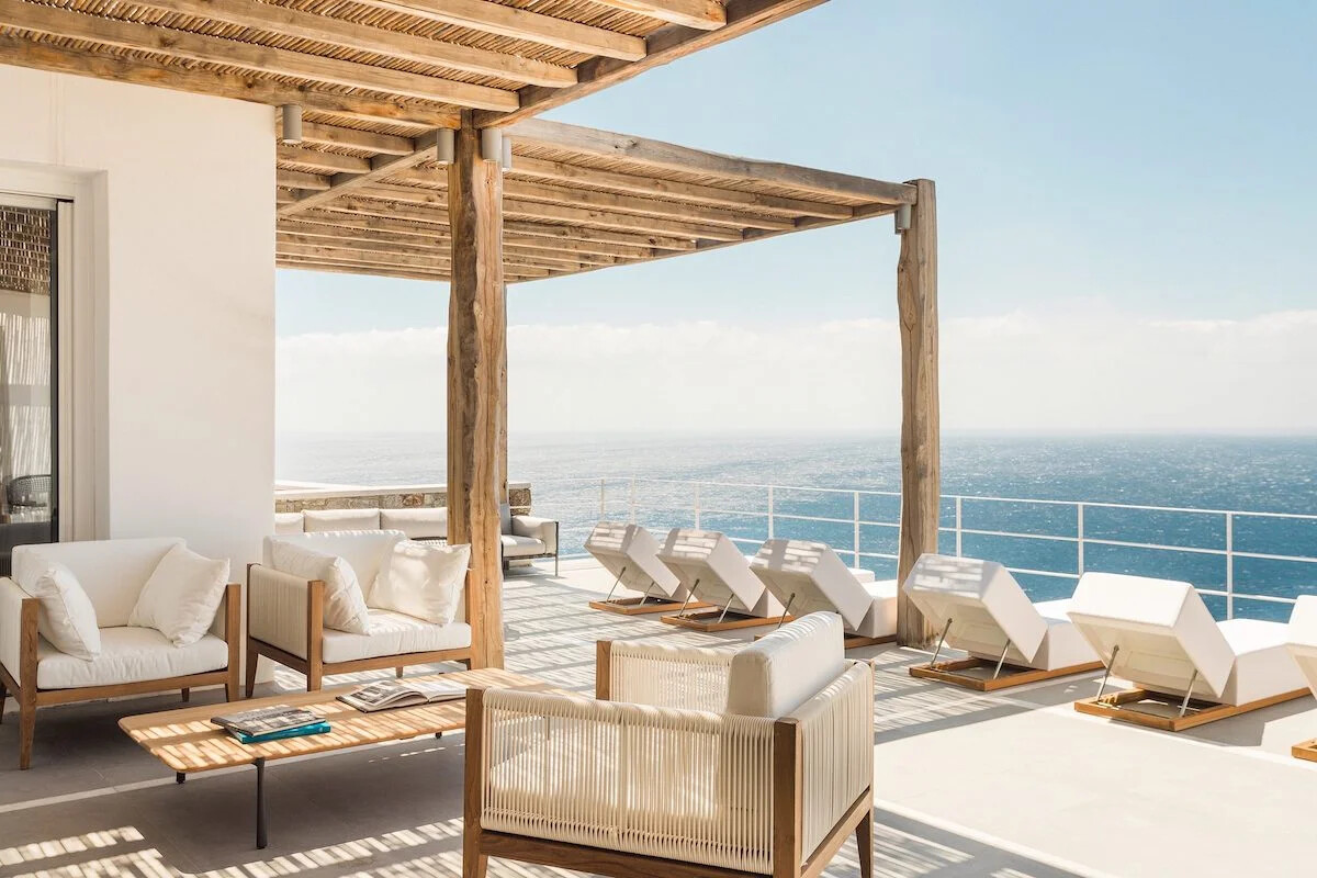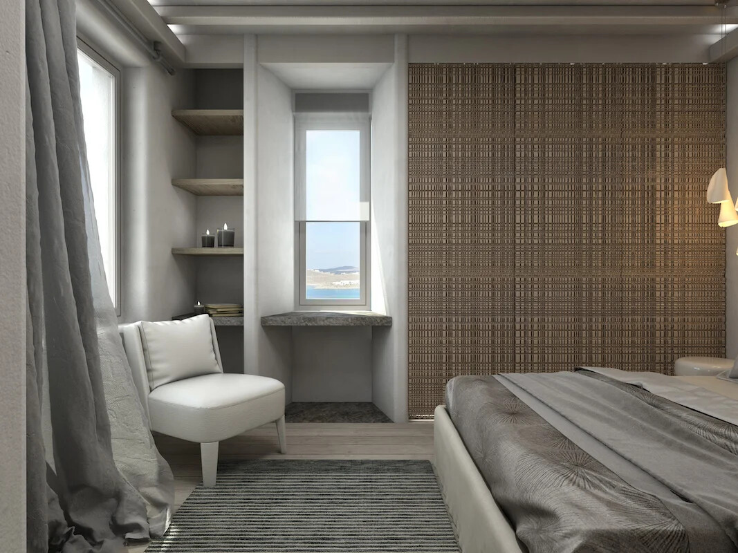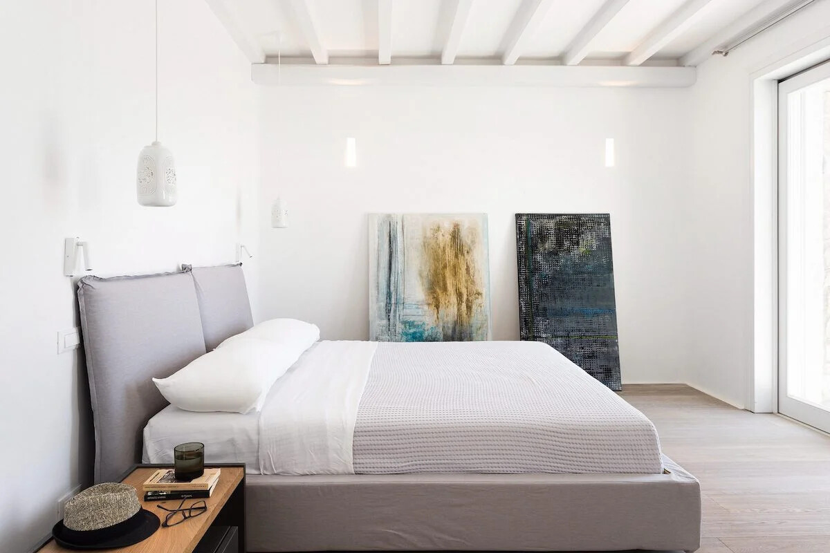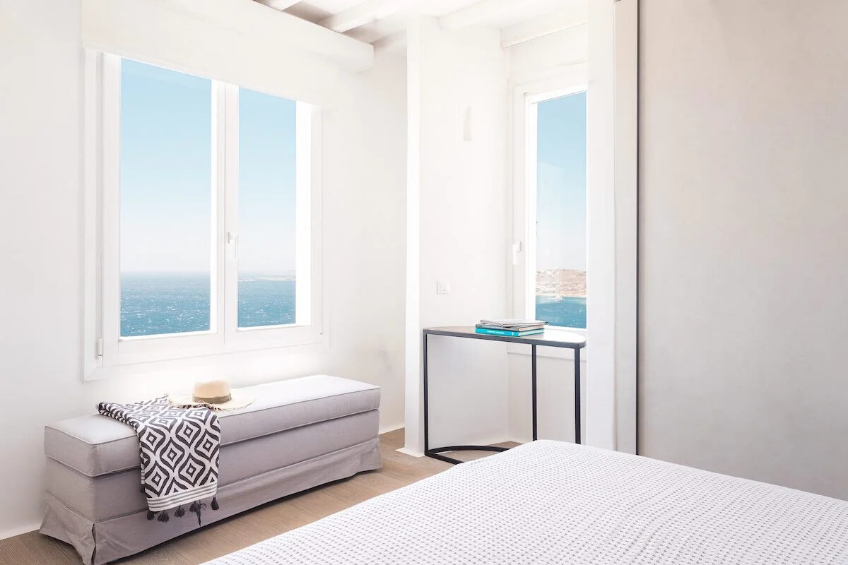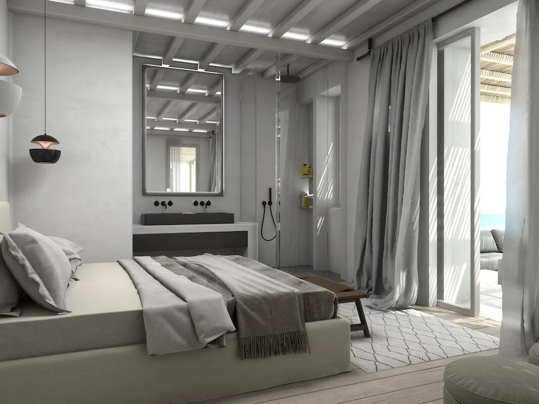 The property’s interior exudes an aura of simplicity, adorned with earthy tones and punctuated by splashes of black and white. From meticulously crafted custom furnishings to flawless materials and finishes, this residence distinguishes itself, even among Mykonos’s most lauded properties. Gaze through the expansive glass doors that lead to the terrace, where a breathtaking seascape unfolds before you. Slide these doors open, allowing the invigorating sea breeze and natural sunlight to flood the interior. The open-concept design fosters a seamless flow, ensuring that the captivating view graces every corner, whether you’re at the dining table or nestled on the living room sofa.
