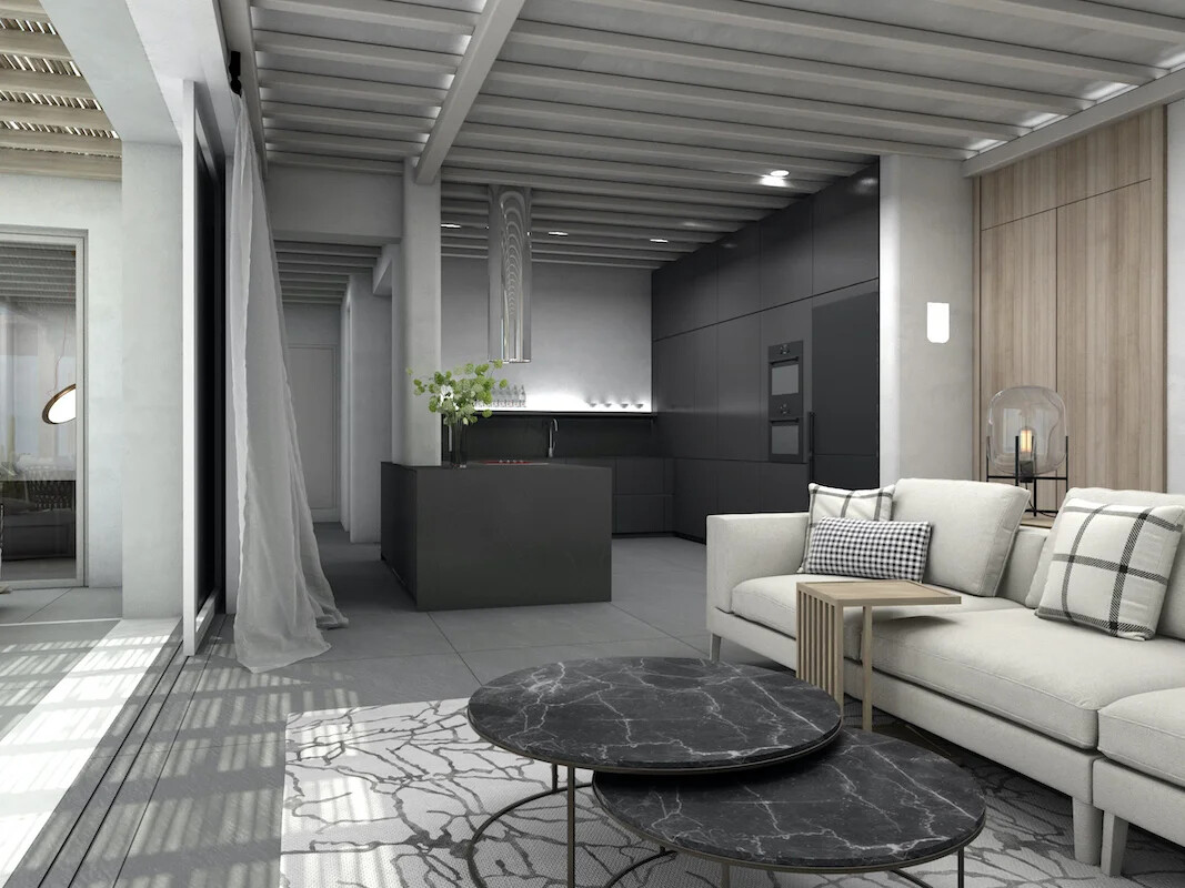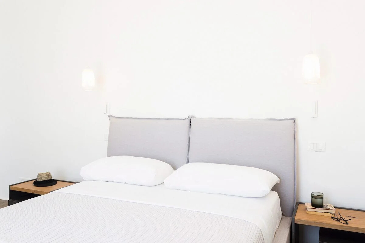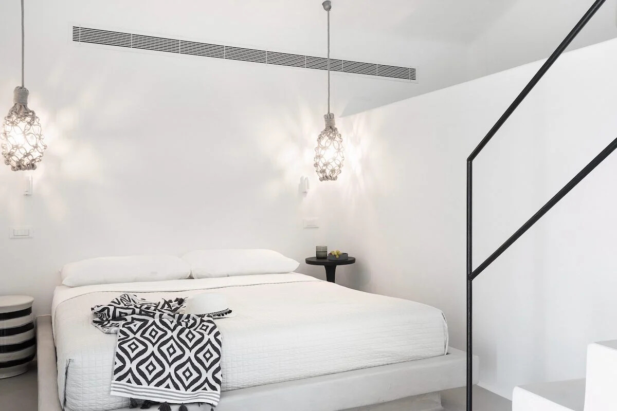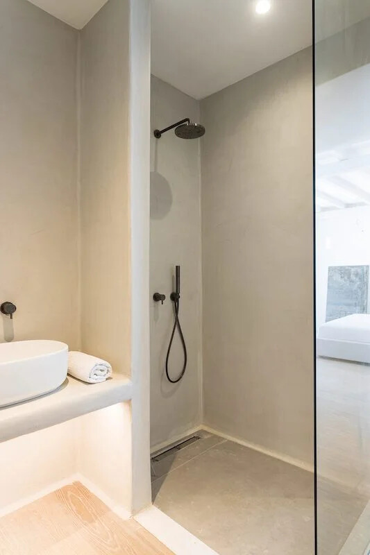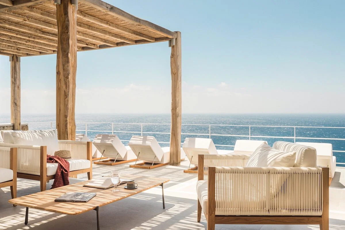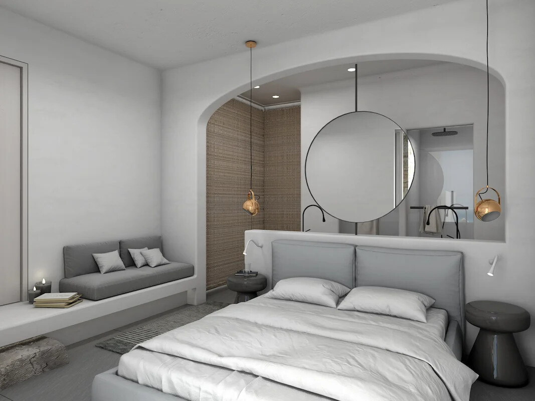 The property’s interior exudes an aura of simplicity, adorned with earthy tones and punctuated by splashes of black and white. From meticulously crafted custom furnishings to flawless materials and finishes, this residence distinguishes itself, even among Mykonos’s most lauded properties. Gaze through the expansive glass doors that lead to the terrace, where a breathtaking seascape unfolds before you. Slide these doors open, allowing the invigorating sea breeze and natural sunlight to flood the interior. The open-concept design fosters a seamless flow, ensuring that the captivating view graces every corner, whether you’re at the dining table or nestled on the living room sofa.