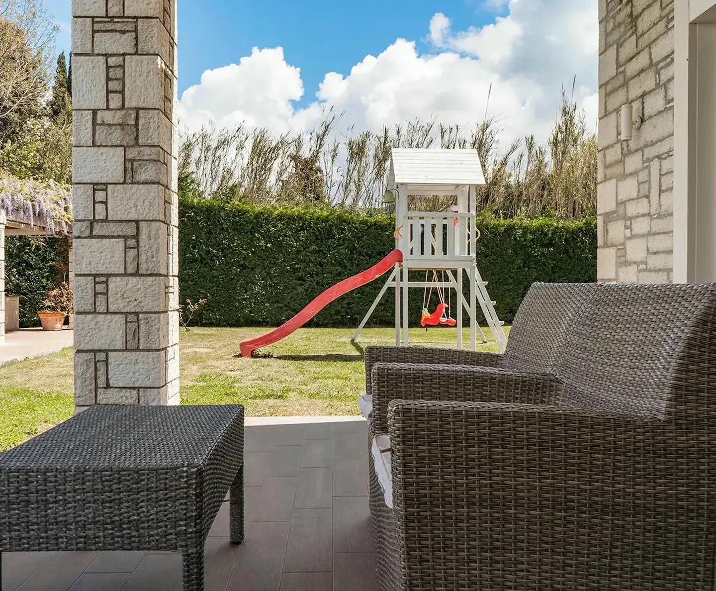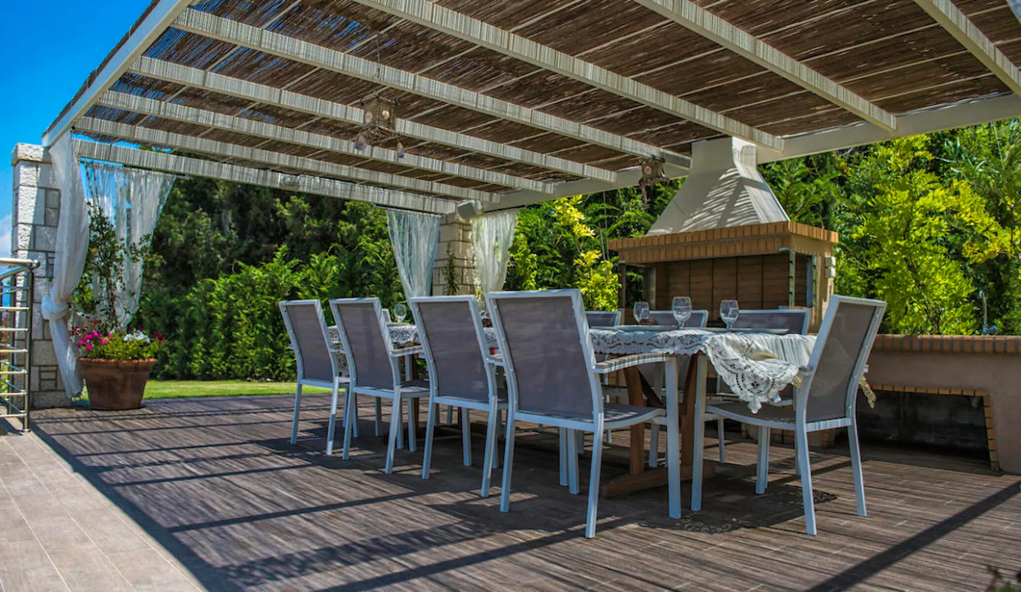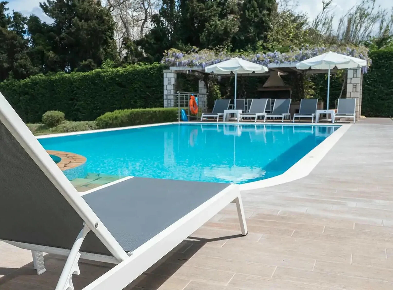 From its large front veranda, residents enjoy sweeping views of the Ionian Sea, the Corfu Channel, and the passing ships. The lush greenery of the surrounding landscape further enhances the villa’s natural beauty. This residence offers a captivating blend of modern architecture and Mediterranean aesthetics.