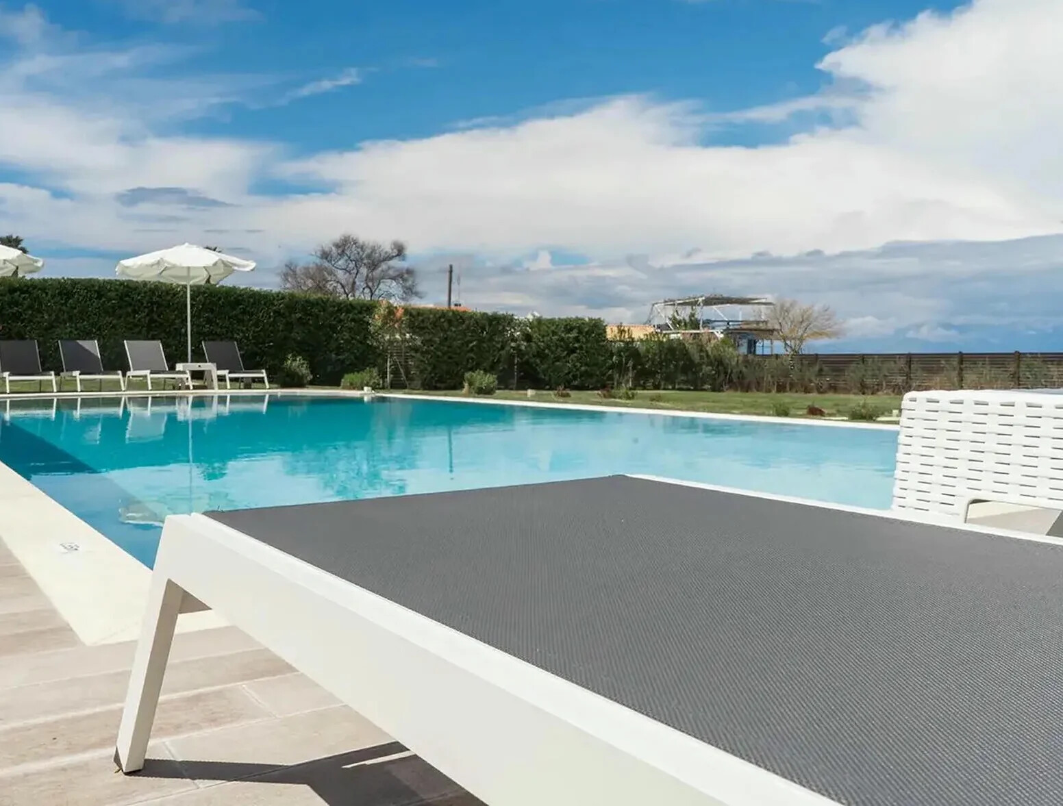 - A large swimming pool surrounded by palm trees and ornamental plants