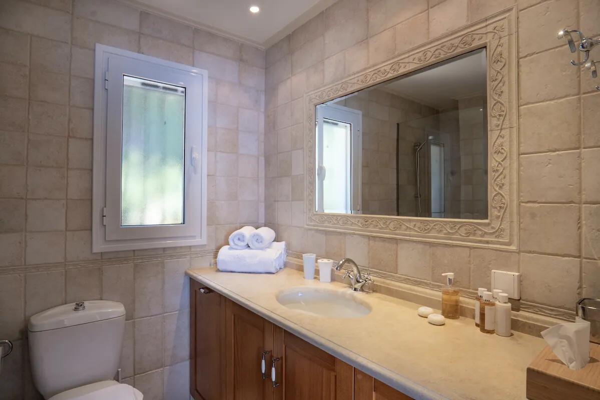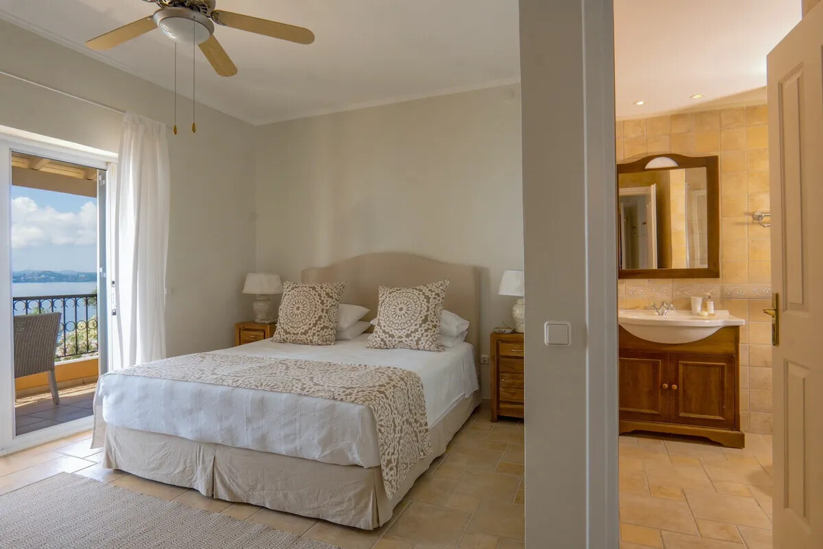 On the ground floor, the lovingly created fitted kitchen features an island worktop for you to interact with your guests or loved ones during cooking. Patio doors lead from the sitting and dining room out to a portico, where you can enjoy dinner whilst enjoying looking out over your private infinity pool across the sea all the way to Corfu Town.