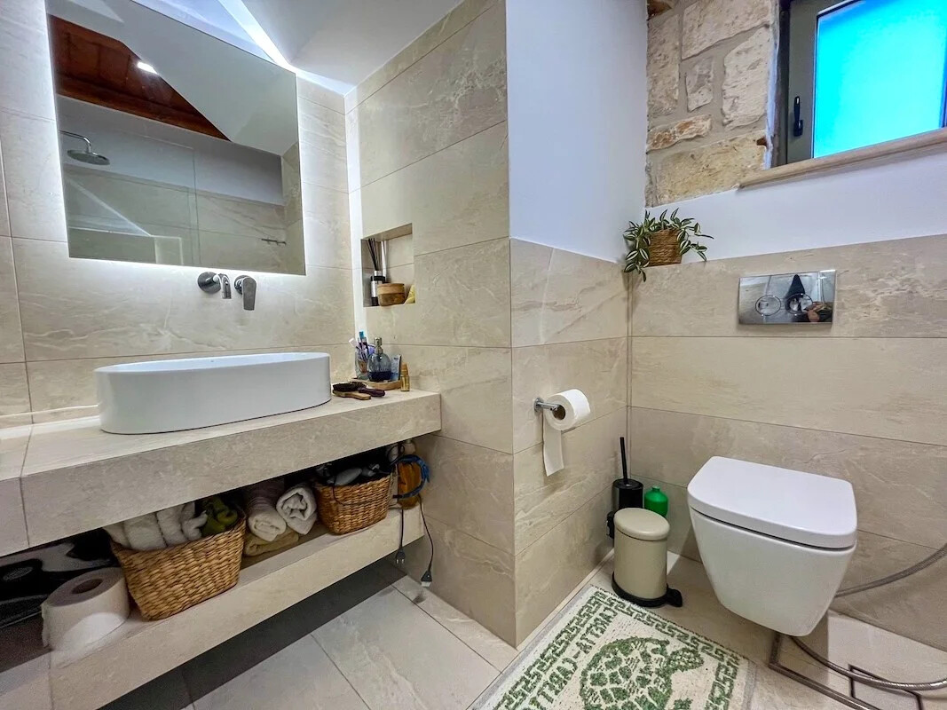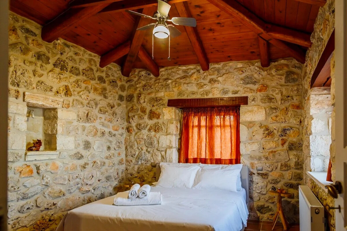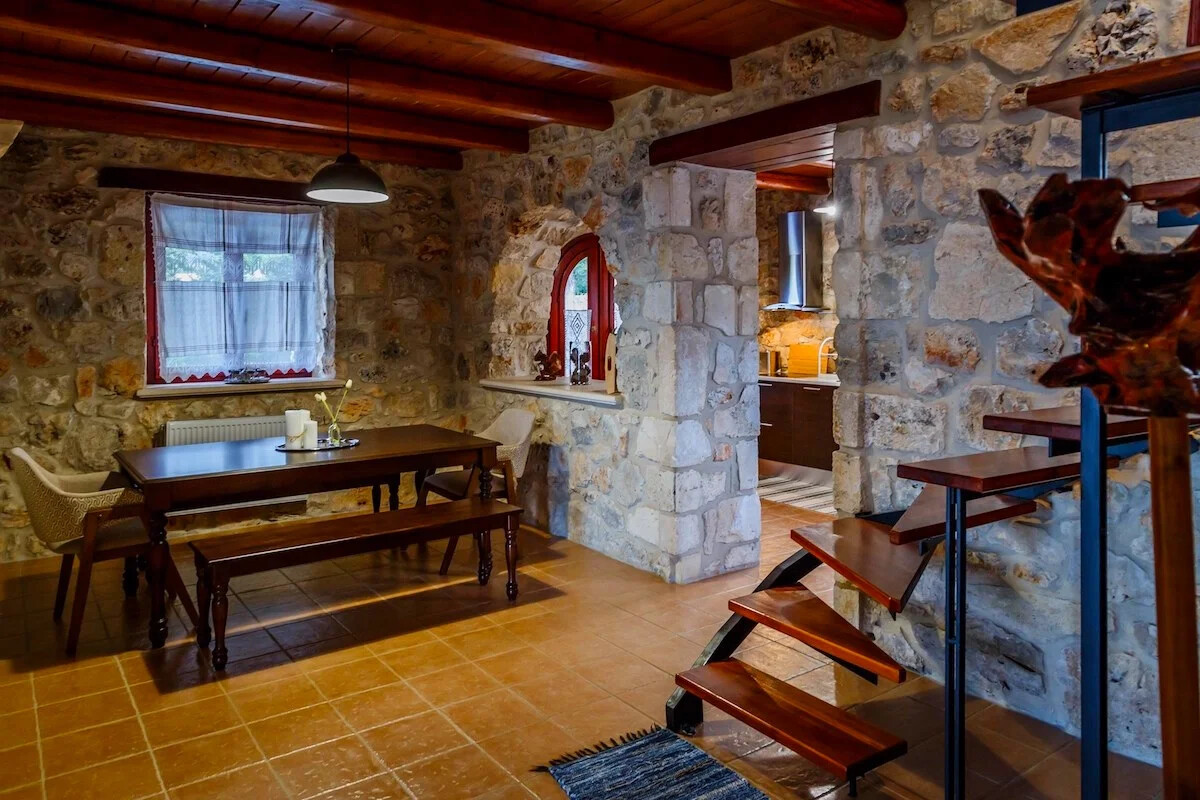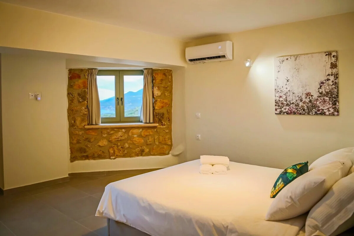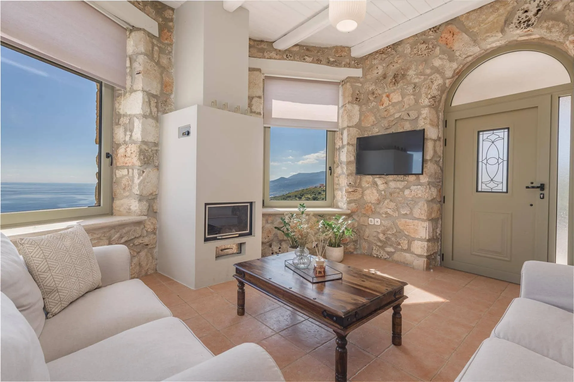 The main property spans two levels, showcasing thoughtful design. On the lower level, a self-contained guesthouse with a private terrace awaits. The main entrance leads into a spacious kitchen diner with a distinctive pass-through arch. The curvaceous sitting room exudes a beautifully calm atmosphere, featuring sea-facing vertical glass windows throughout and a captivating fireplace. A double bedroom and a separate bathroom are also conveniently located on the ground level. Ascend the spiral staircase to the first floor, where two additional double bedrooms and a second bathroom with a free-standing roll-top bathtub await. A large sea-facing terrace between both bedrooms offers undisturbed views of the Ionian Sea.