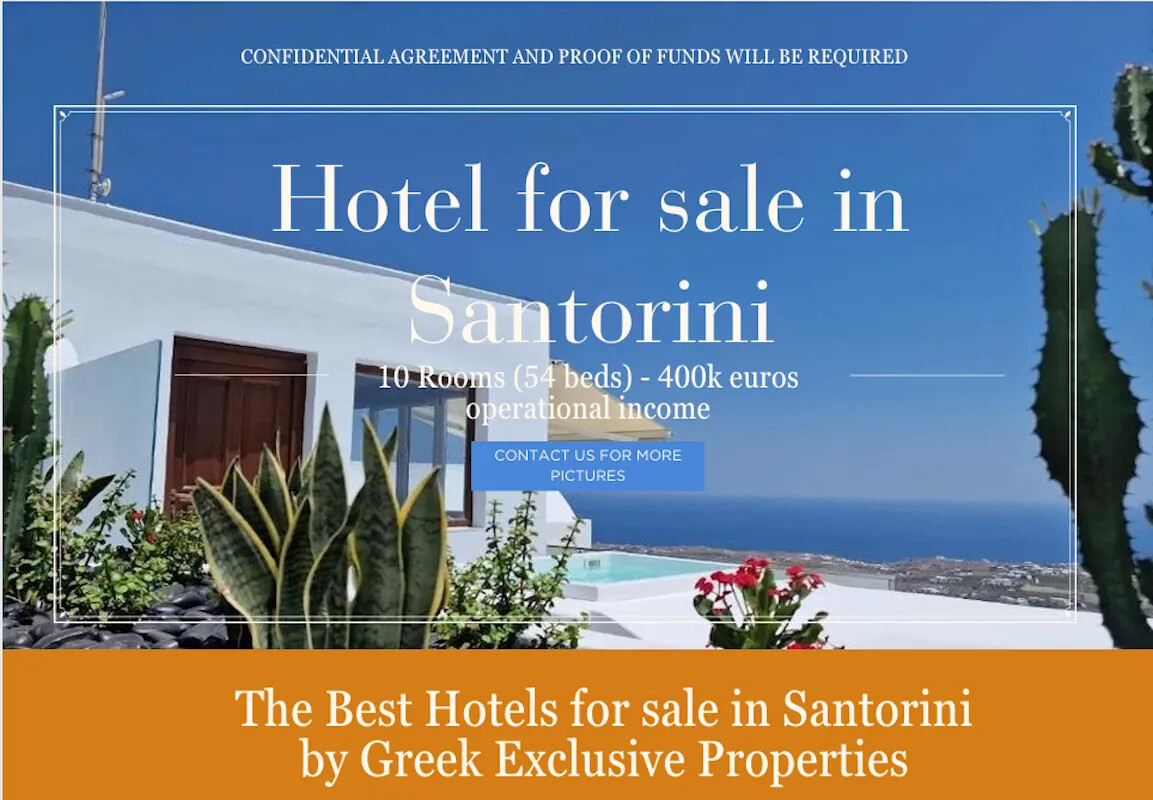 Hotel for sale Santorini with 10 spacious rooms, 400k operational income/year
