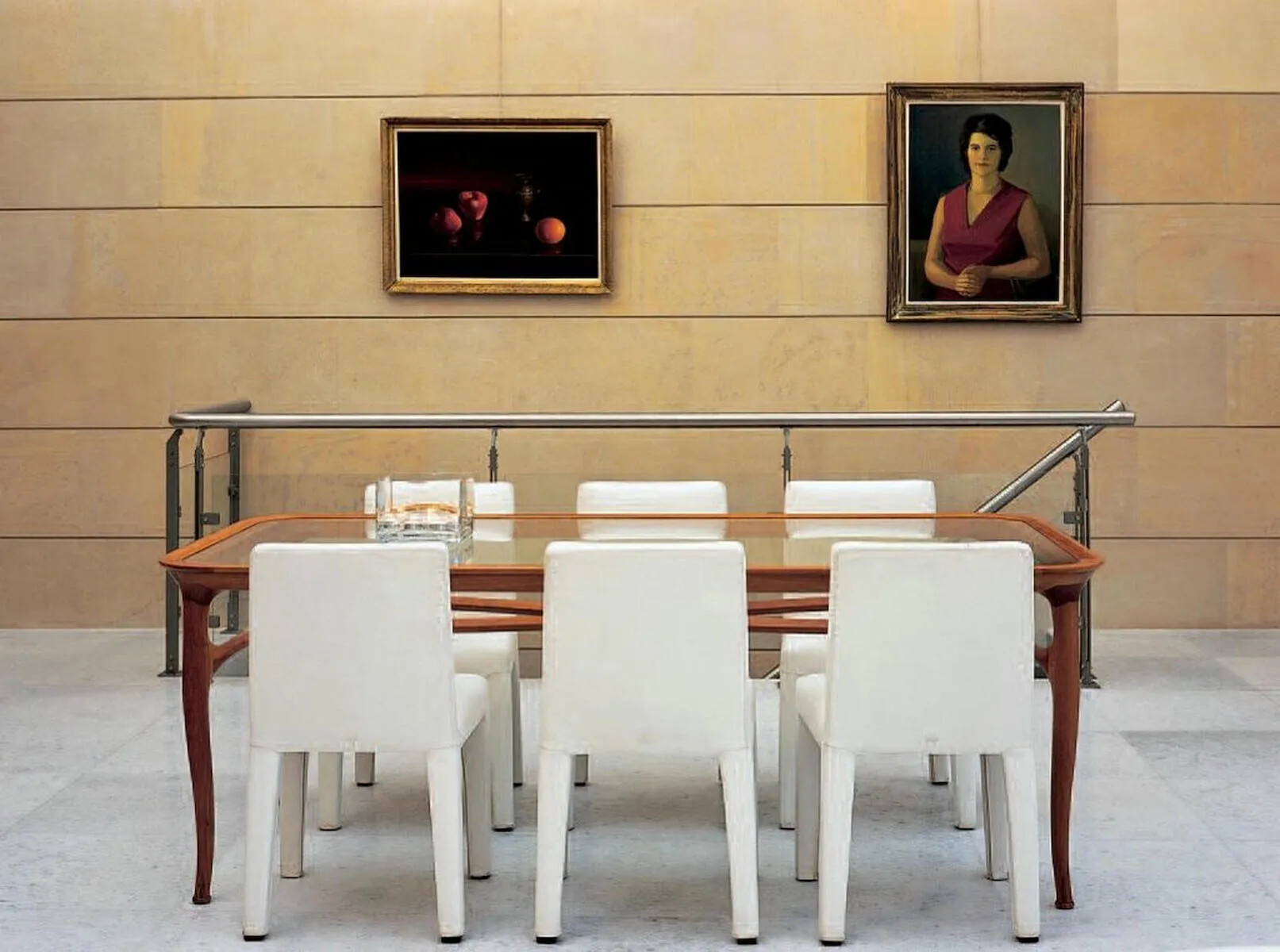 Living Room: Expansive and elegant, with large windows offering pool and sea views, featuring a fireplace, two sofas, and an armchair surrounding a glass dining table