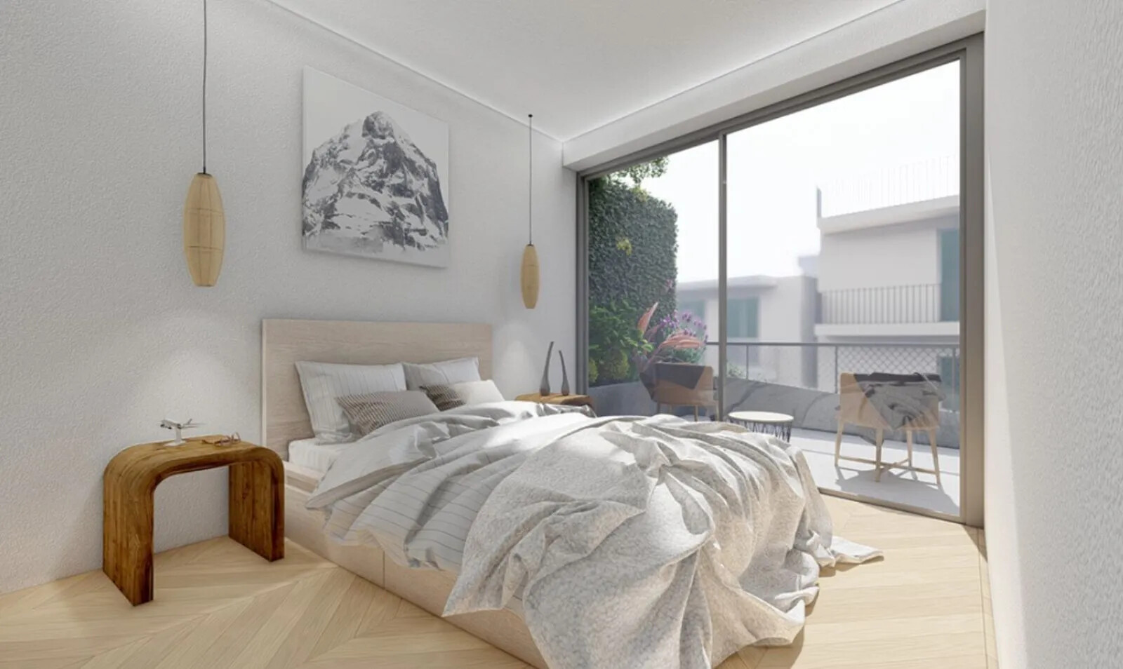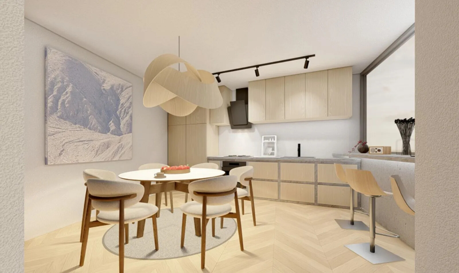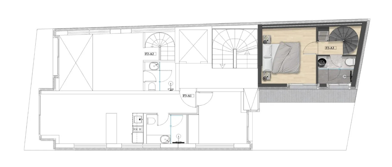 - Open Living Spaces: The apartment, spanning the fourth and fifth floors, features a spacious living room with an open kitchen, opening to a charming balcony.