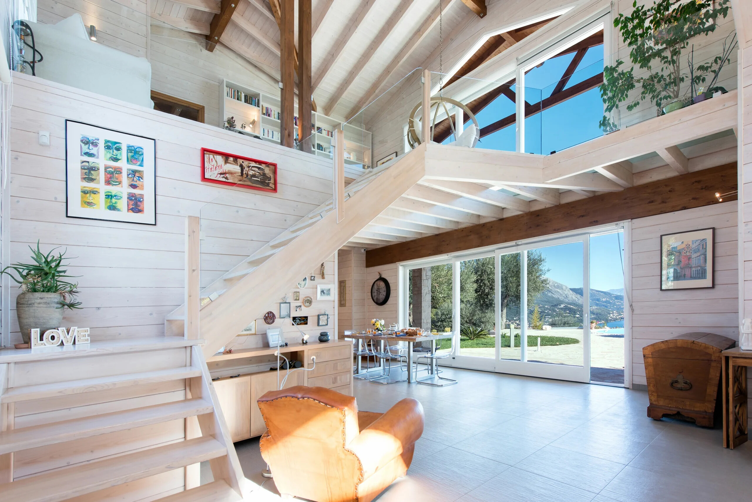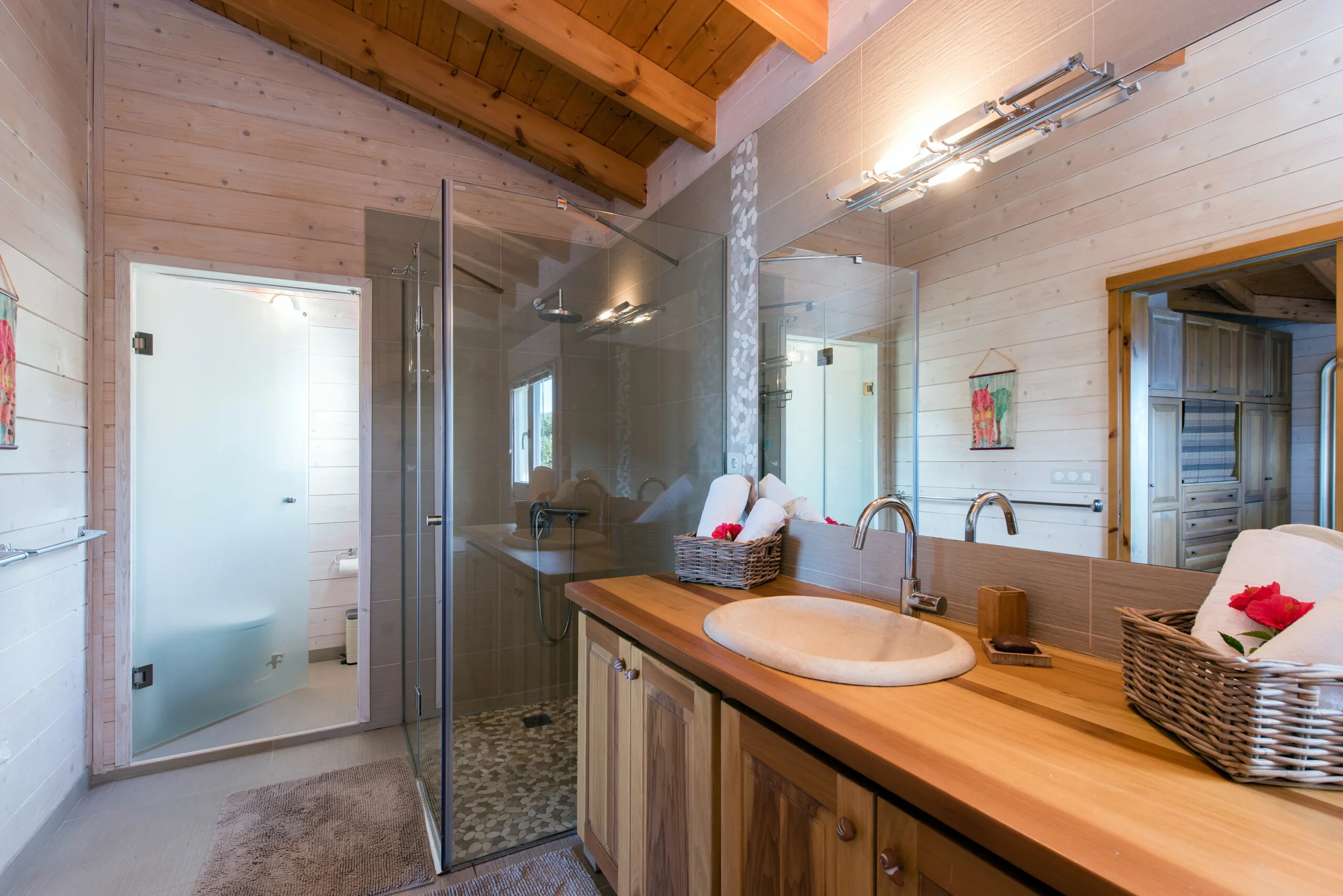 The villa comprises a stunning main residence and a cozy cottage, creating a harmonious retreat on this elevated terrain. The two-story main villa boasts elegant white wood and stone pillars, cultivating a serene ambiance. High beamed ceilings enhance the sense of freedom and seamlessly connect the living spaces with the natural surroundings.
