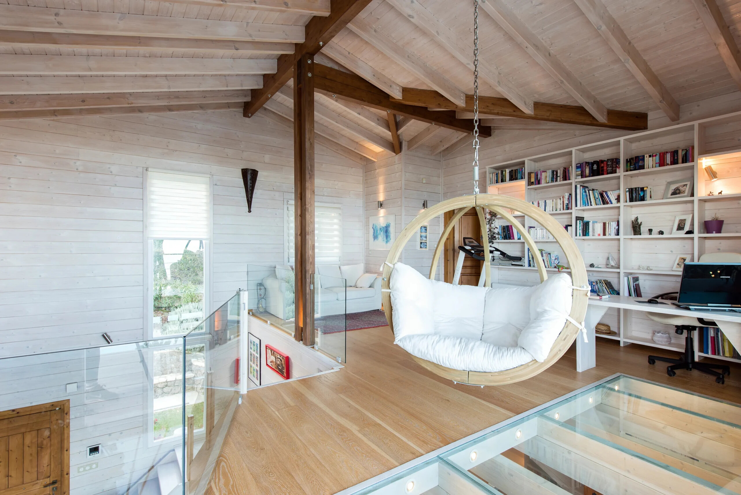 The second floor serves as a versatile guest space, offering an additional sitting area transforming into a queen-size bed. A wooden corner desk with captivating views and a unique hanging daybed overlooking the dining area below add to the charm.