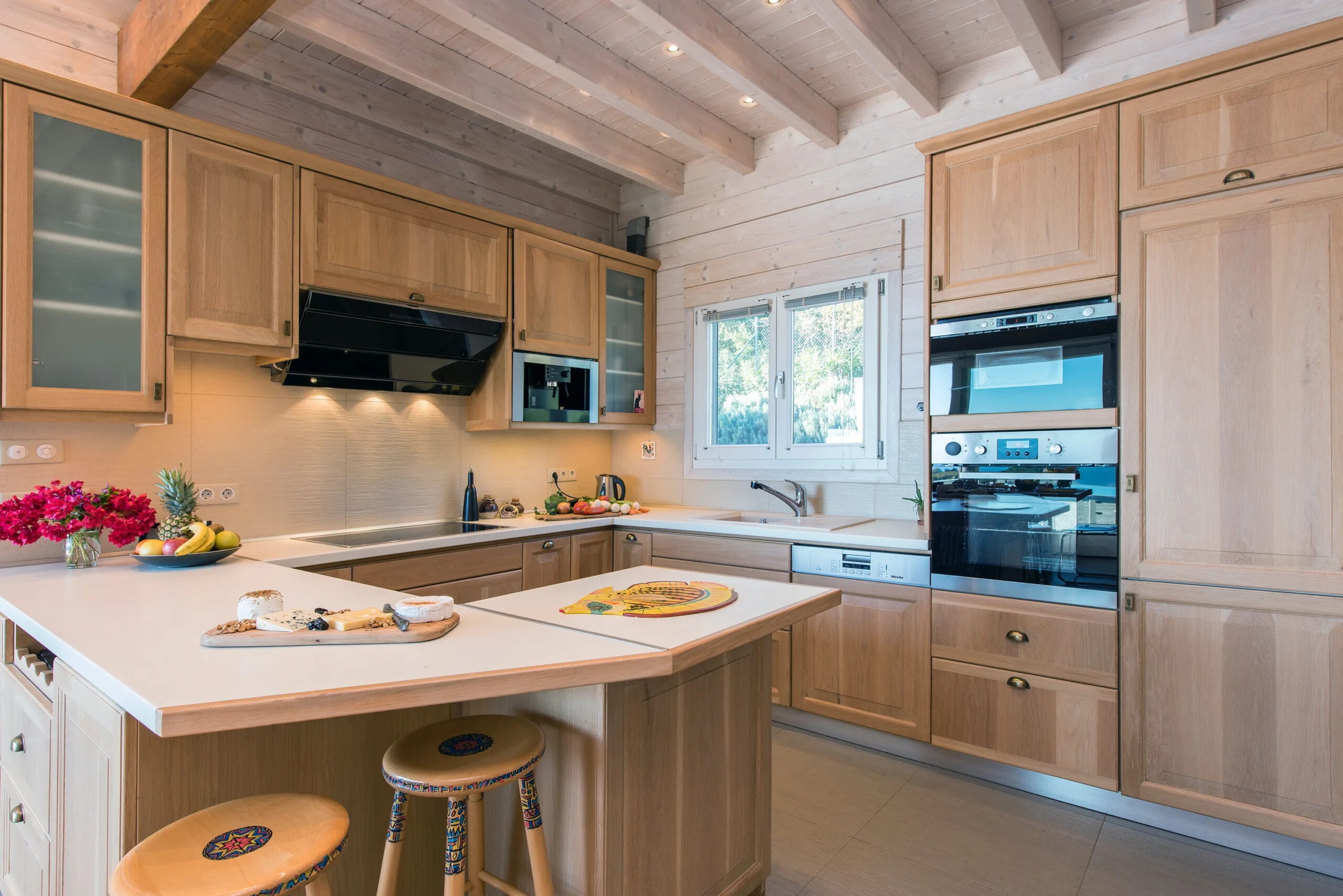 The inviting kitchen, perfect for family breakfasts, overlooks the island’s nature. For a closer connection to the mesmerizing sea vistas and the inviting pool, dine outdoors on the shaded patio with a barbecue area.