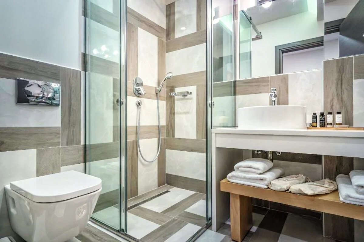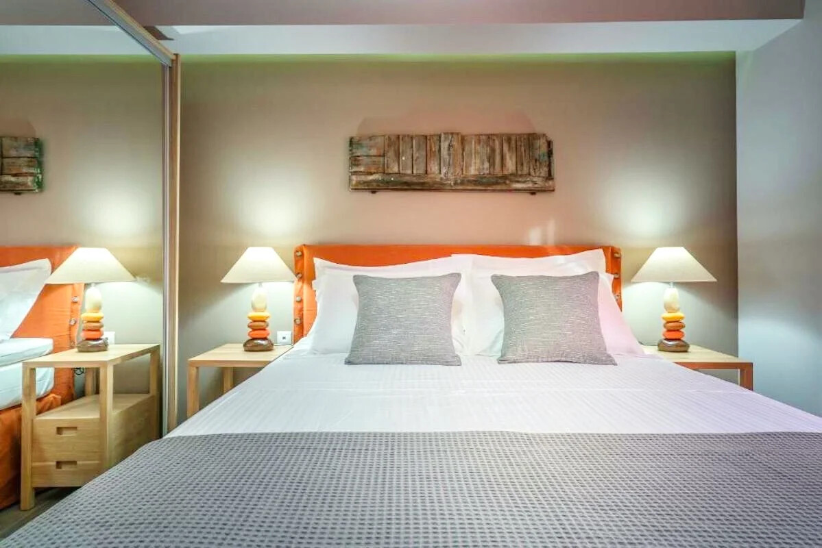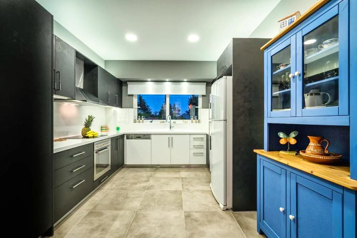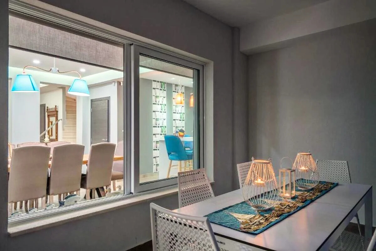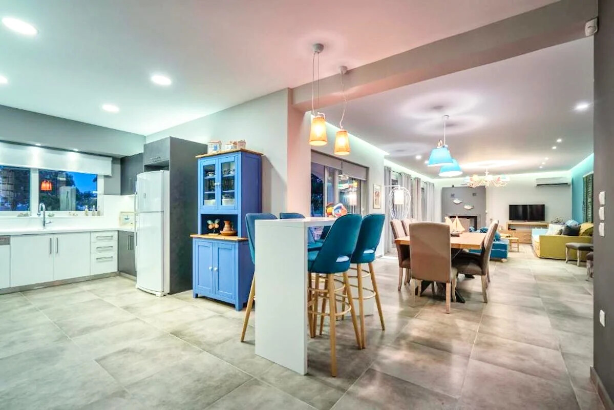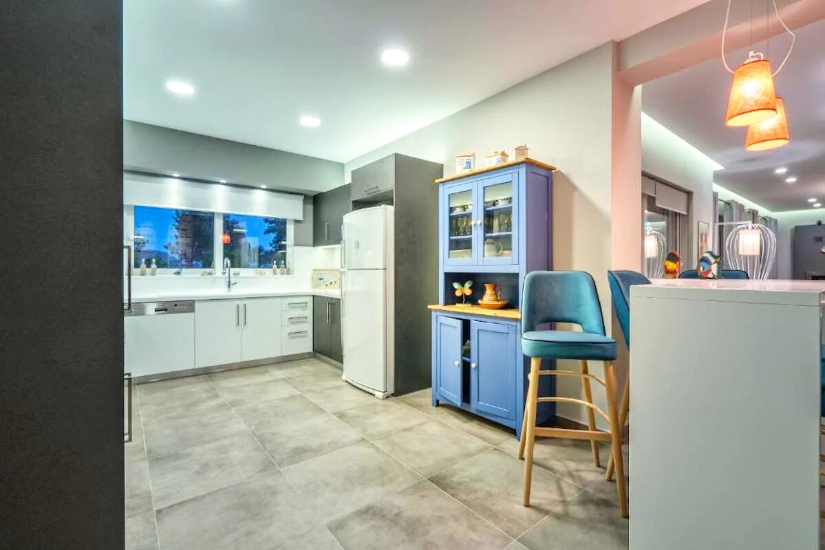 The expansive, fenced garden features lush greenery, a children’s playground, baby cots, and other amenities catering to younger guests. With a capacity to accommodate up to 8-9 guests, this residence provides four sound-proof luxurious bedrooms. Each bedroom comes complete with hypoallergenic Cocomat linens and mattresses, an en-suite bathroom, climate control, and satellite TV sets. Three bedrooms are situated on the top floor, boasting balconies with panoramic views of the sea and the surrounding landscape.