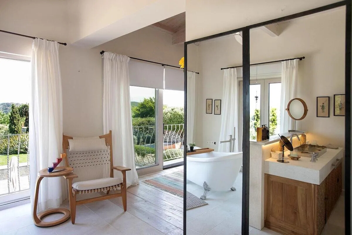 - Bedroom 2: Connected single mattress (200×200 cm), en-suite bathroom, and garden access.