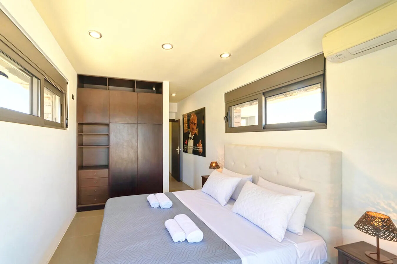 - Ground Floor: One bedroom with a double bed, wardrobe, private balcony, and an attached bathroom with shower and WC. There is also a dedicated office space for those who need to work while on vacation.