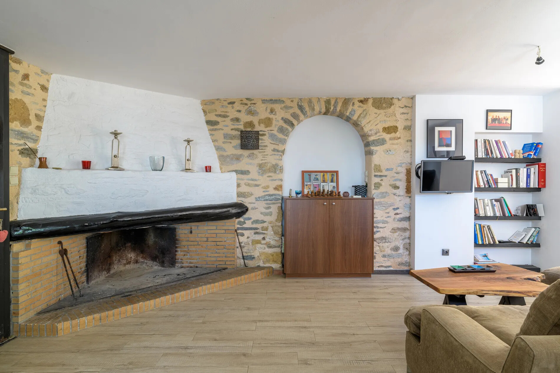 • A welcoming living room graced by a cozy fireplace.