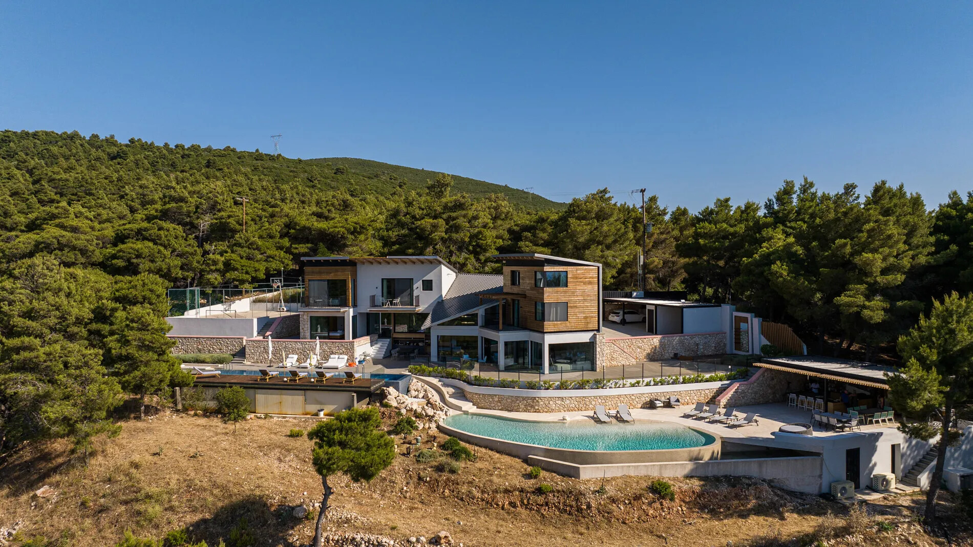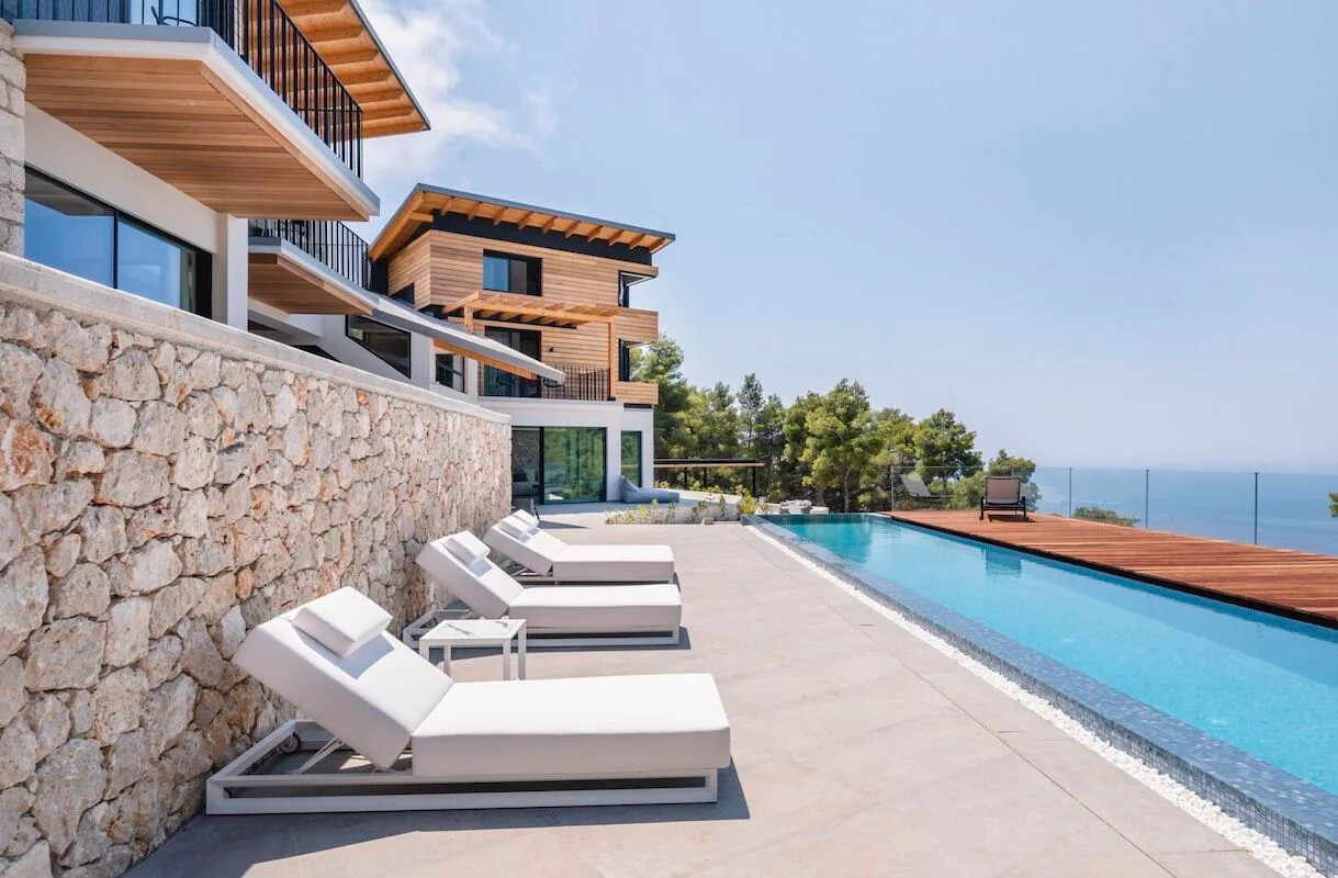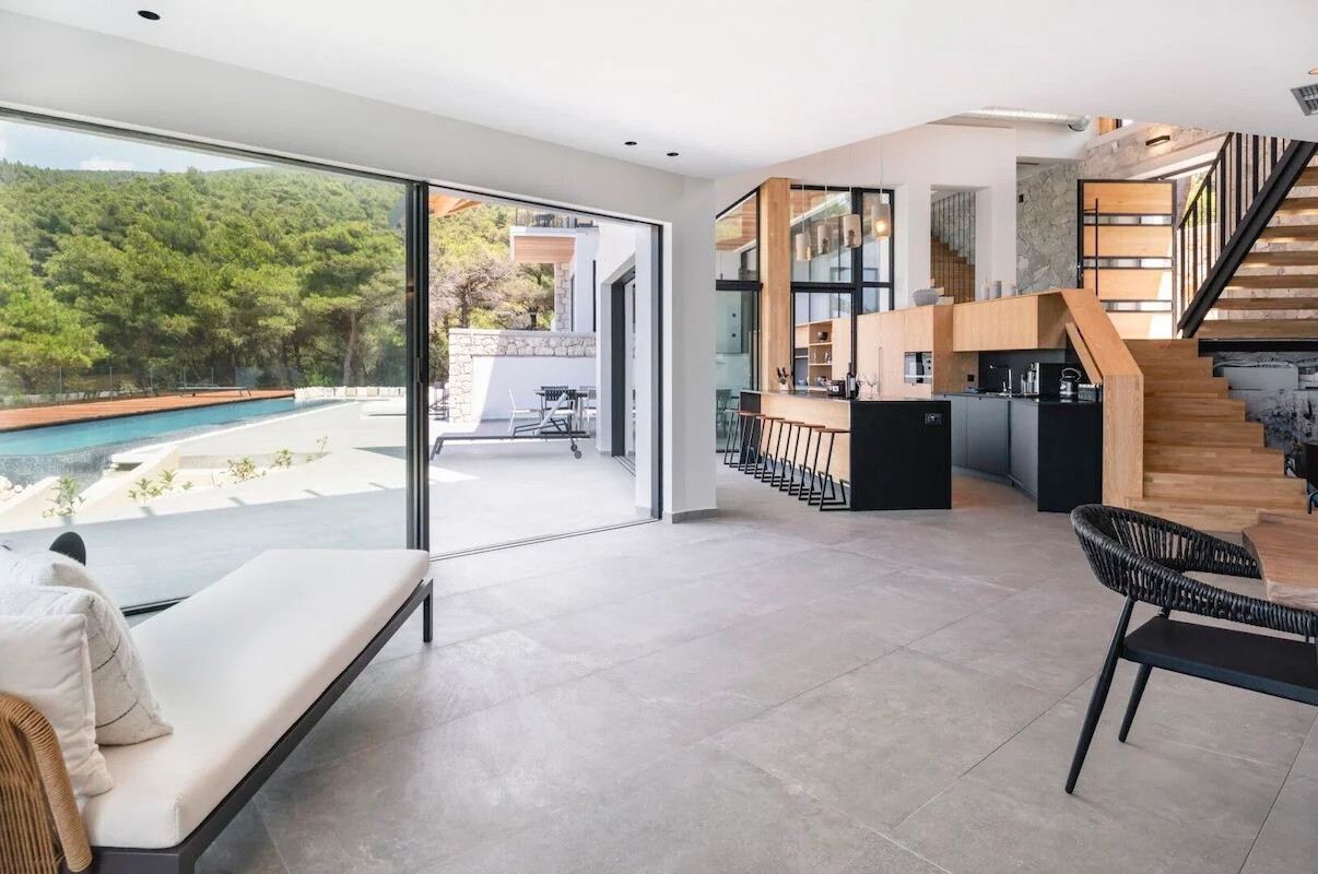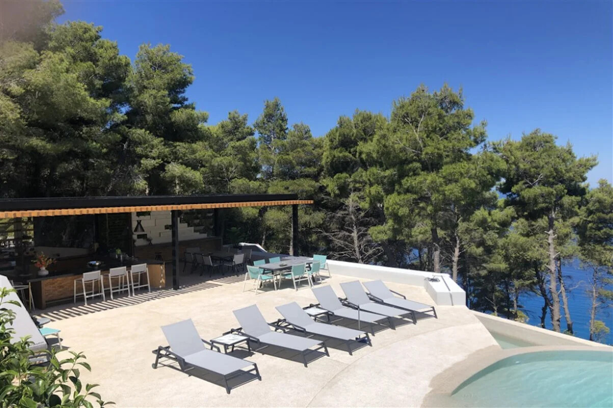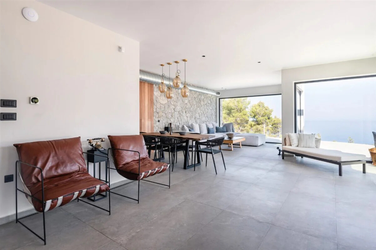 Nestled within a lush green woodland in South-Western Lefkada, this property enjoys a commanding position with unparalleled natural beauty. Its contemporary design harmoniously blends with the dramatic surroundings, using natural materials like wood and stone.