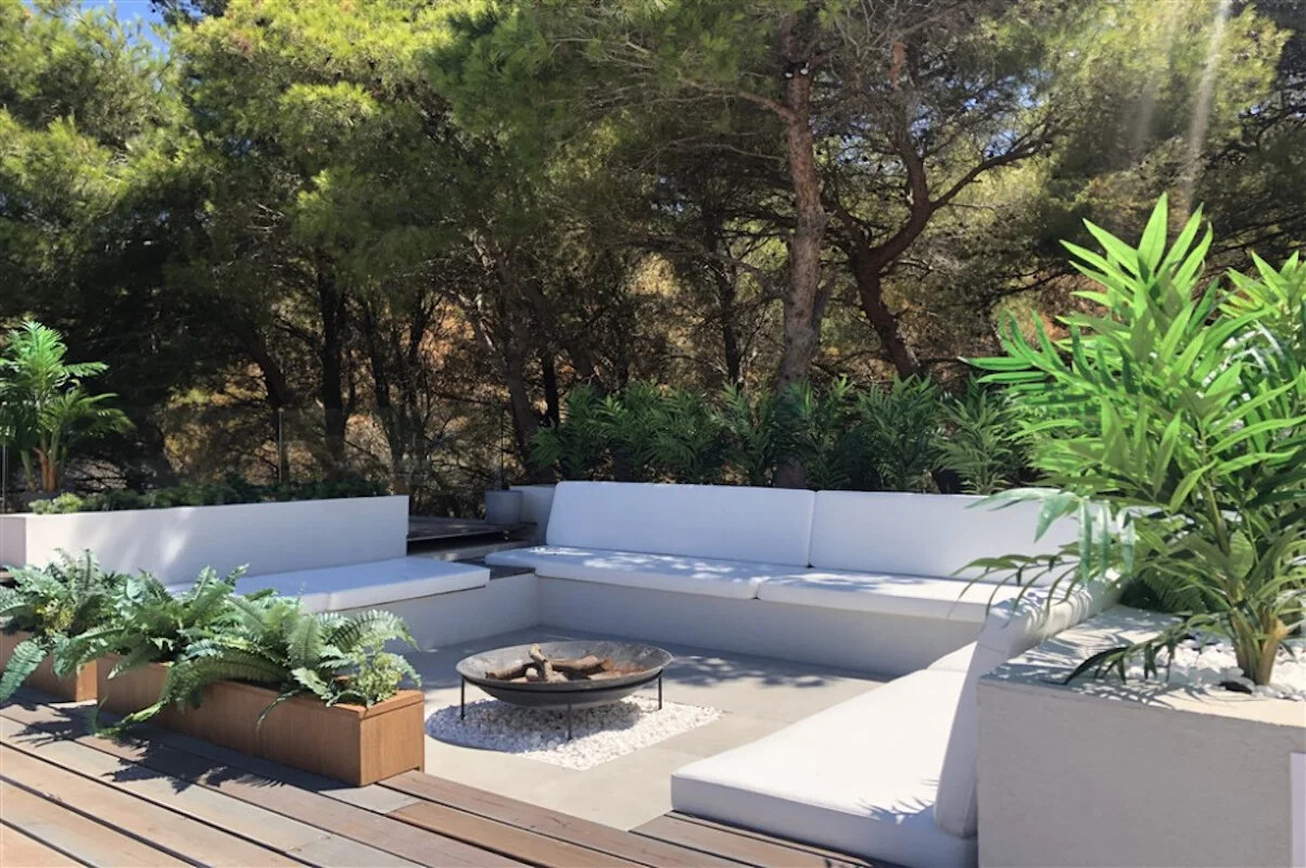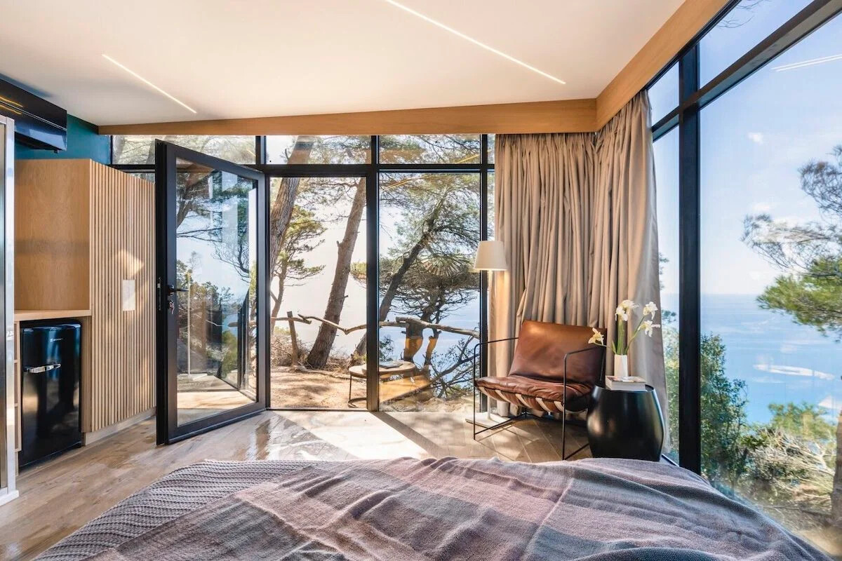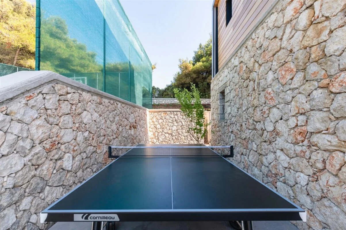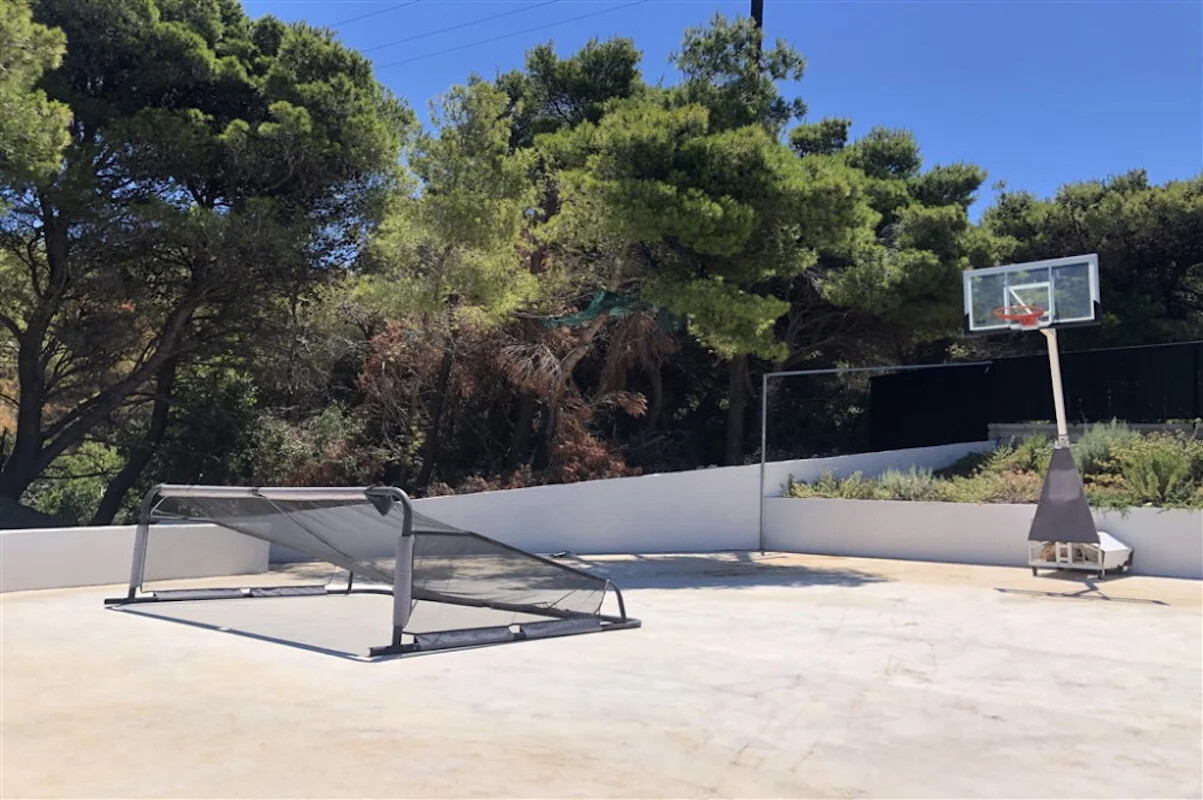 The outdoor area is equally impressive, featuring two swimming pools: a 16m-long infinity pool and a beach-like pool with a shallow end for younger swimmers. Multi-level terraces host an outdoor kitchen, shaded dining areas, a suspended sunbathing deck, a sunken living room with a fire pit, an Olympic-size trampoline, a treehouse, a sports court, table tennis, an outdoor gym, a yoga pavilion, and a magical path through fragrant woods leading to the azure sea below.