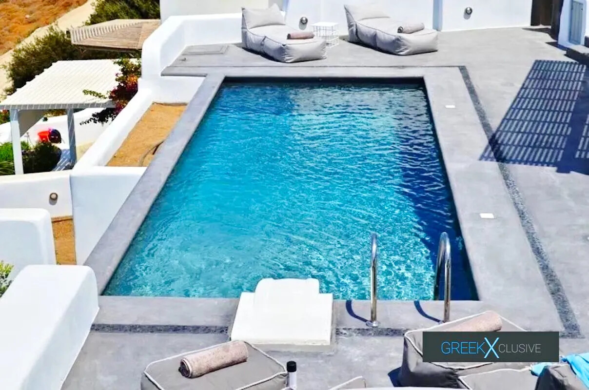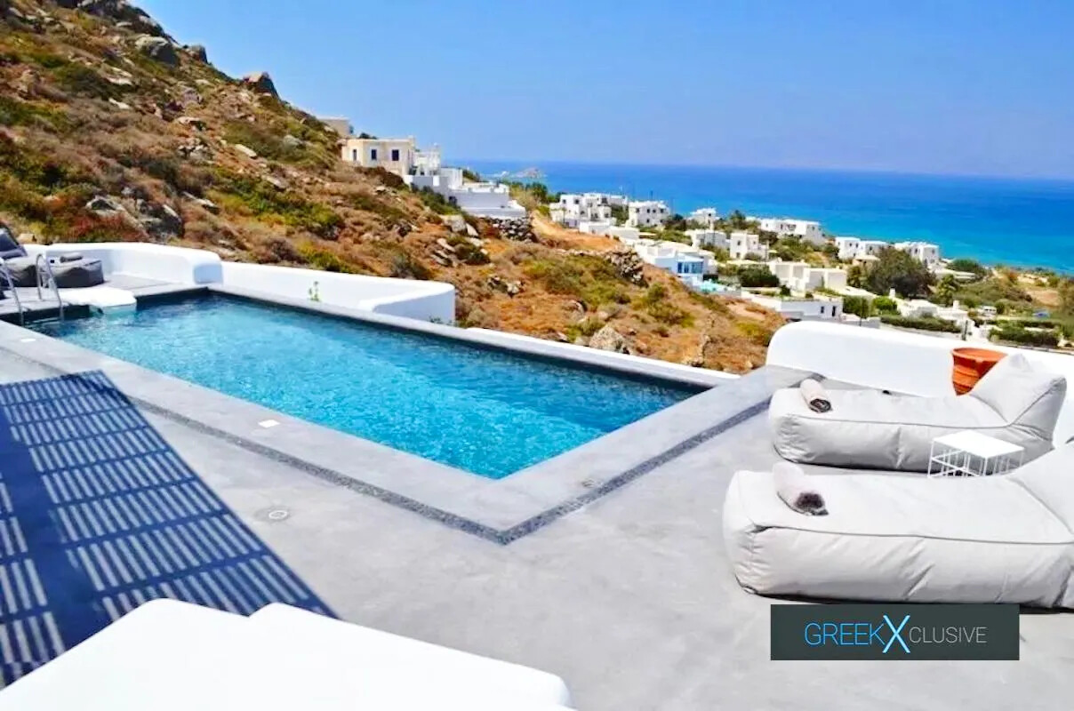 The villa’s elevated position provides an awe-inspiring, uninterrupted view of the Aegean Sea, while being only 200 meters away from one of the most picturesque beaches on the island. Despite its accessibility, the property remains a private sanctuary, making it an attractive choice for high-profile individuals and celebrities.