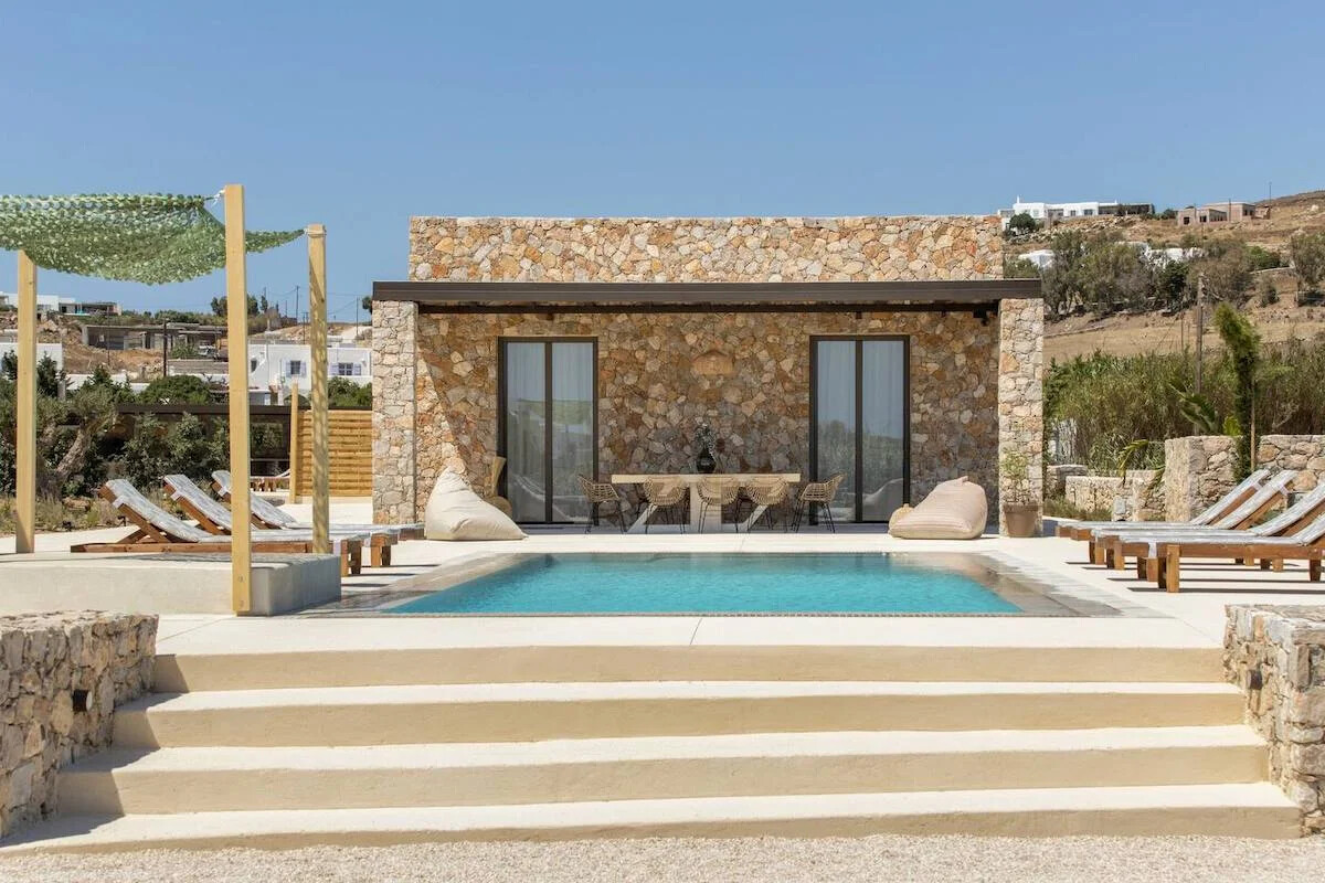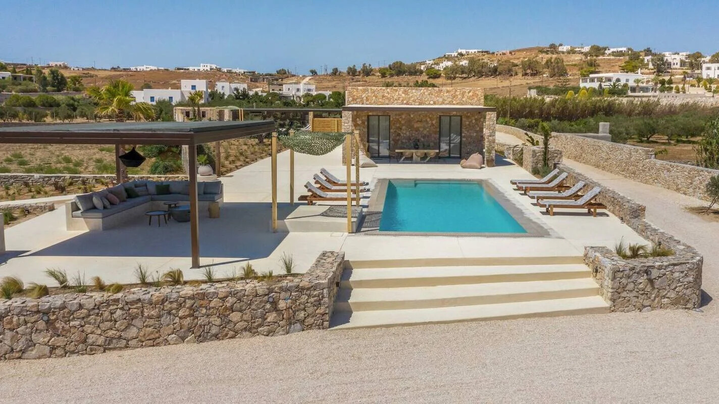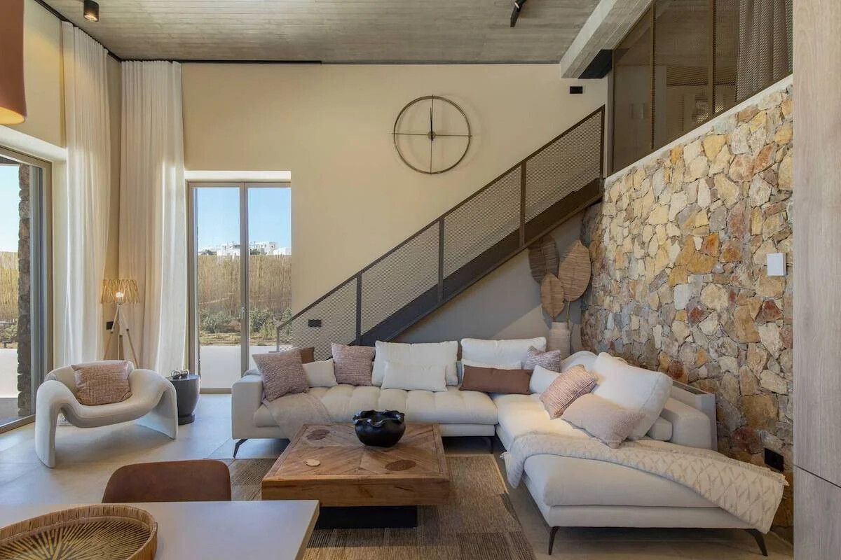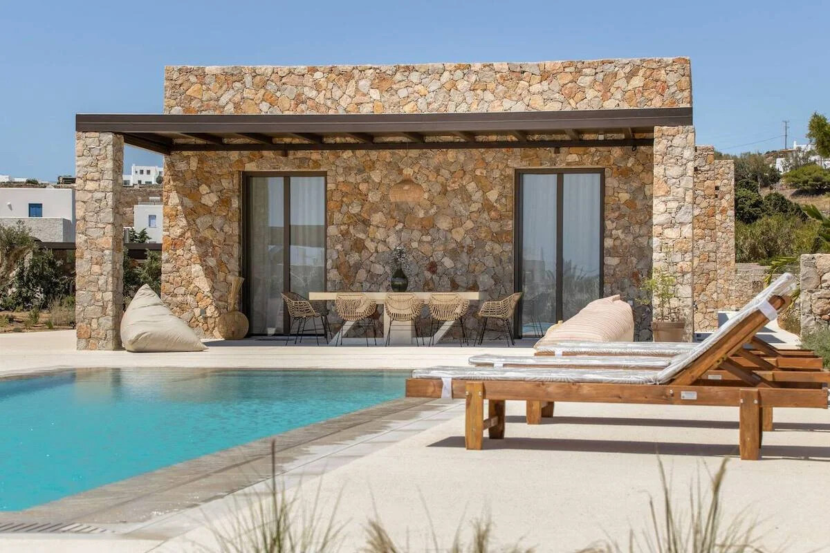 Situated on a sprawling 4,060 square meters of prime Golden Beach real estate, each villa offers a generous 220 square meters of indoor living space. Our sustainable minimalism and luxurious Eco chic Style bioclimatic villas are meticulously constructed from Paros’ native rocks within a 5-acre estate. Here, tradition seamlessly marries modern high-end architecture.