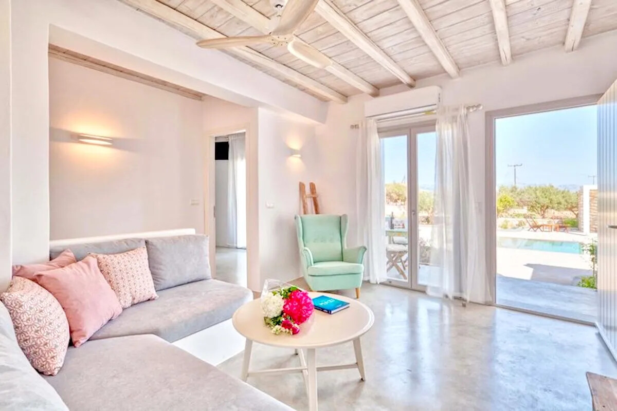 Perched above the picturesque coastline of Paros’ enchanting East side, Villa comprises three sophisticated apartments overlooking a serene saltwater pool. Gaze upon the majestic mountains of Naxos as you soak in the tranquility of this private oasis.