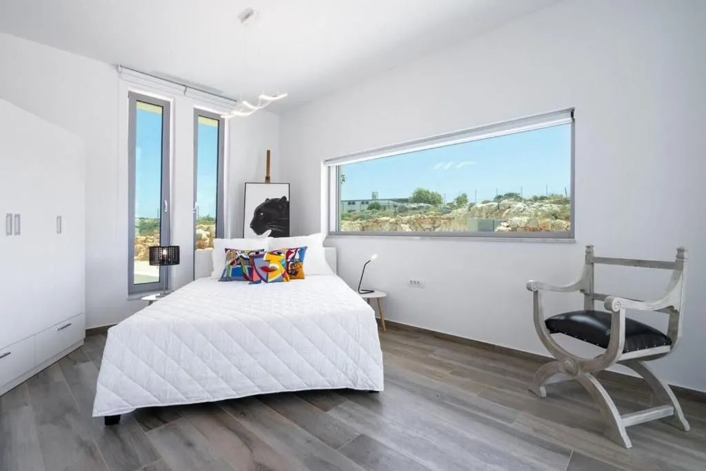 Two spacious en-suite bedrooms, each featuring floor-to-ceiling panoramic windows with uninterrupted sea views