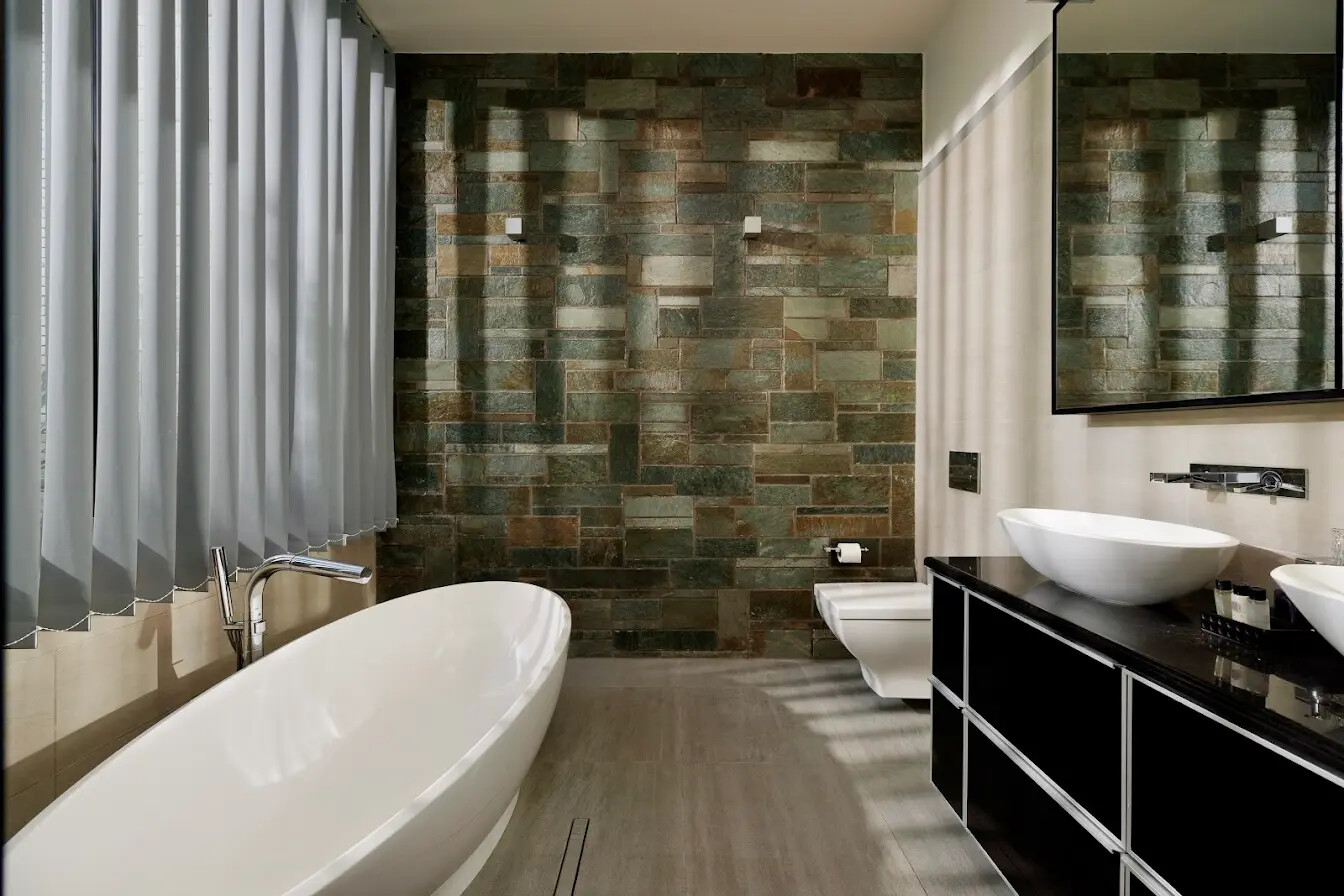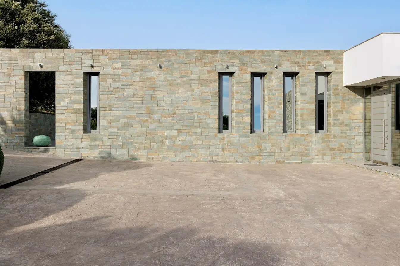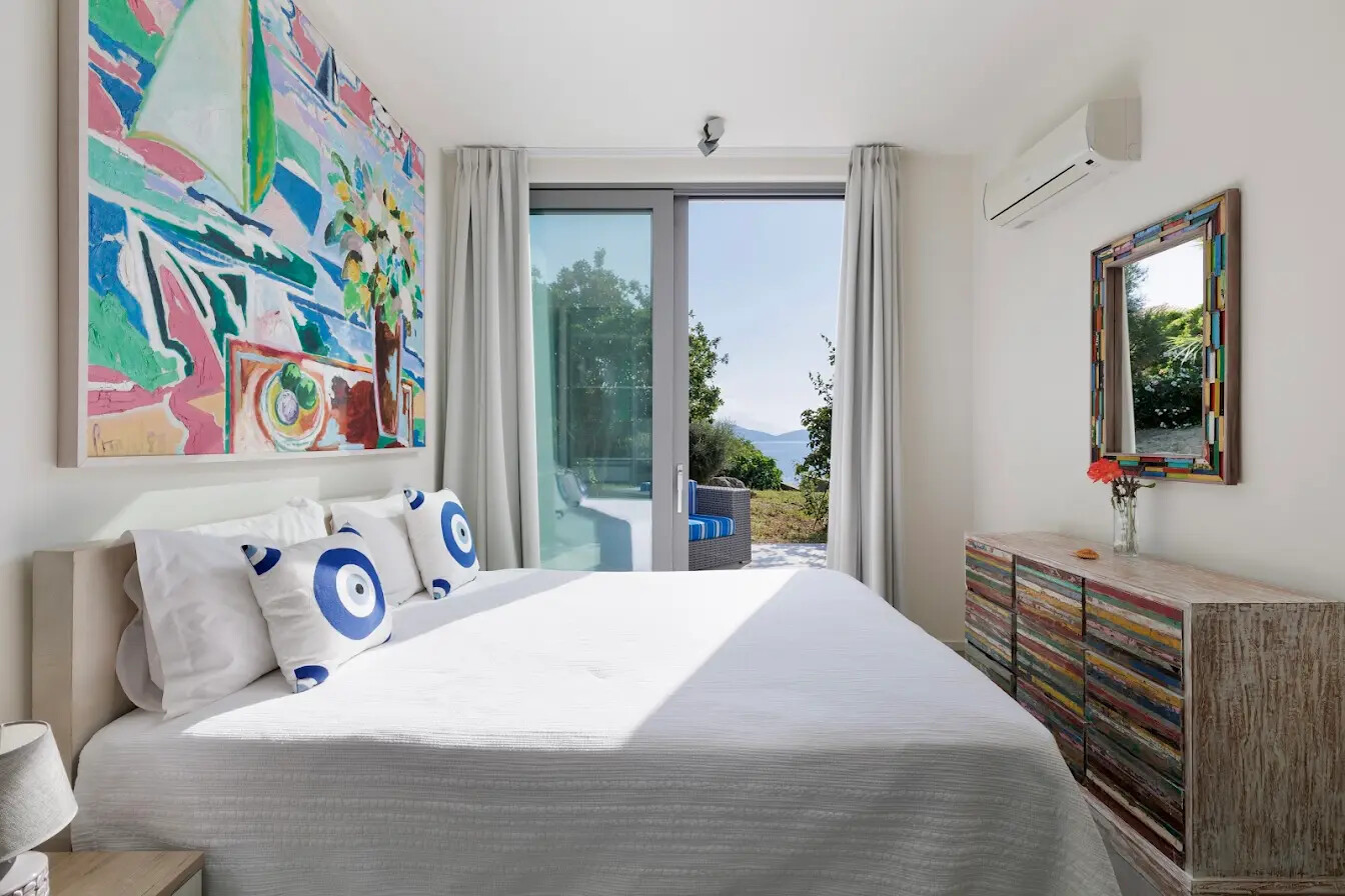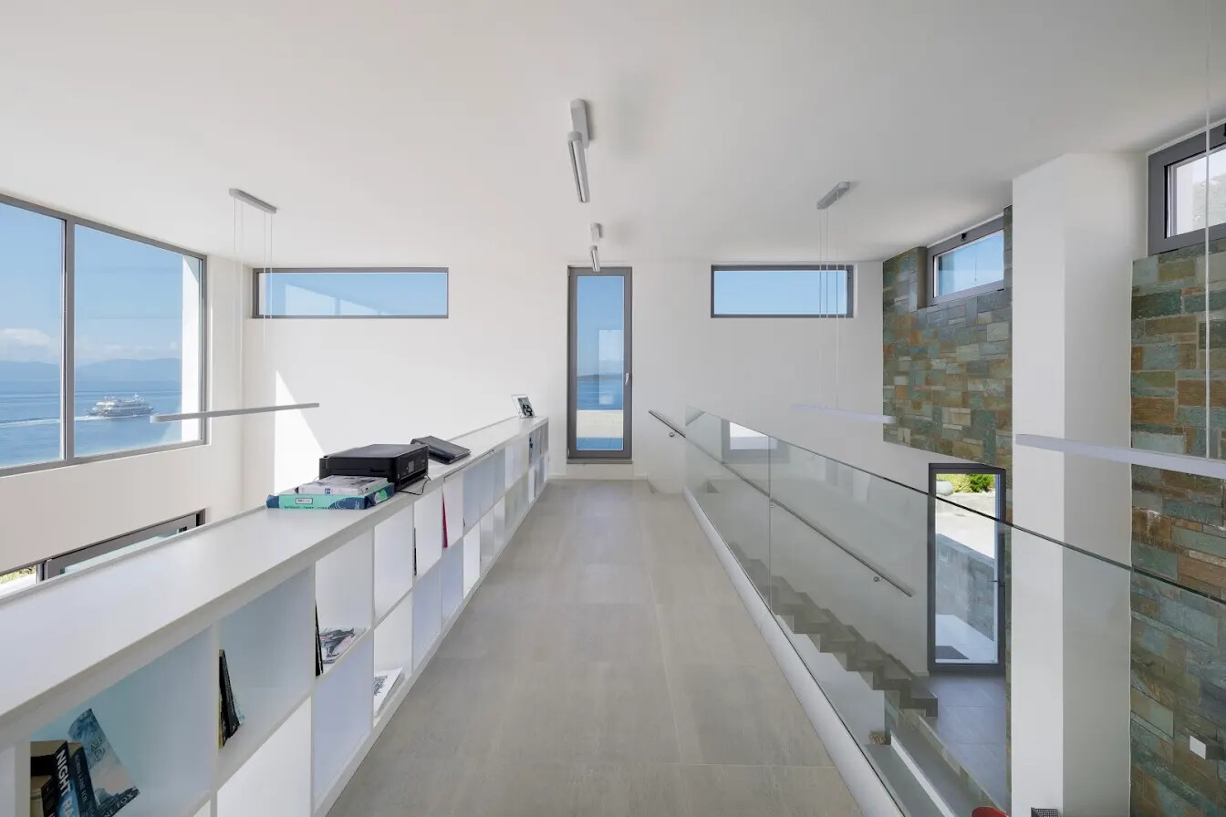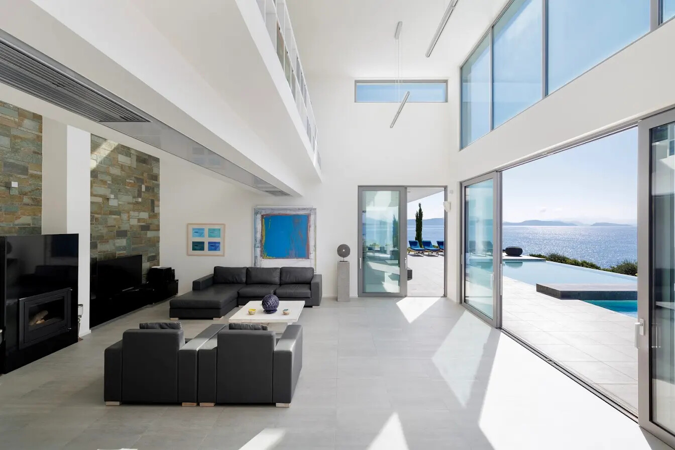 The stylish Luxury Seafront Villa for Sale Lefkada Syvota provides a peaceful and secluded haven with airy interiors illuminated by natural light and soaring ceilings. The open-concept design encompasses a kitchen, dining room, and living room with double-height windows that showcase awe-inspiring vistas. The residence boasts five bedrooms and six bathrooms, outfitted with modern conveniences in an idyllic setting.