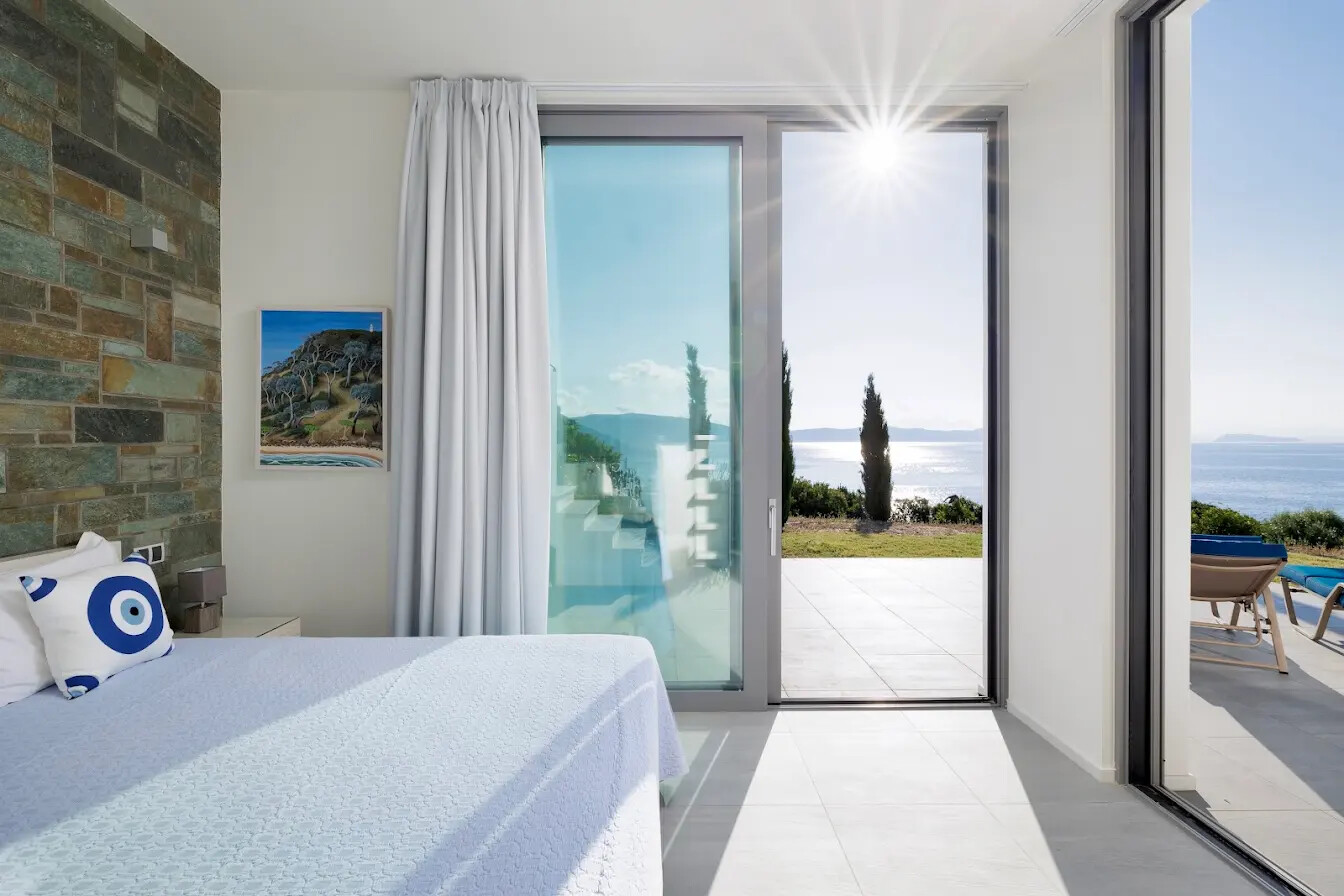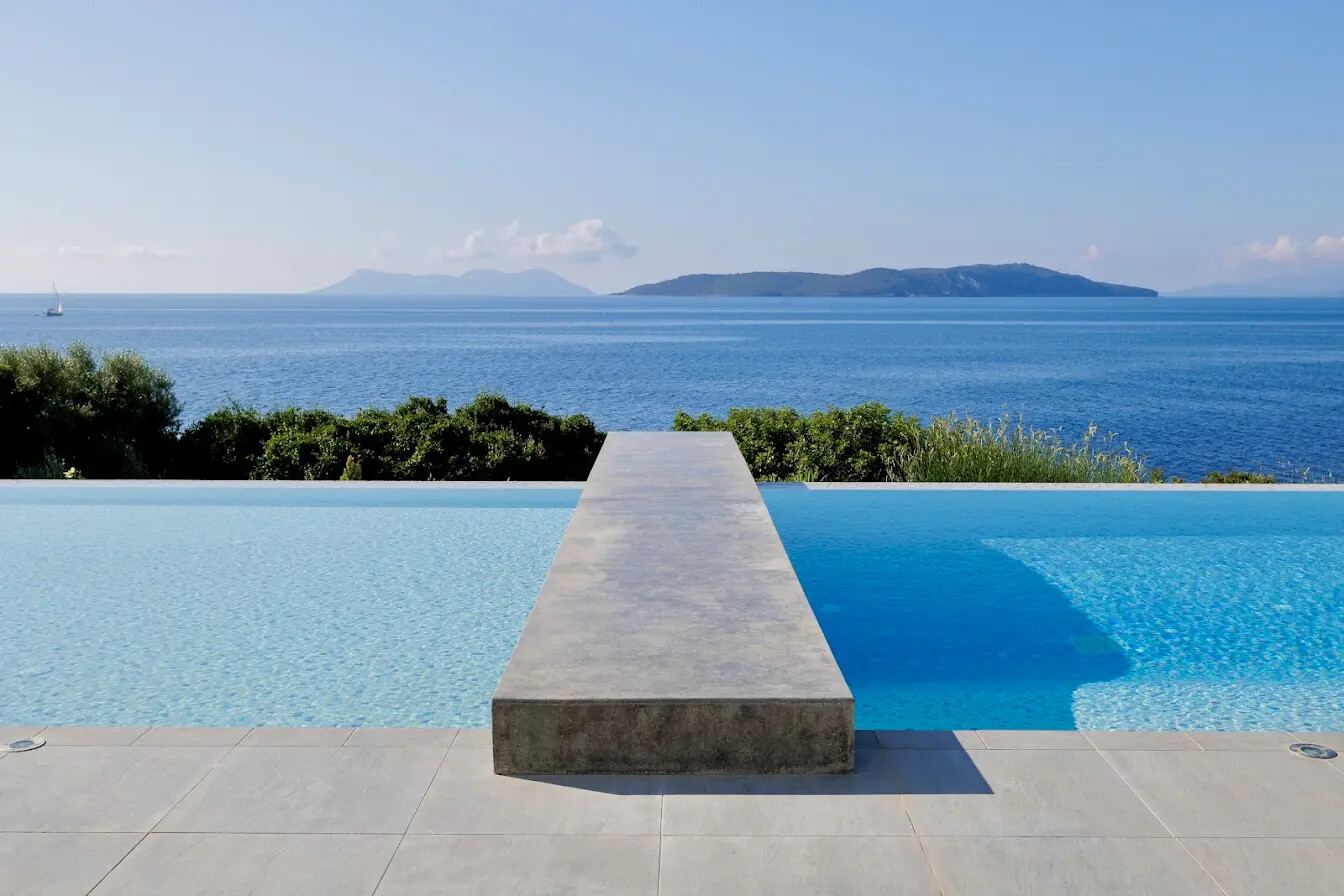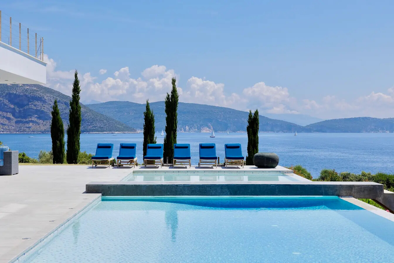 Discover Luxury Seafront Villa for Sale Lefkada Syvota, a rare waterfront home offering views of crystal clear waters and stunning Mediterranean scenery. With steps leading from the pool directly onto the sea, the water is so close you can hear the waves gently rolling onto the shore.