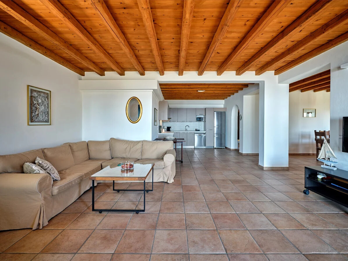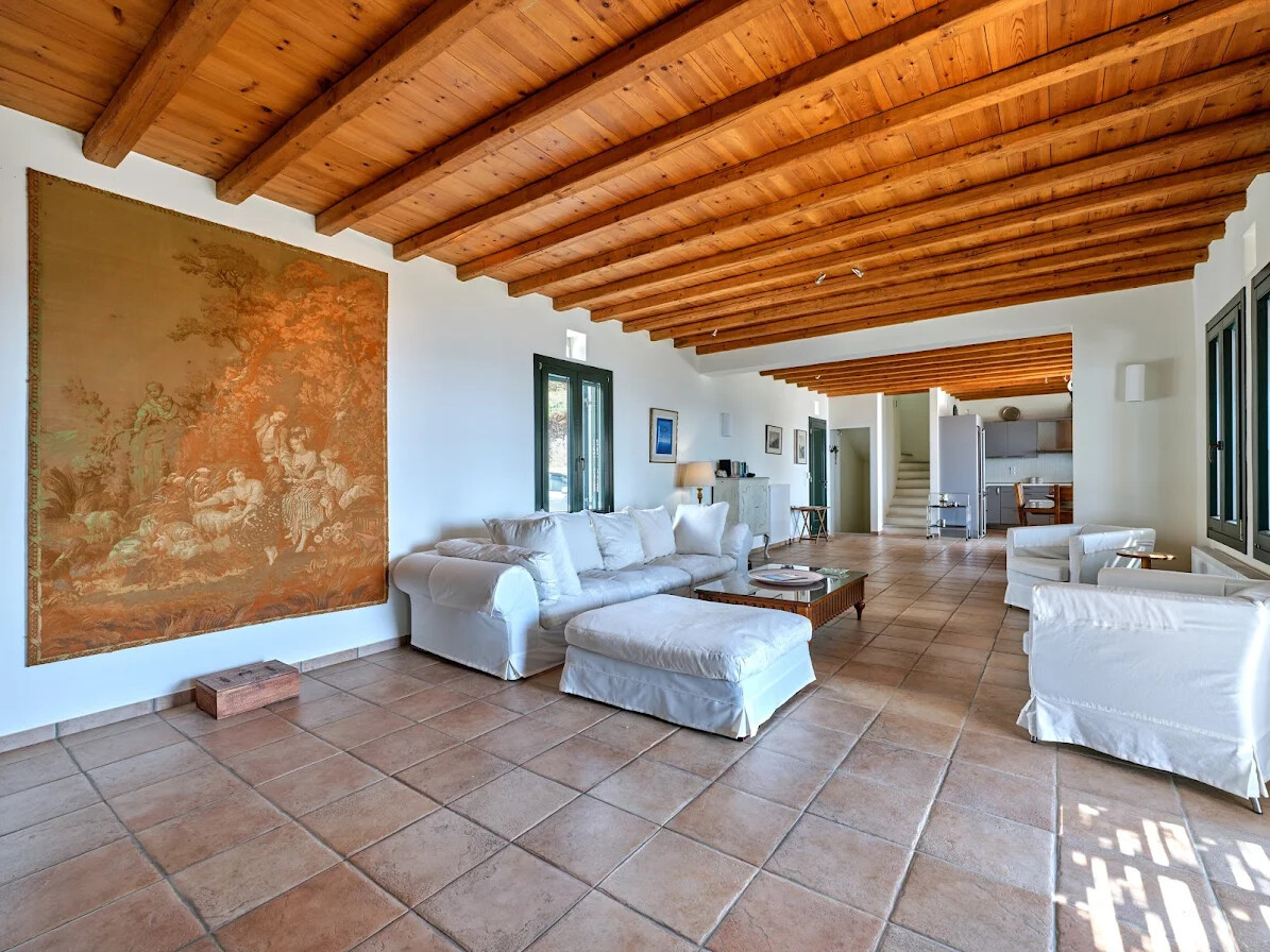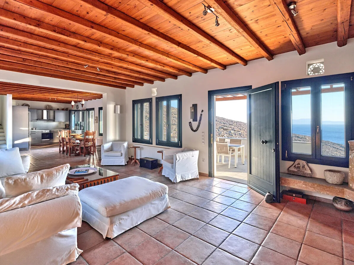 The villa’s interior features an open-plan layout that incorporates spacious living and dining areas, complemented by a fully equipped kitchen. The design highlights traditional elements, including wooden beams on the ceilings and flagstone flooring, which add warmth and character to the space. Large picture windows and doors create a seamless connection with the stunning natural surroundings, allowing breathtaking sea views to be enjoyed from every corner of the home.