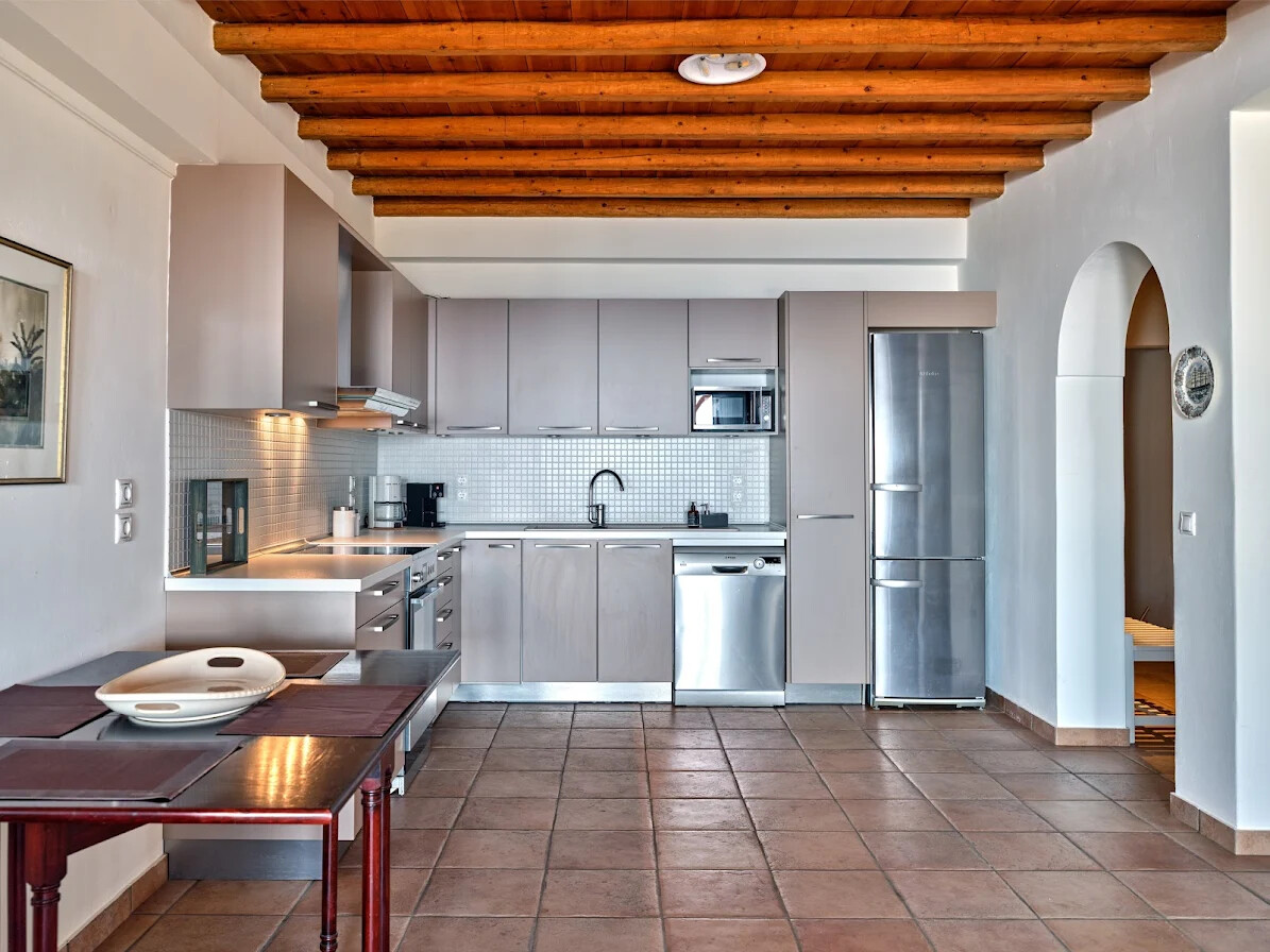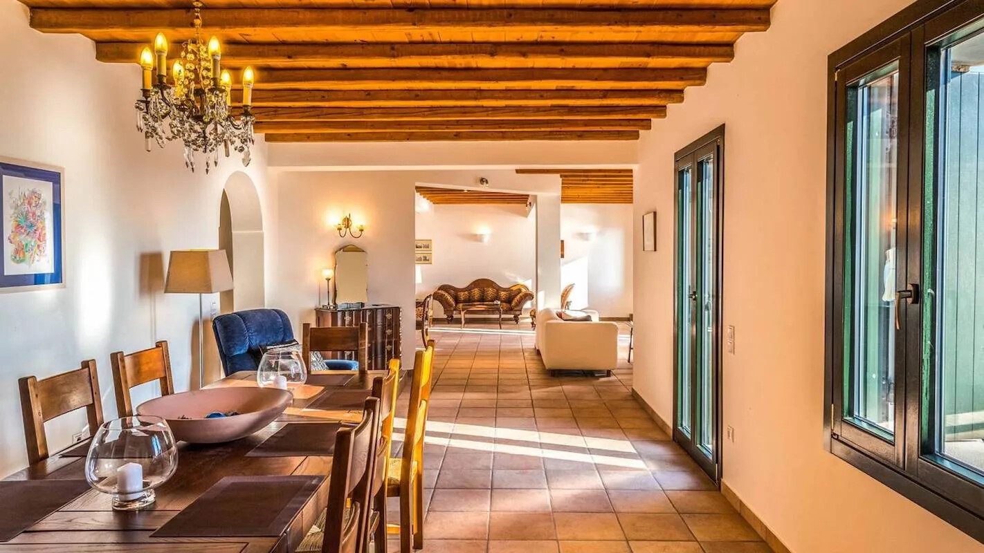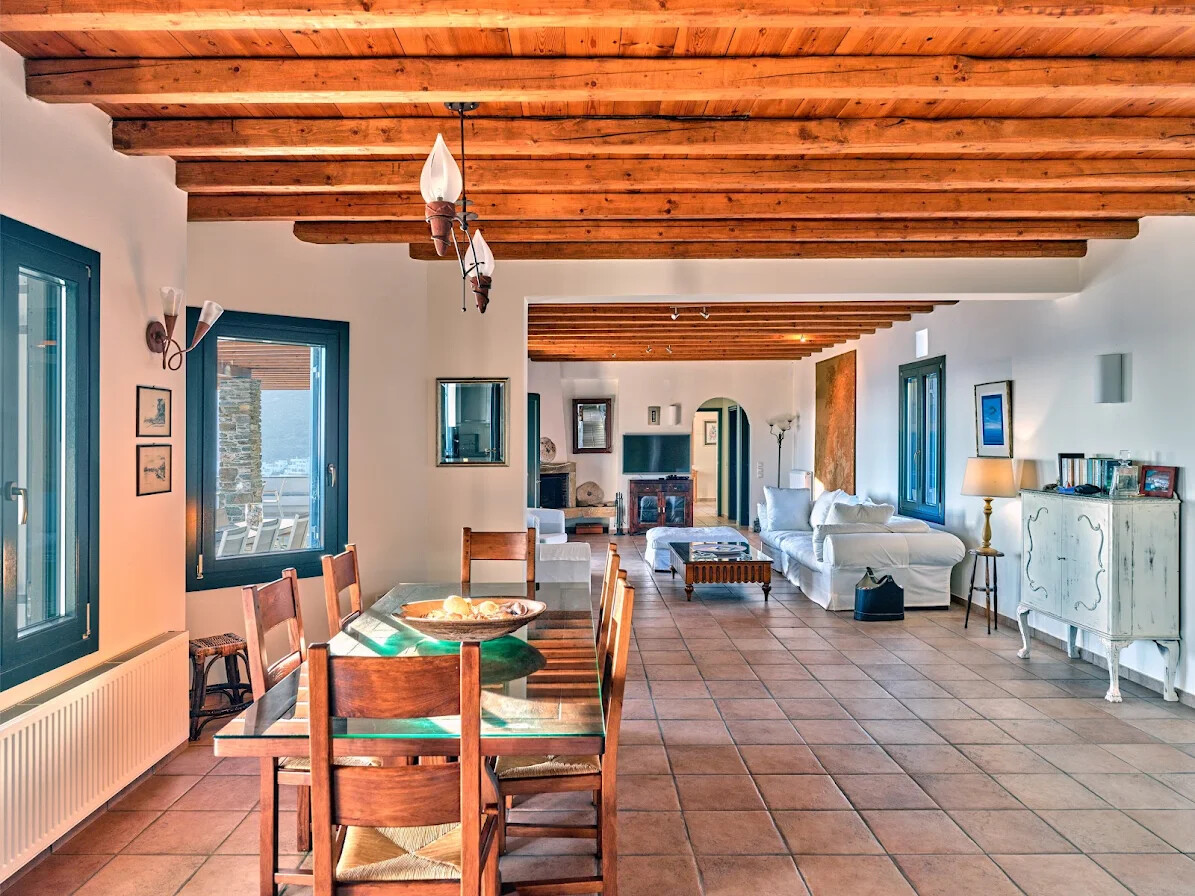The villa’s interior features an open-plan layout that incorporates spacious living and dining areas, complemented by a fully equipped kitchen. The design highlights traditional elements, including wooden beams on the ceilings and flagstone flooring, which add warmth and character to the space. Large picture windows and doors create a seamless connection with the stunning natural surroundings, allowing breathtaking sea views to be enjoyed from every corner of the home.