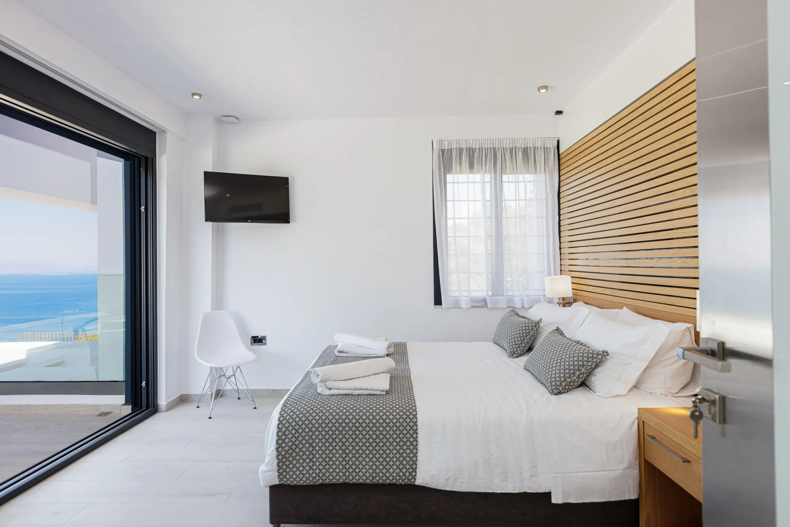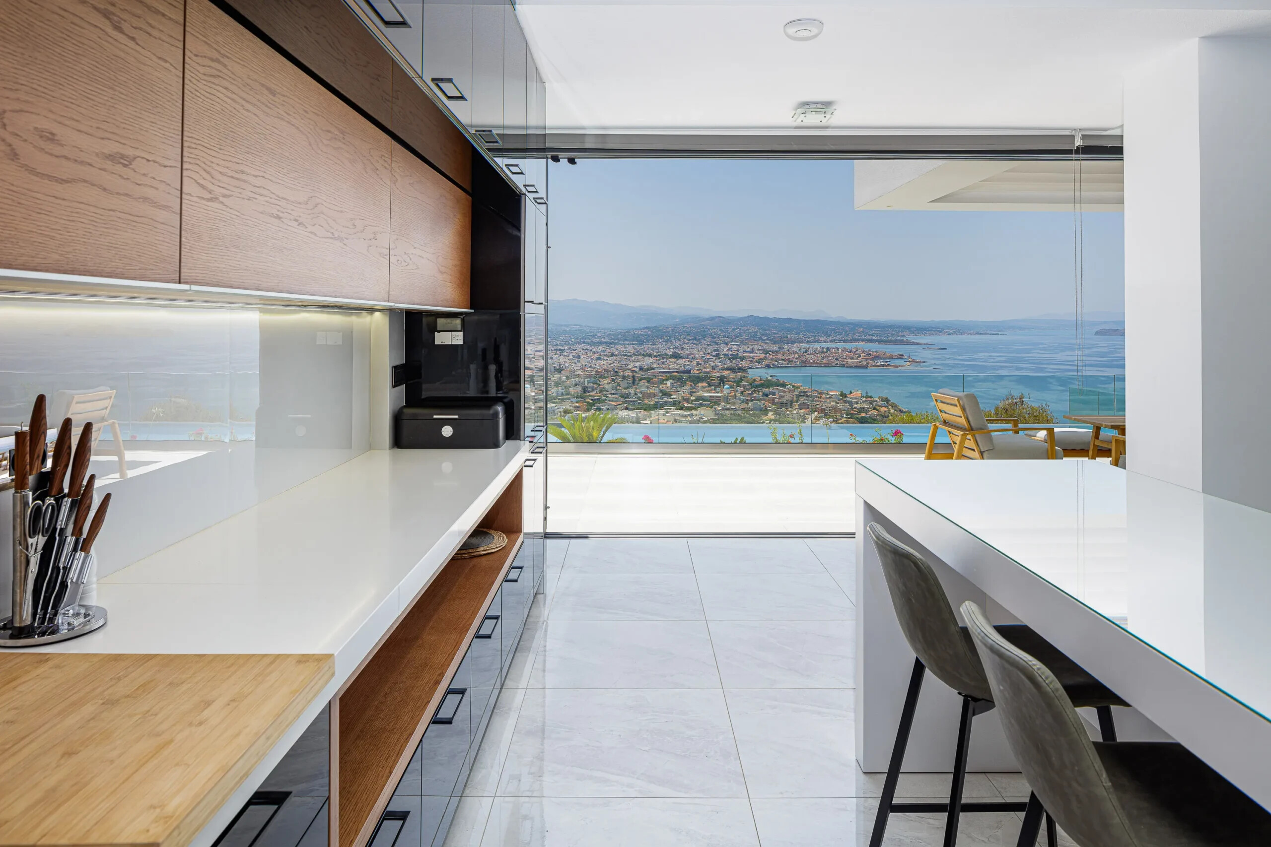 Ground Floor – Open-plan living and dining area with floor-to-ceiling glass doors, offering uninterrupted sea views and direct pool access; fully equipped modern kitchen; guest WC.