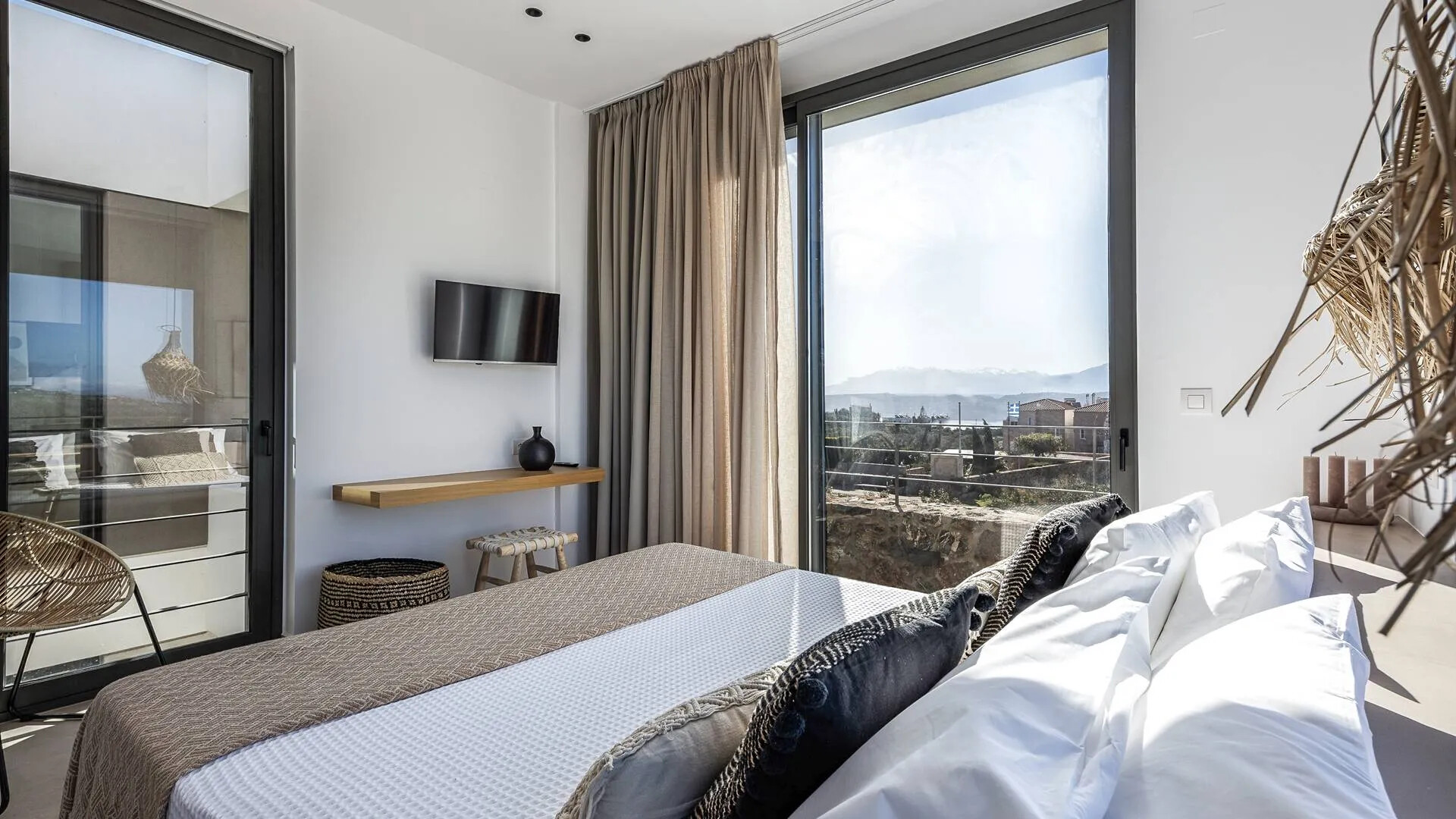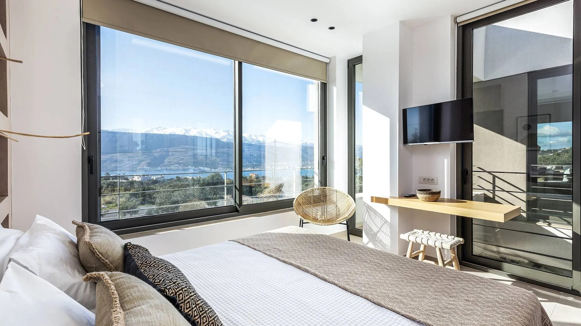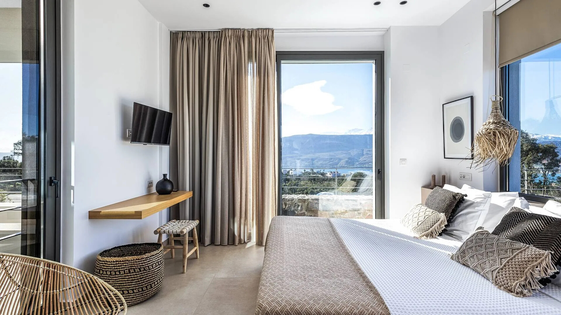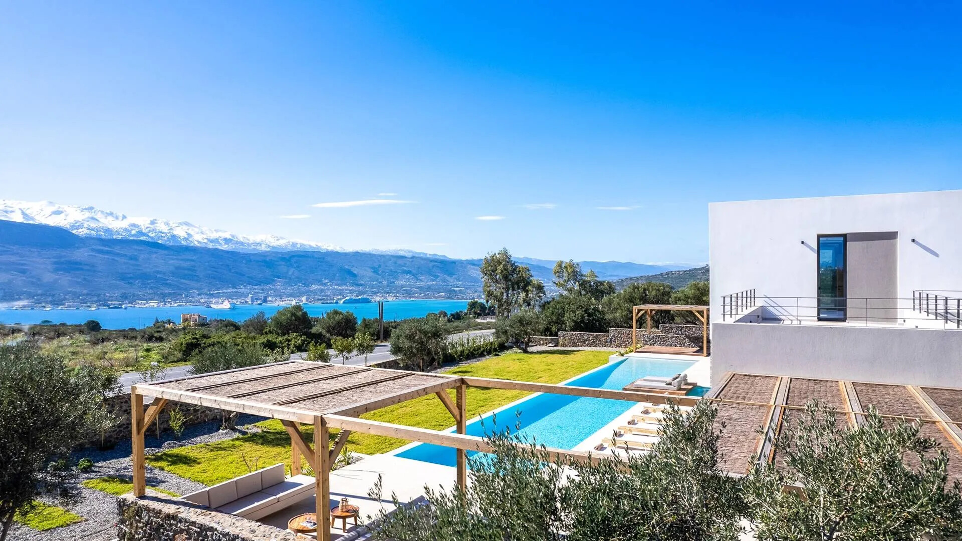 Nestled on the scenic hillsides of Akrotiri overlooking the breathtaking Souda Bay, this newly constructed luxury villa (built in 2022) is a rare coastal gem. Blending modern architecture with Boho-chic interior design, this upscale residence offers uninterrupted views of the White Mountains and the Aegean Sea, with glass facades flooding the interiors with light and elegance.