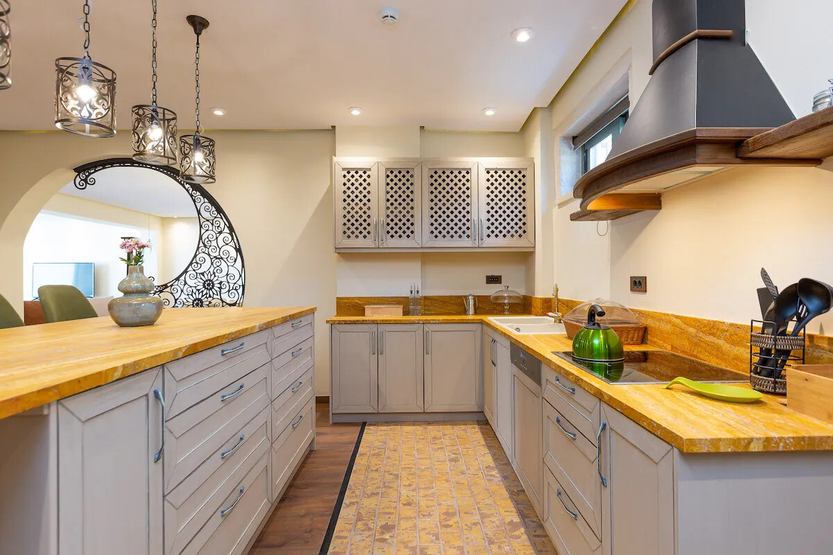 -Fully equipped kitchen with island counter and tall stools and built-in Miele appliances. In the kitchen, guests can find two wine coolers as well and they can choose local wines from our Wine selection with an additional charge.