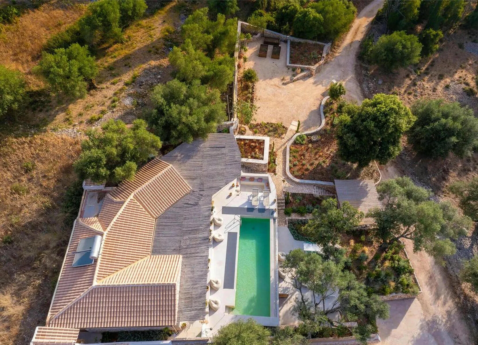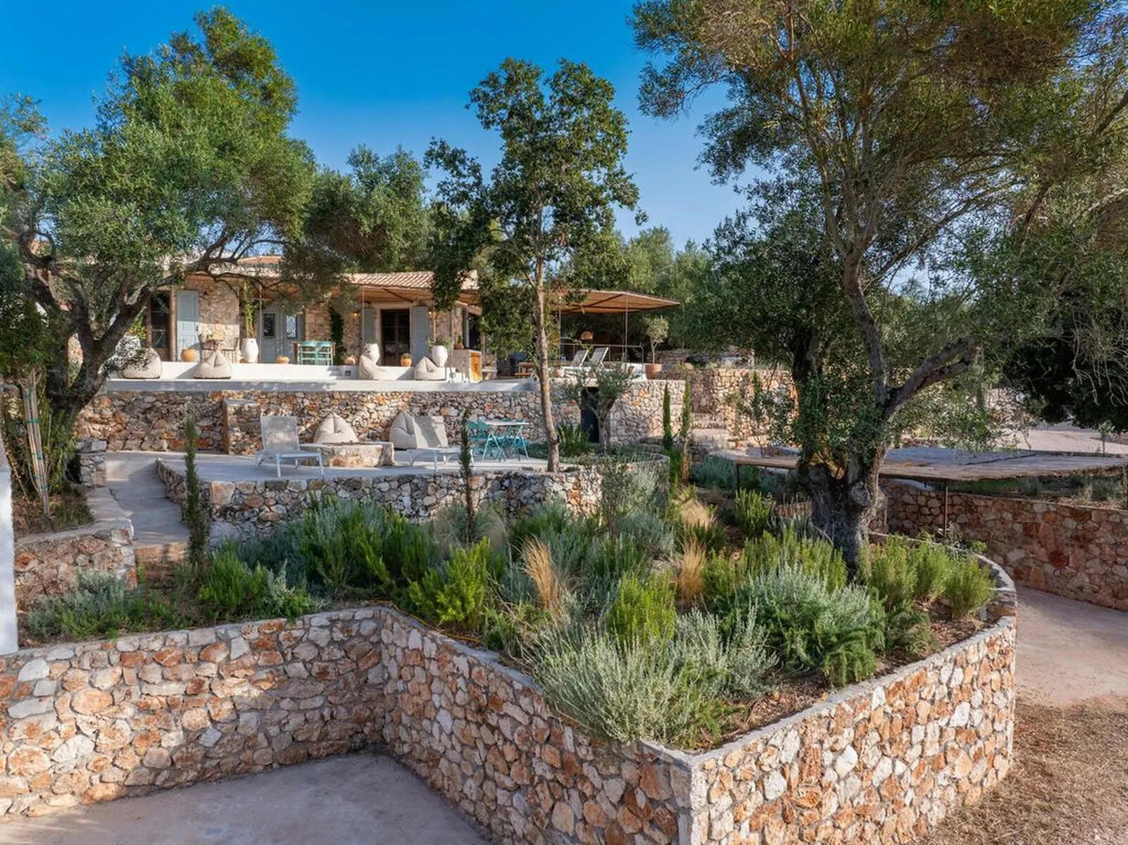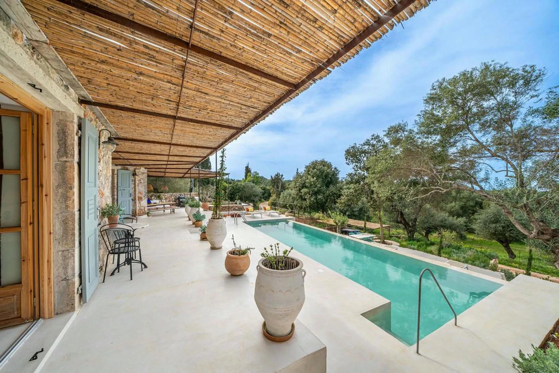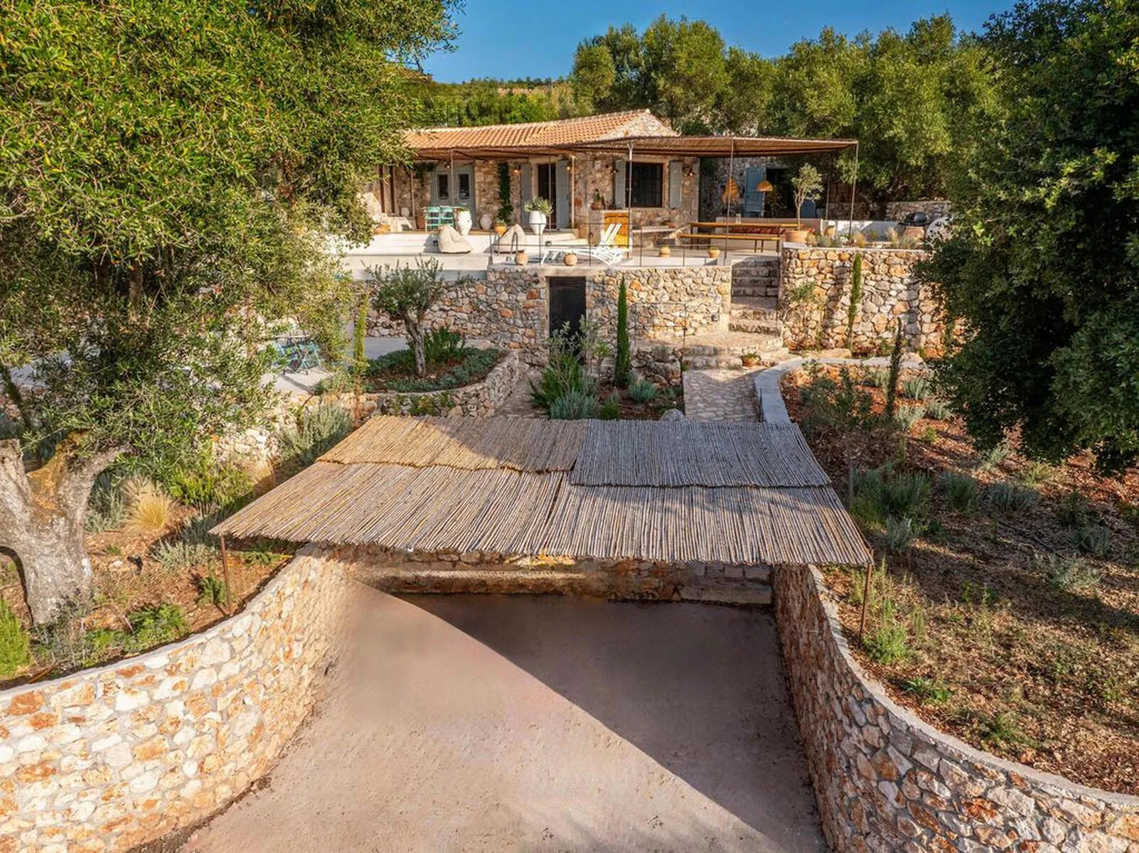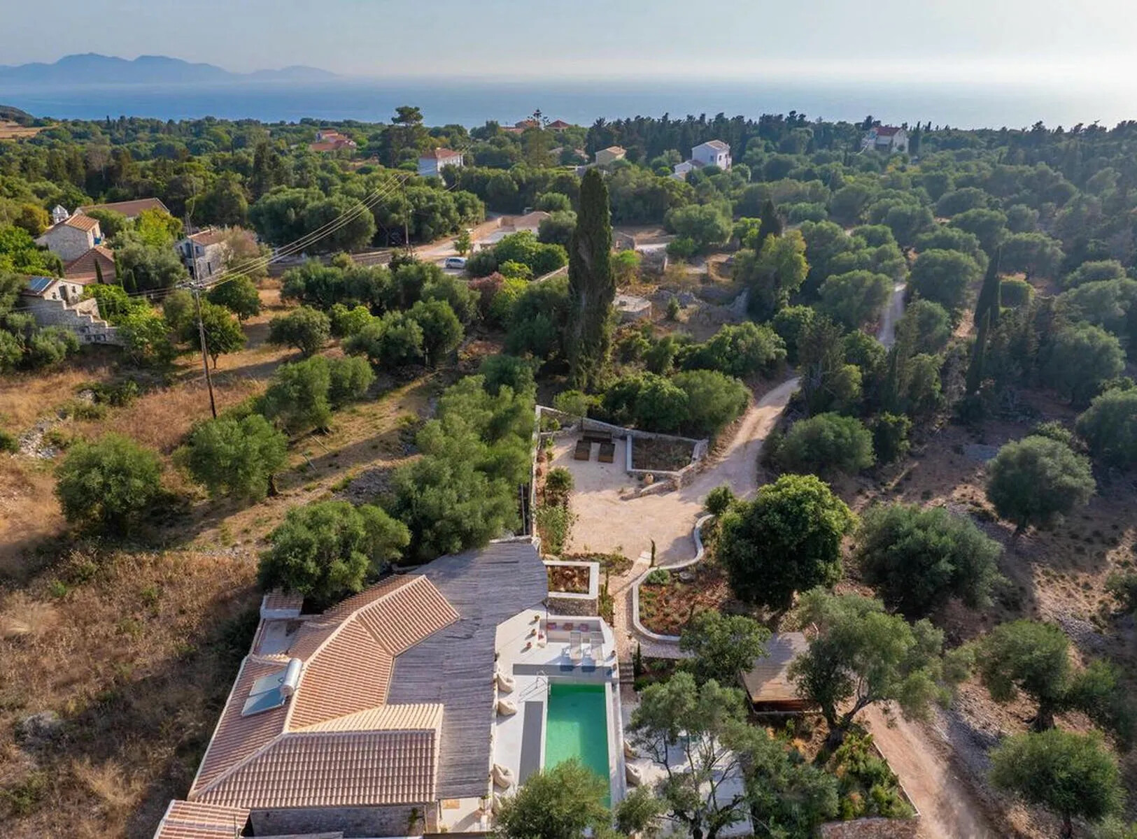 The property is surrounded by olive groves and lush forests, offering uninterrupted views of the sea and the peaceful countryside. The sounds of goats and the gentle tolling of their bells complete the serene ambiance of the villa.