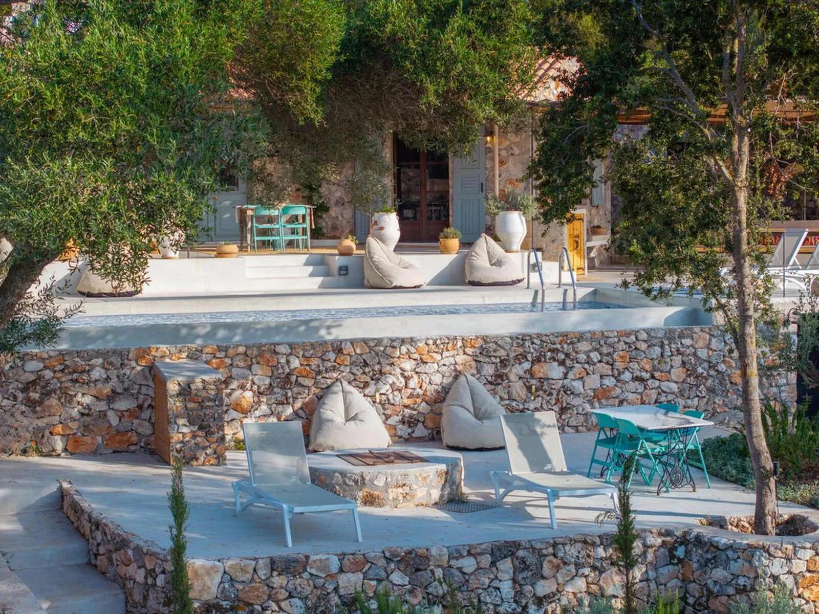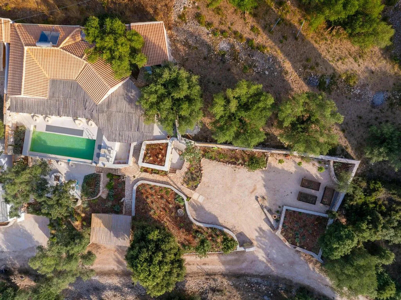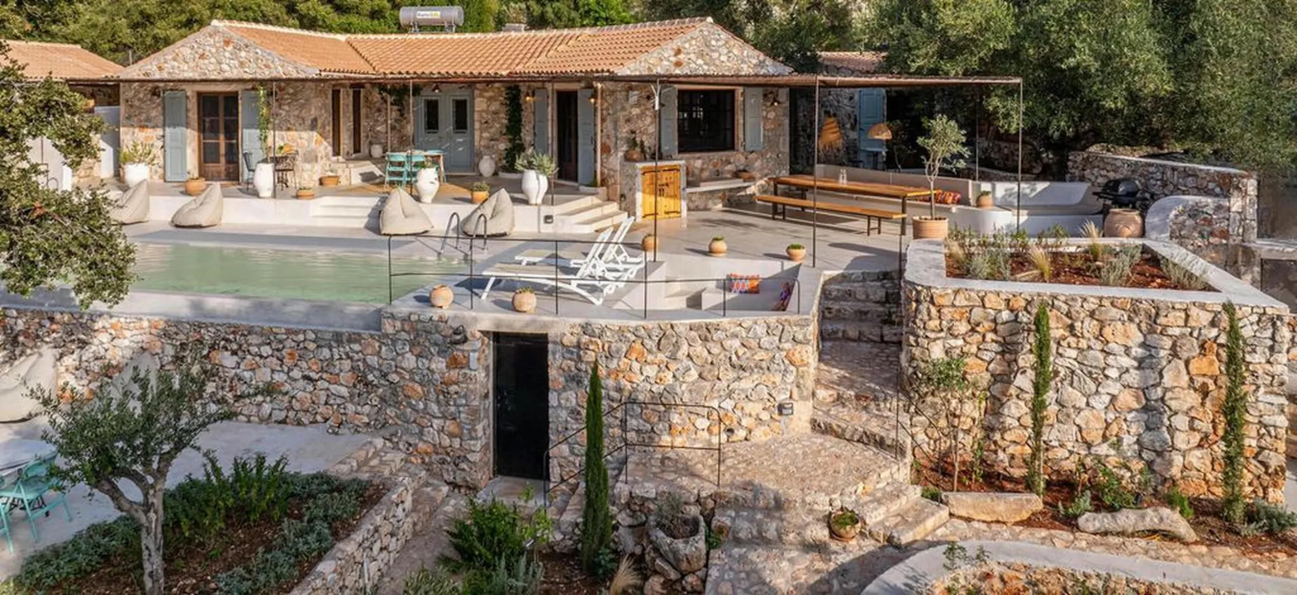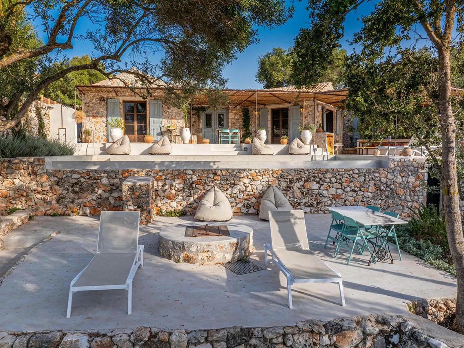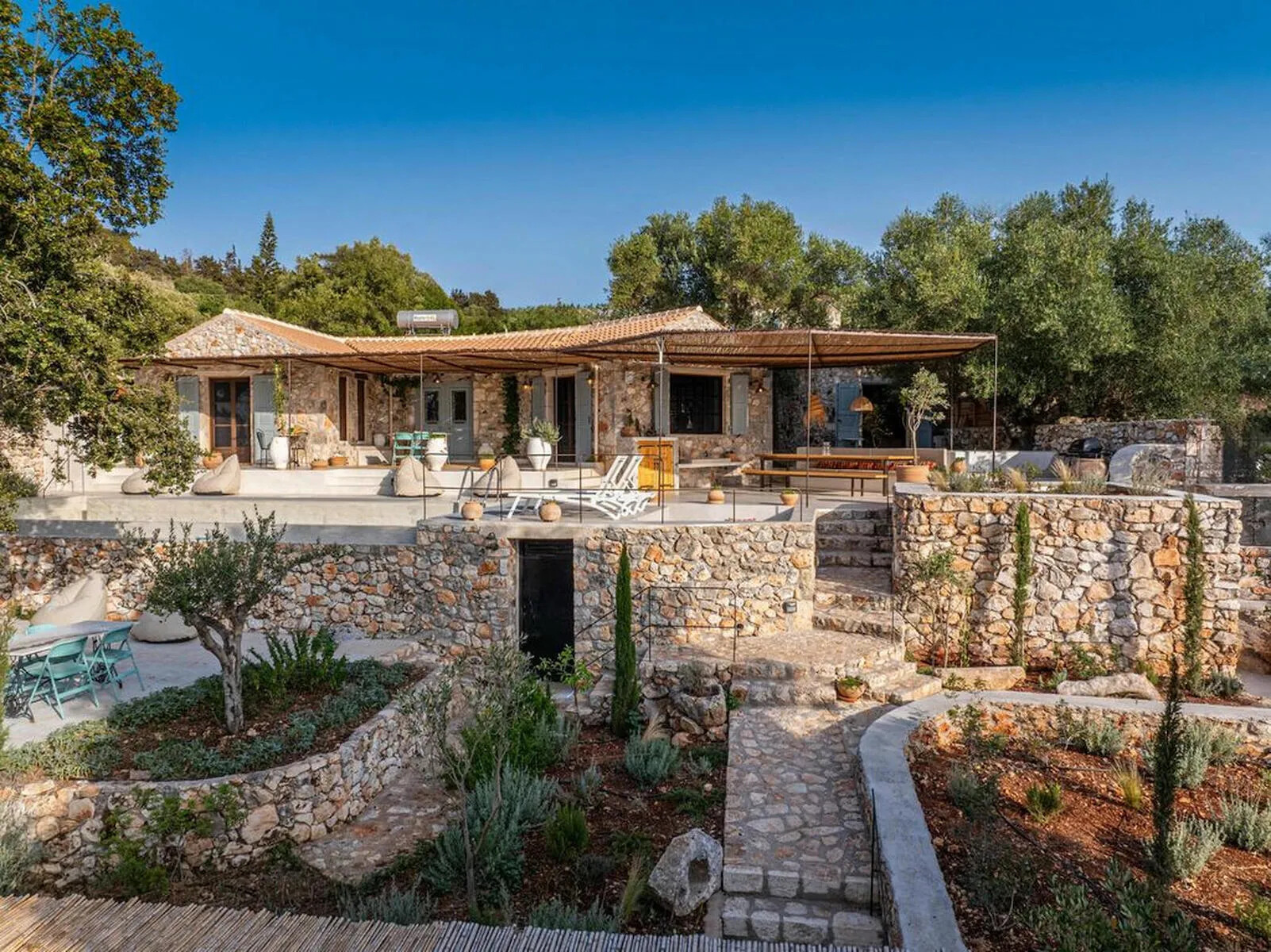 The property is surrounded by olive groves and lush forests, offering uninterrupted views of the sea and the peaceful countryside. The sounds of goats and the gentle tolling of their bells complete the serene ambiance of the villa.