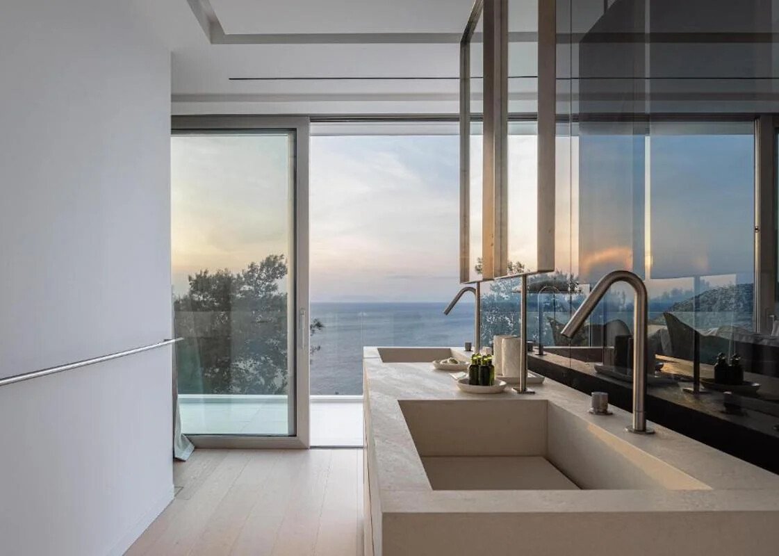 The third level is dedicated to the main bedroom, featuring unparalleled sea views, quality linens, and modern interiors, complemented by two walk-in closets. Three additional bedrooms, each with its own ensuite bathroom, stand ready to welcome guests in comfort.