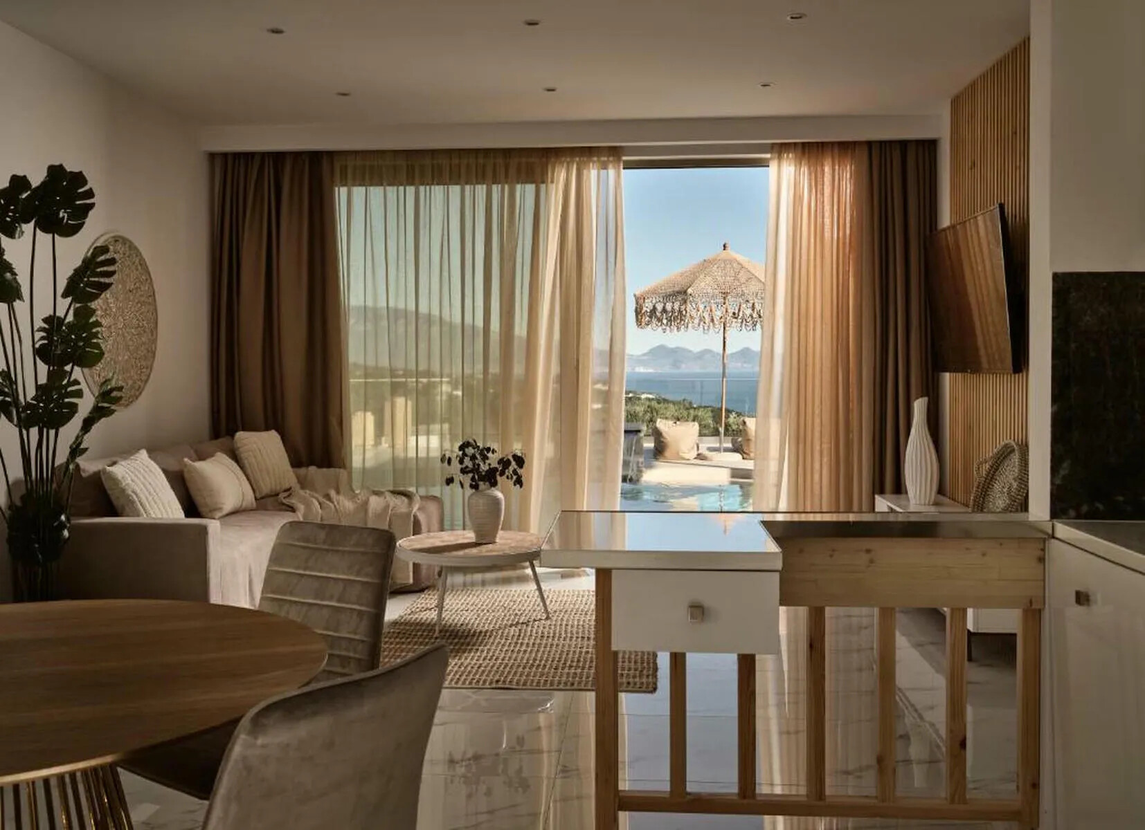 Spacious, sunlit living room with sea views, ideal for unwinding